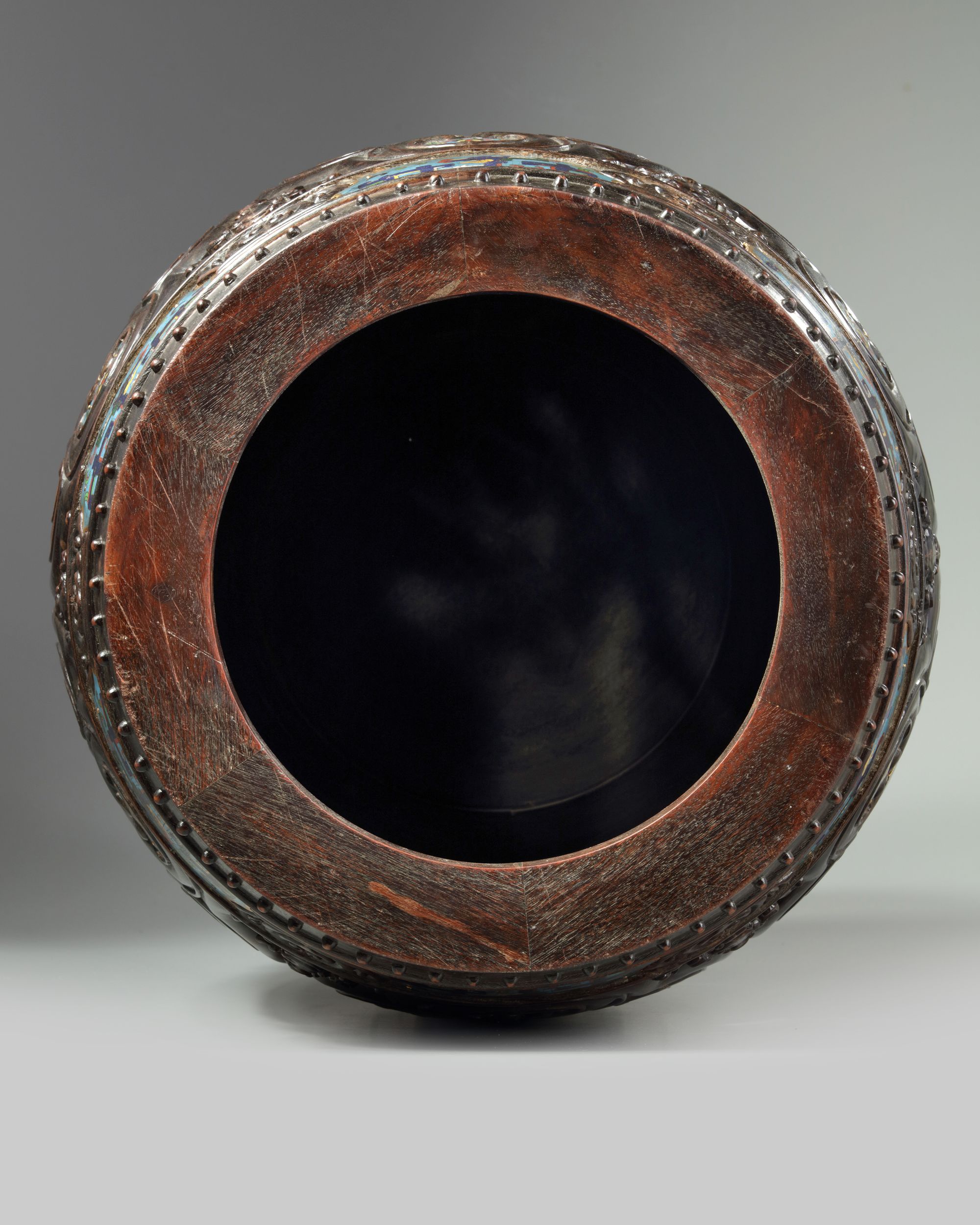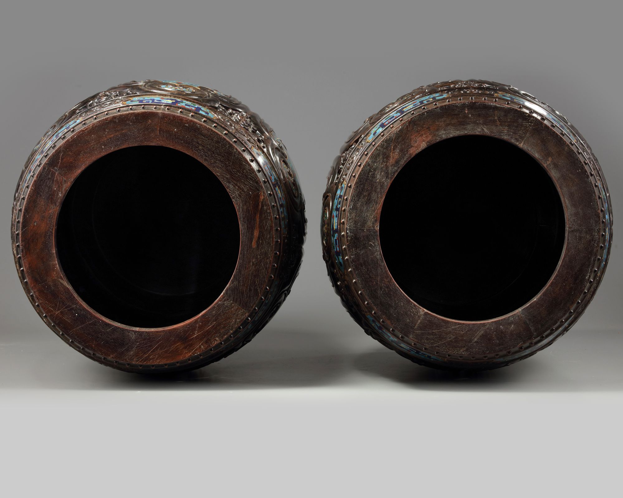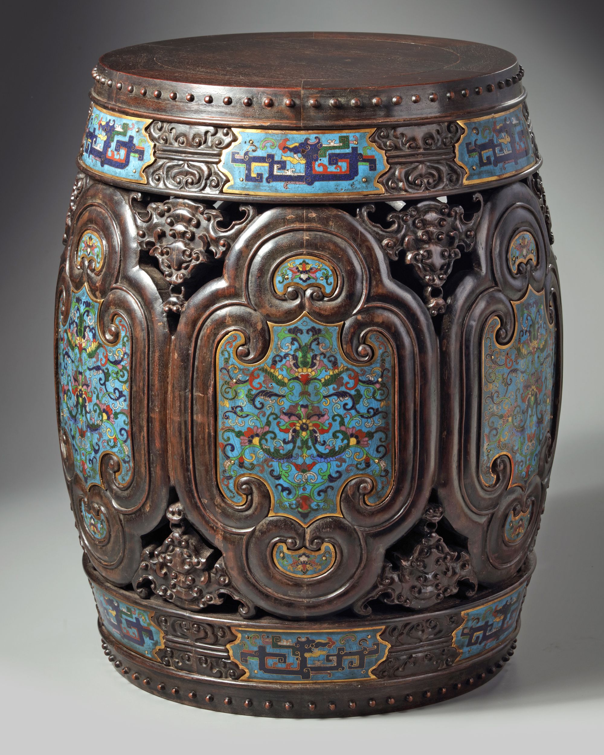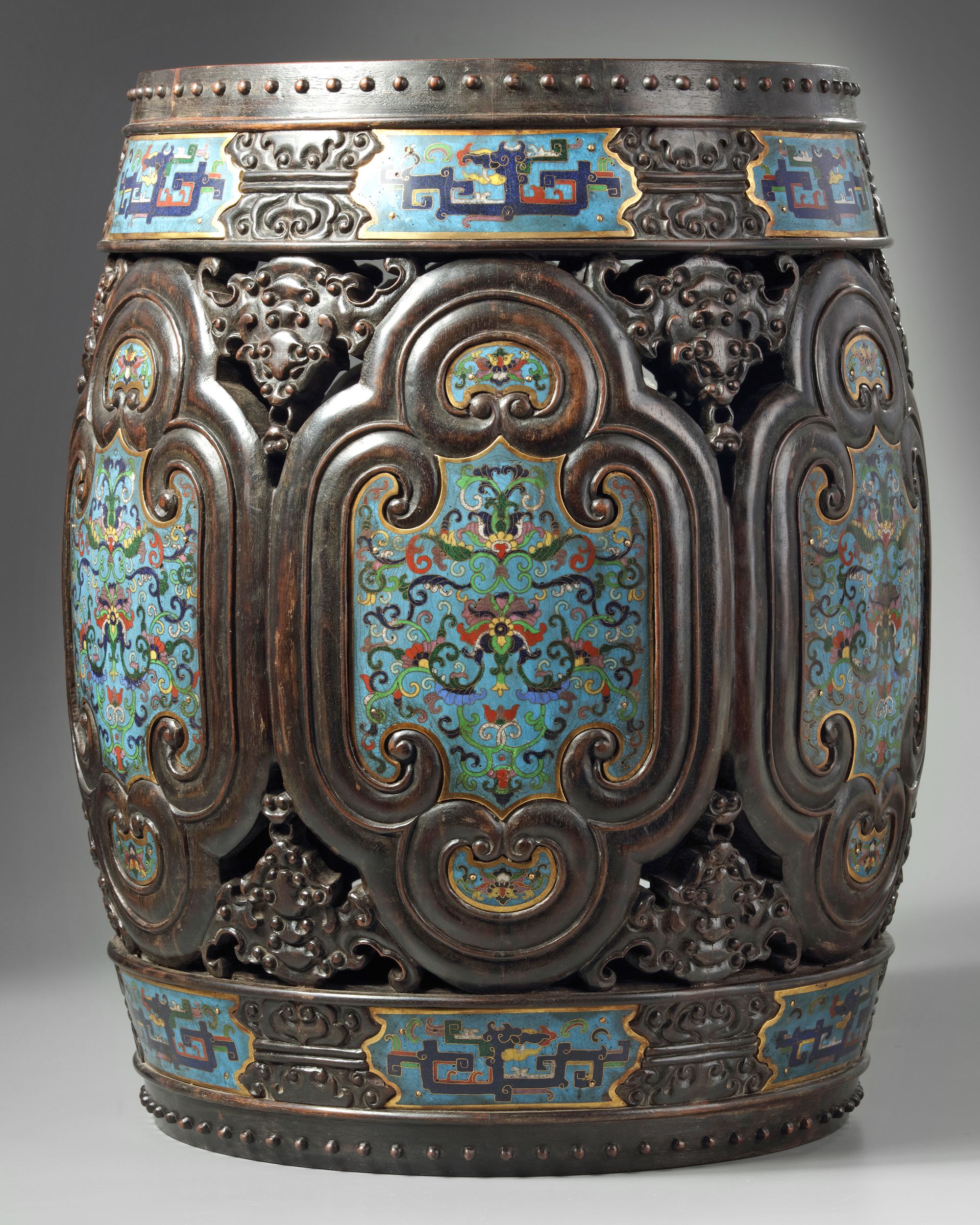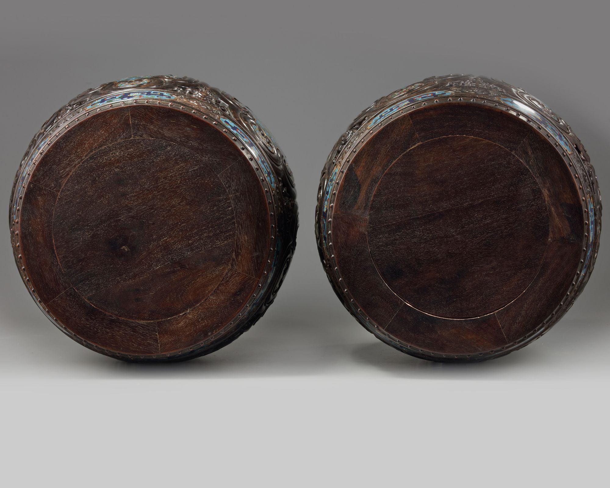 The seats are finely decorated with shaped cloisonné enamel panels to the body decorated with lotus scrolls. The upper and lower registers are inset with kui dragon panels. The panels in the middle registers are separated by carved confronting bats, the upper and lower registers decorated with two bands of nodes.