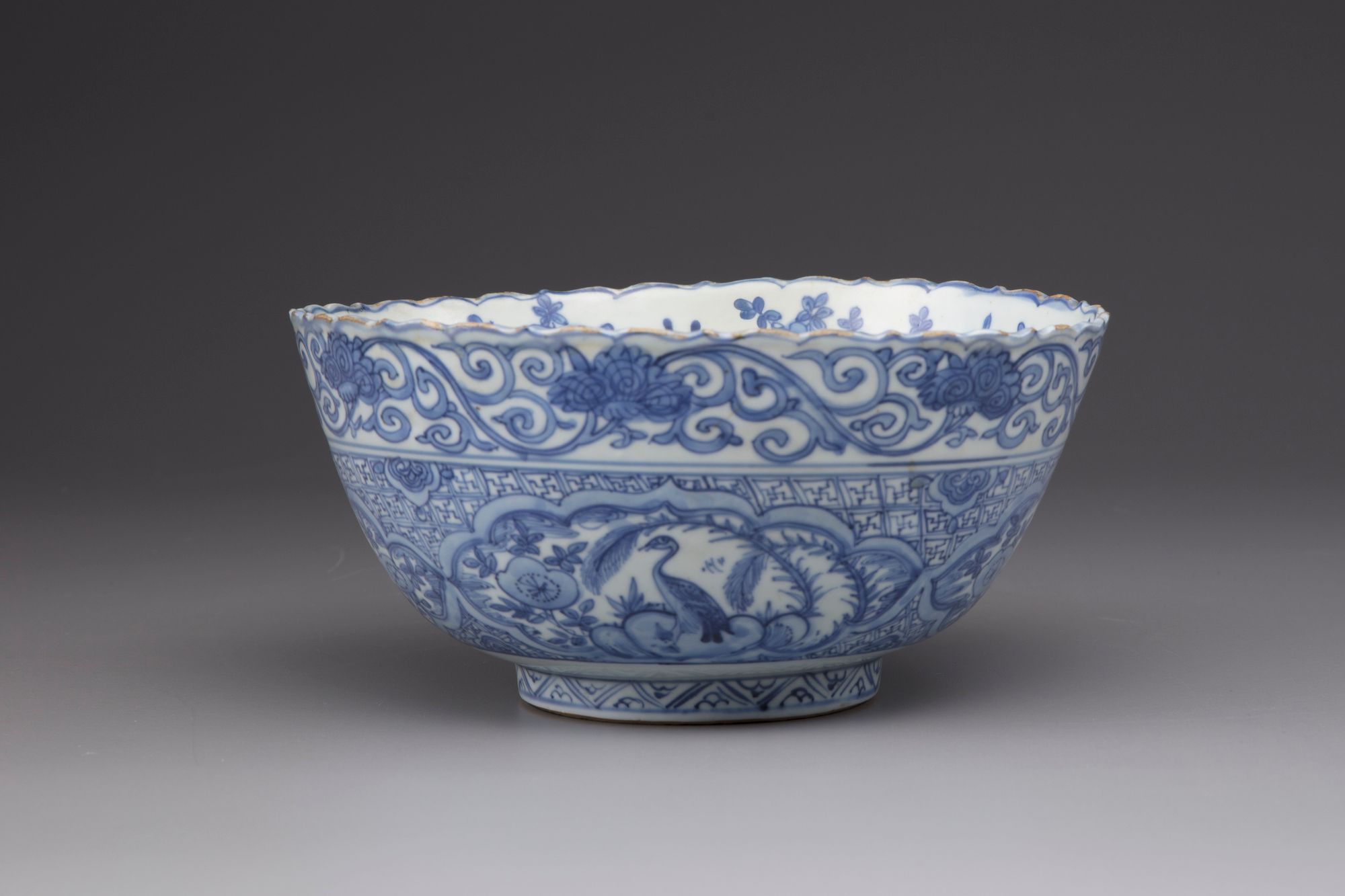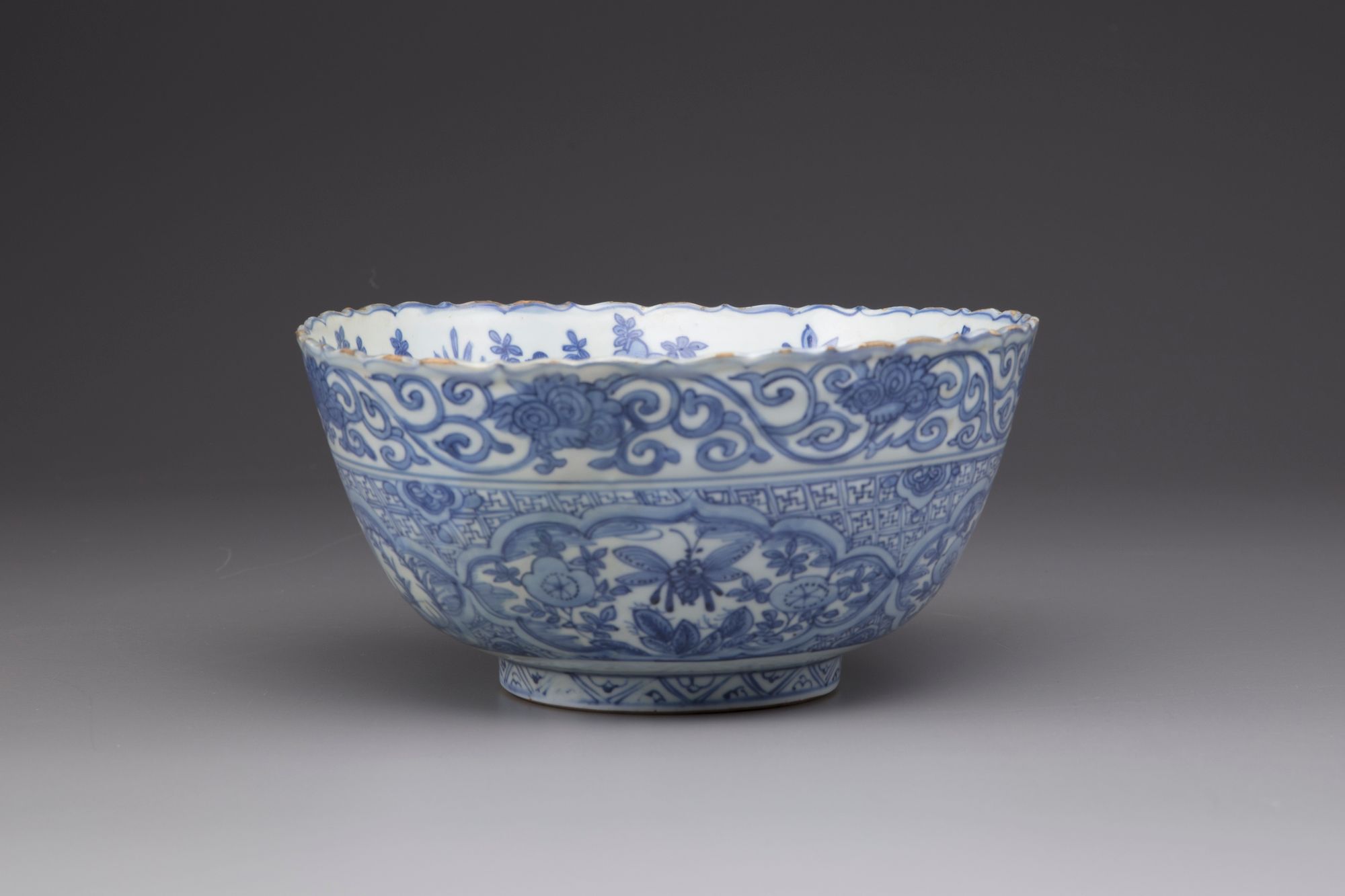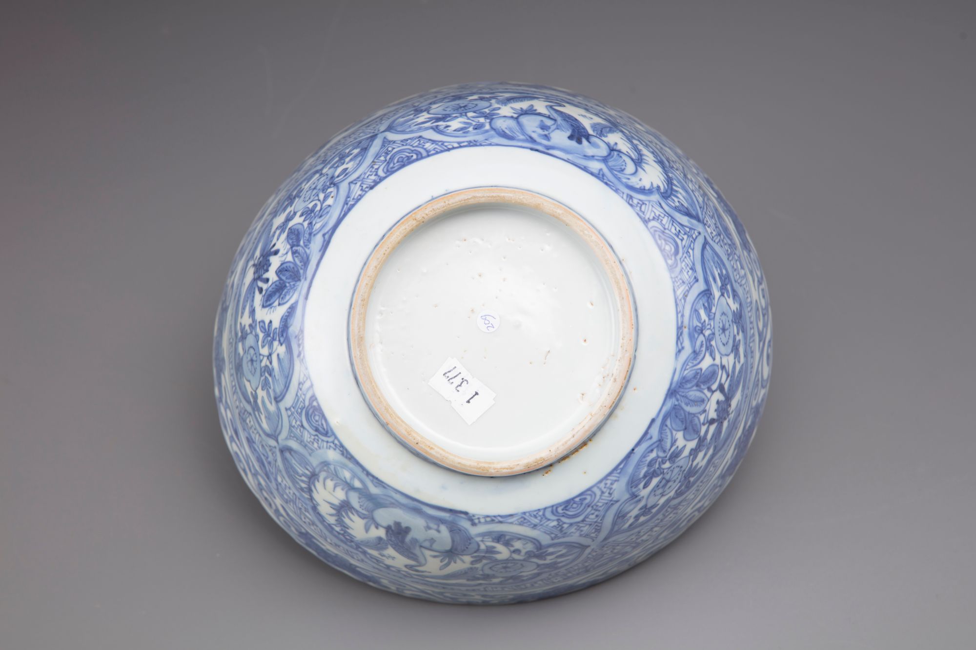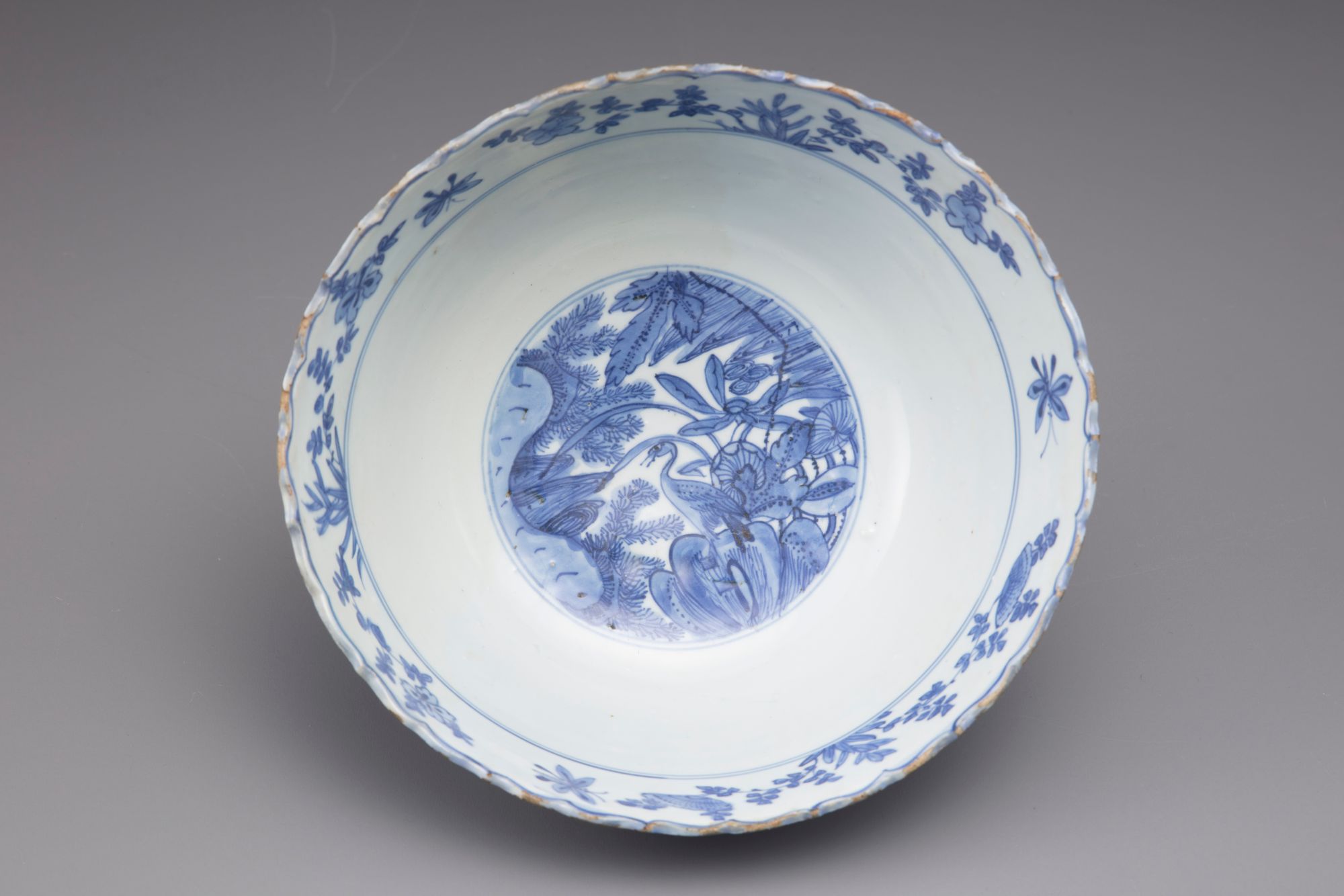 Deep bowl on high footring with slightly rounded sides, decorated in underglaze blue with four cartouches depicting insects and ducks in a landscape, under a lotus scroll border, the interior with a central medallion depicting a pond with duck and various water plants.