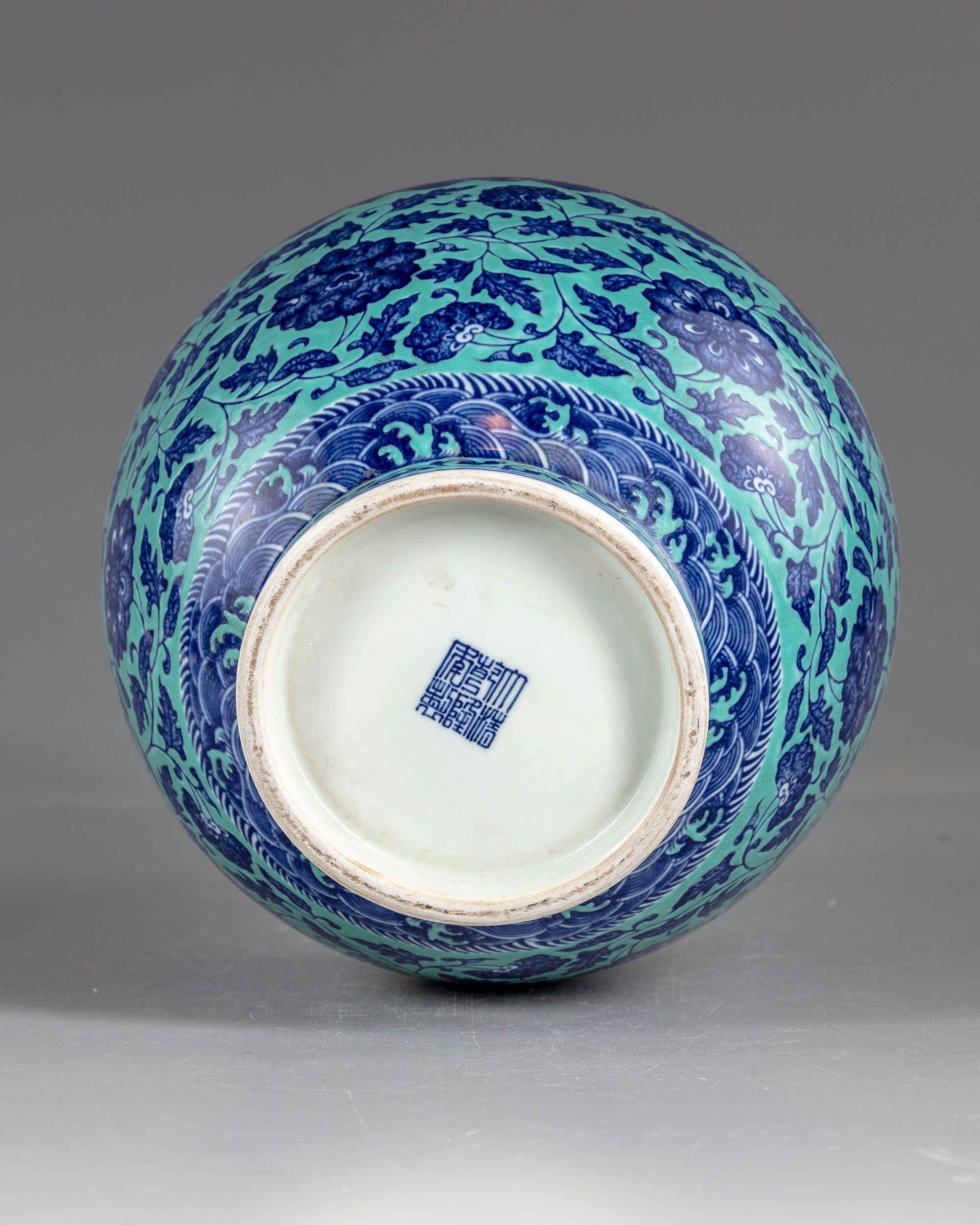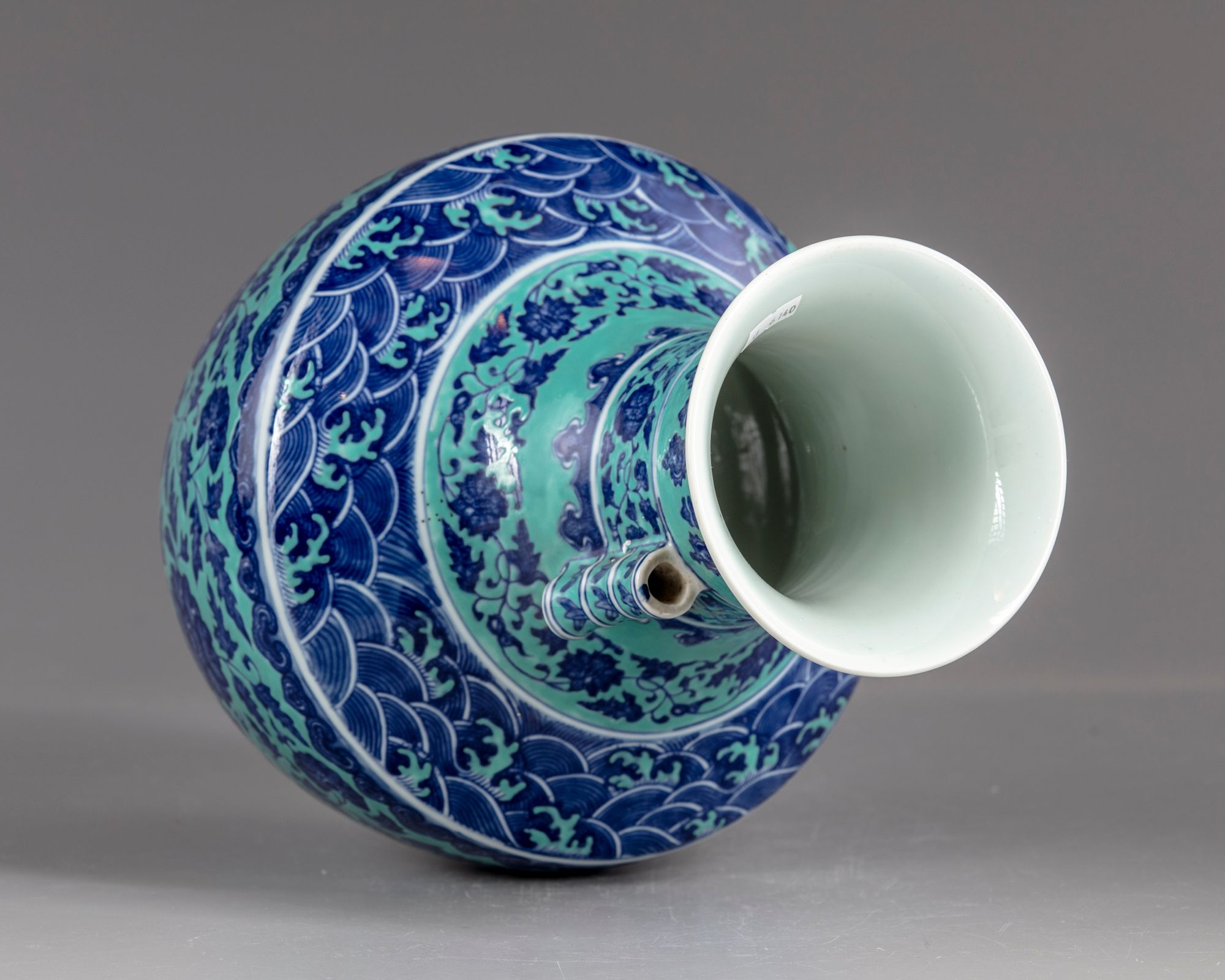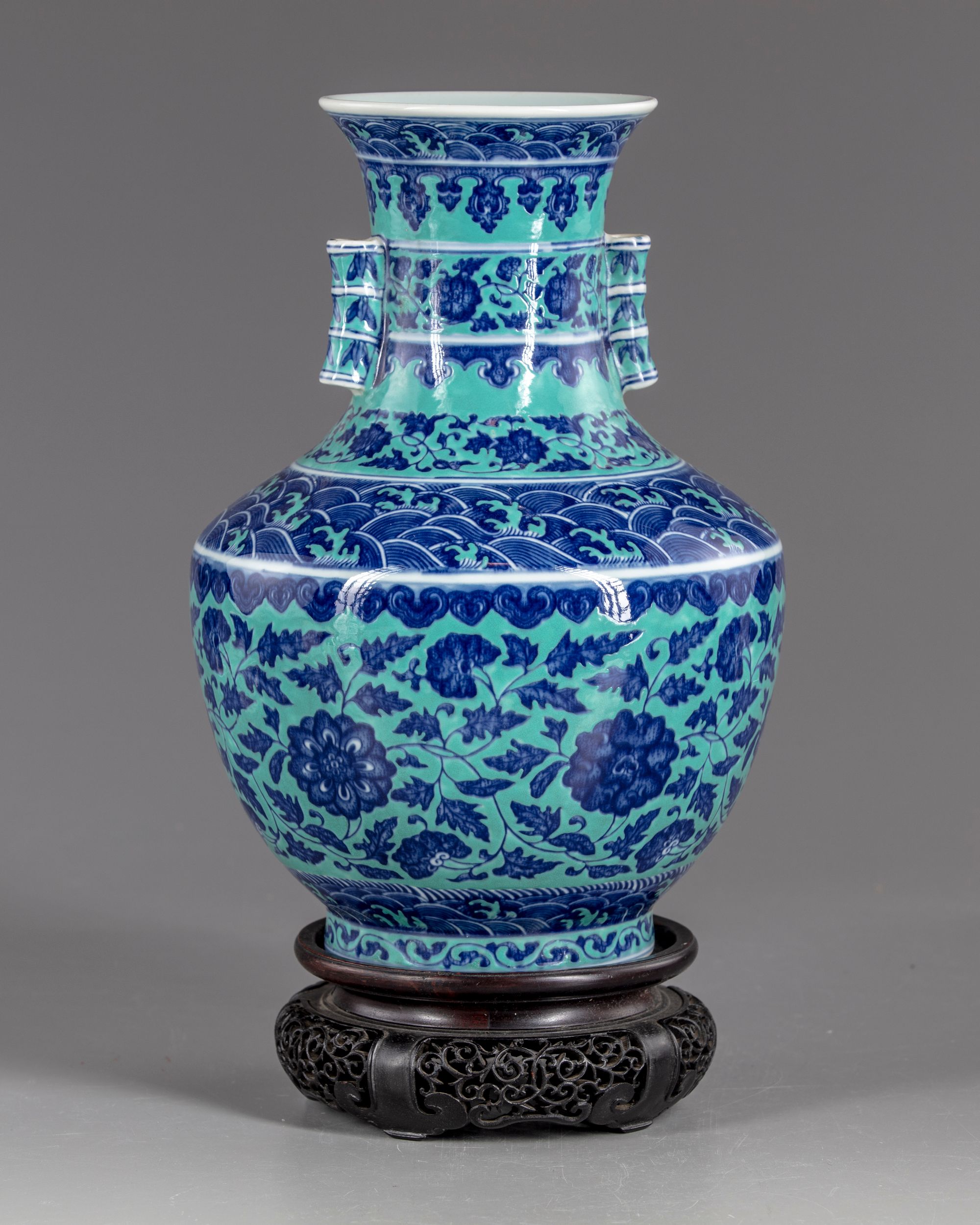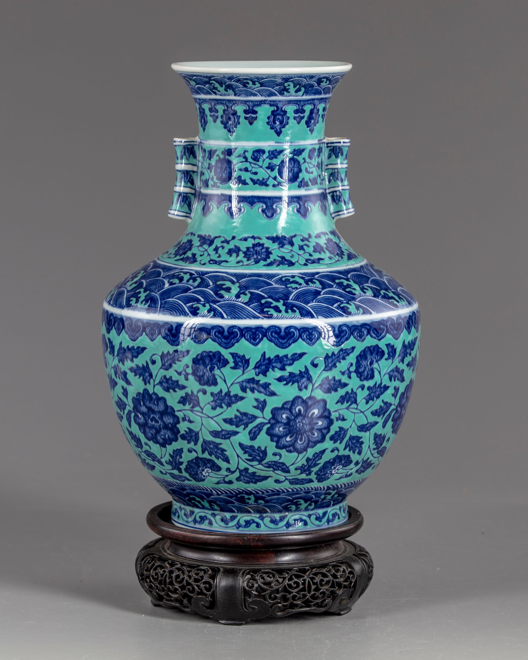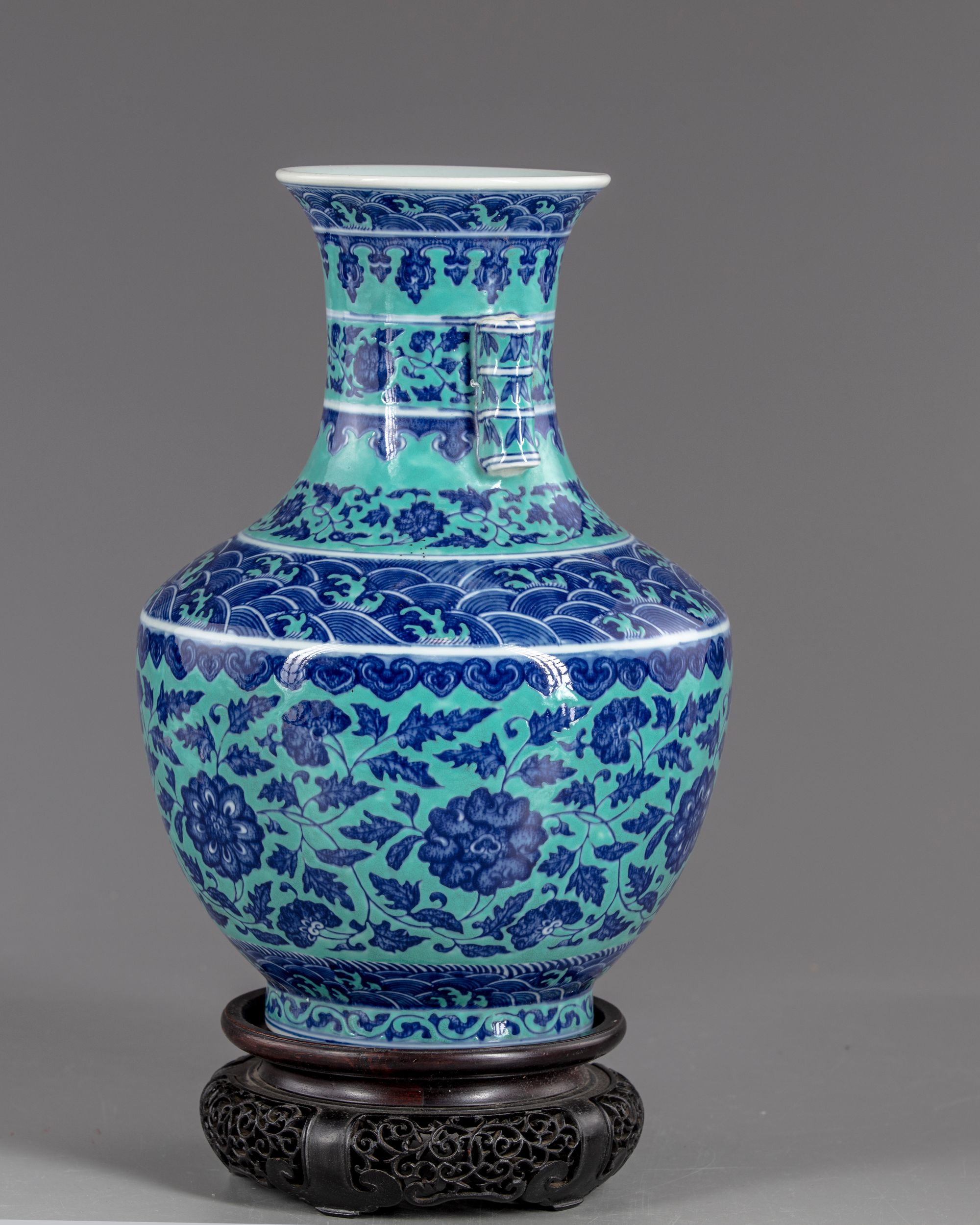 A Chinese gasoline green vase stylised with two tubular handles, decorated in cobalt blue with lotus scrolls set between sea waves and ruyi heads. The neck is further painted similarly on a green ground.