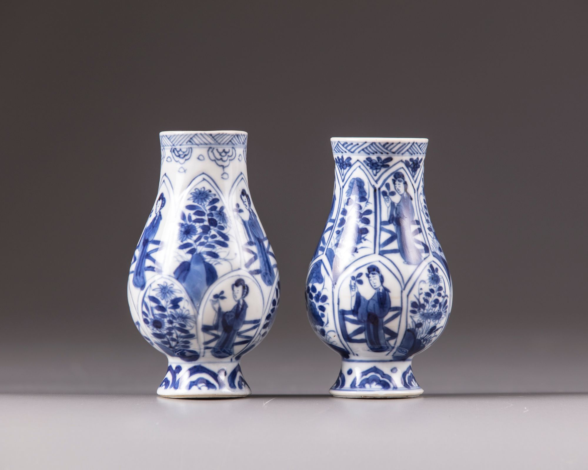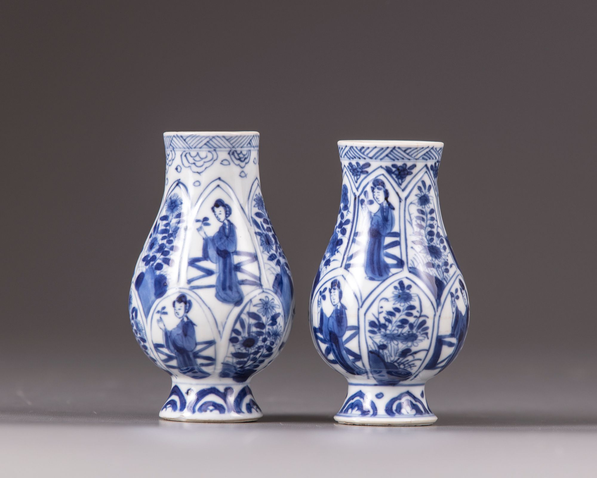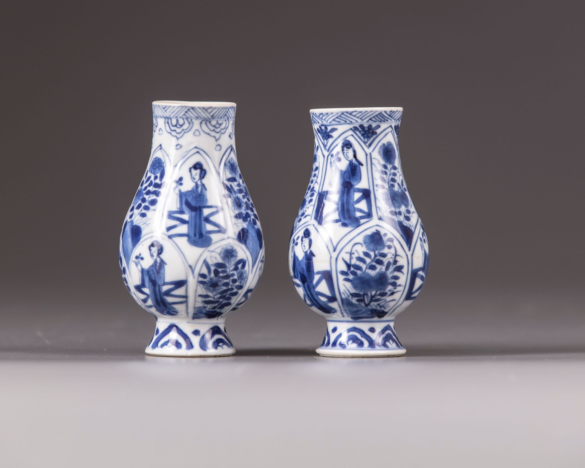 Decorated with alternating panels containing various kinds of flowers and a standing lady with a flower is her hand.