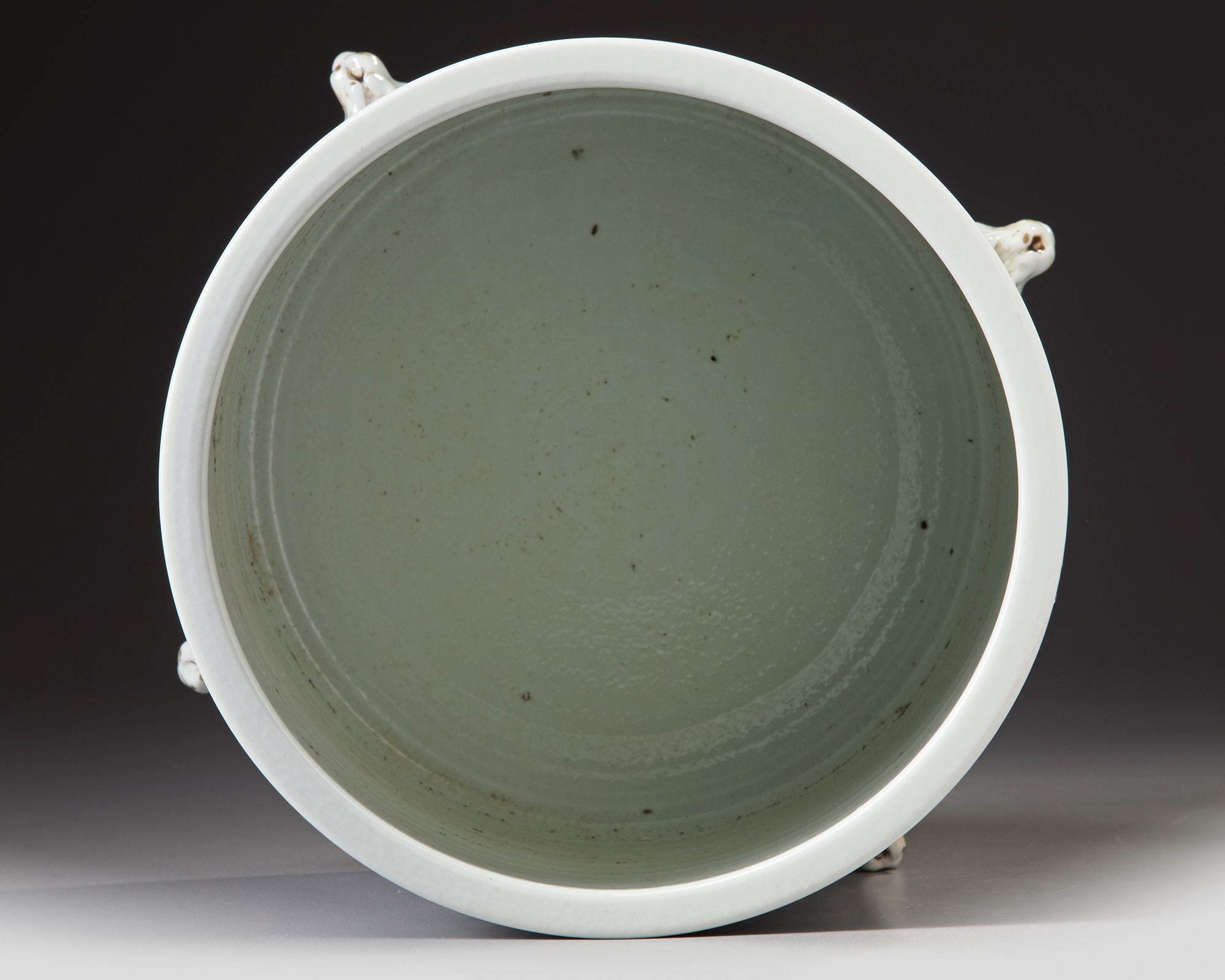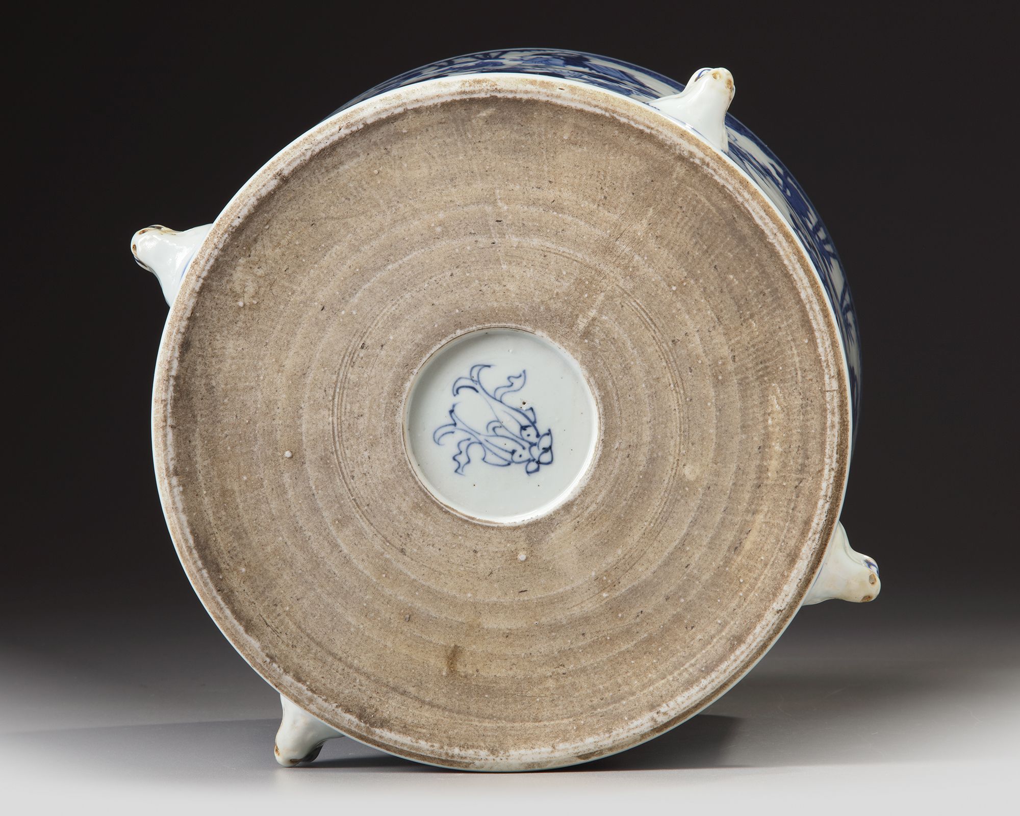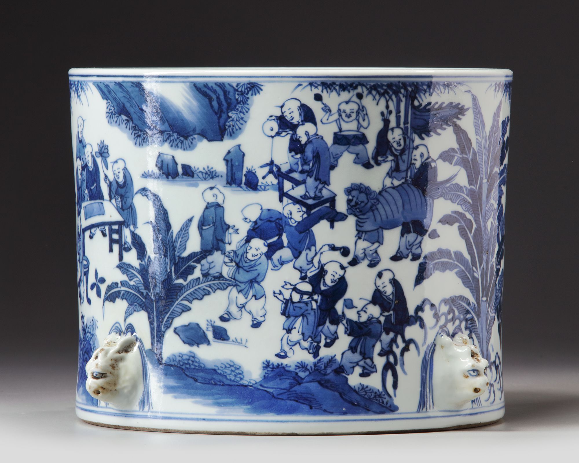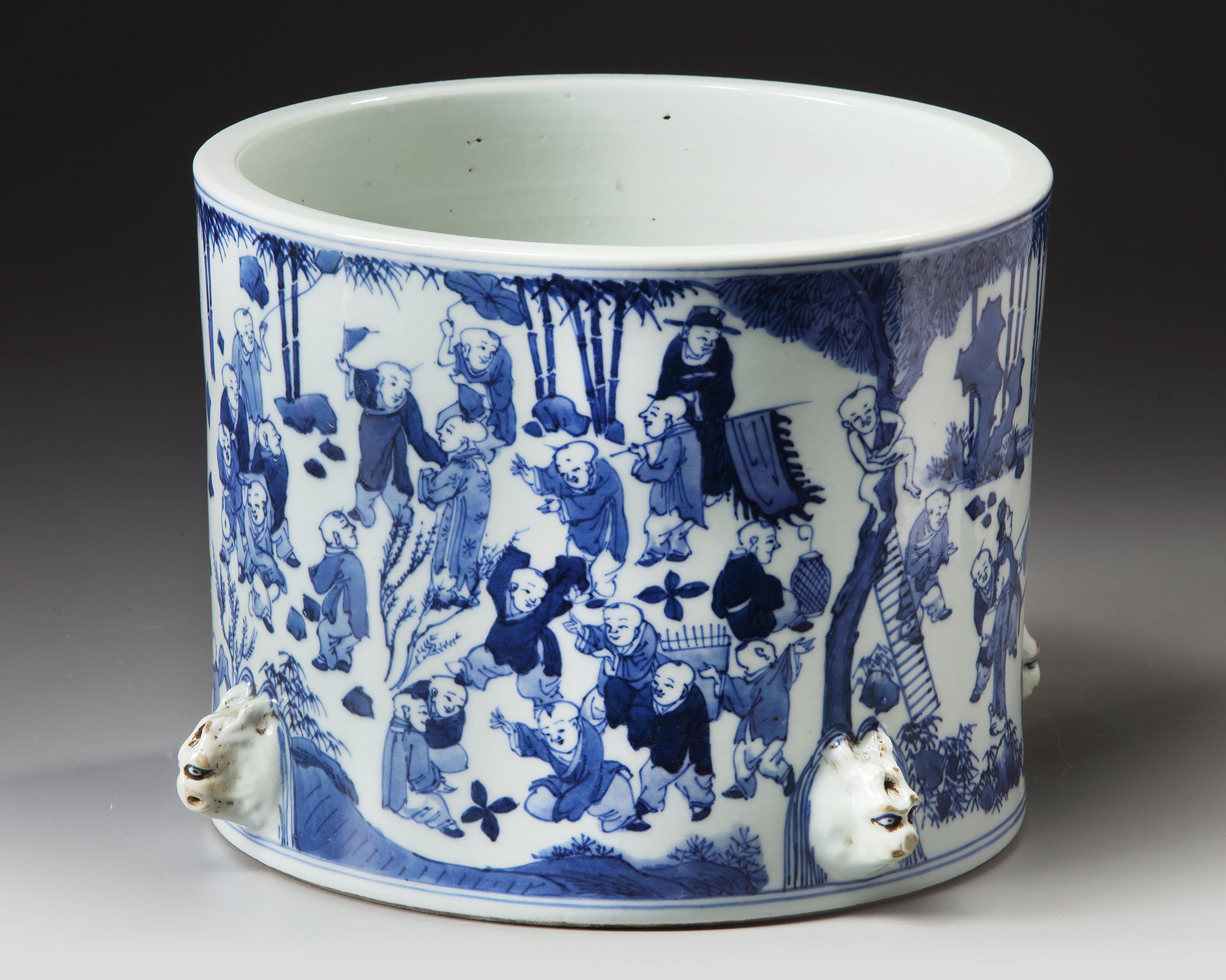 The brush pot is decorated in underglaze blue to the exterior with a continuous scene of boys at play amongst plantain, rocks, and bamboo. The lower body is decorated with three white-glazed moulded mythical-beast-head appliques. 21 cm high, 27 cm. diam.