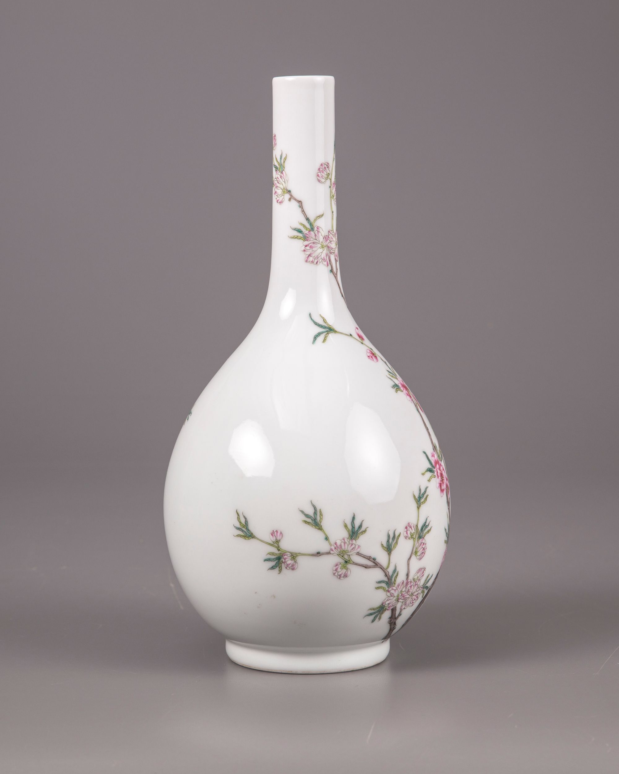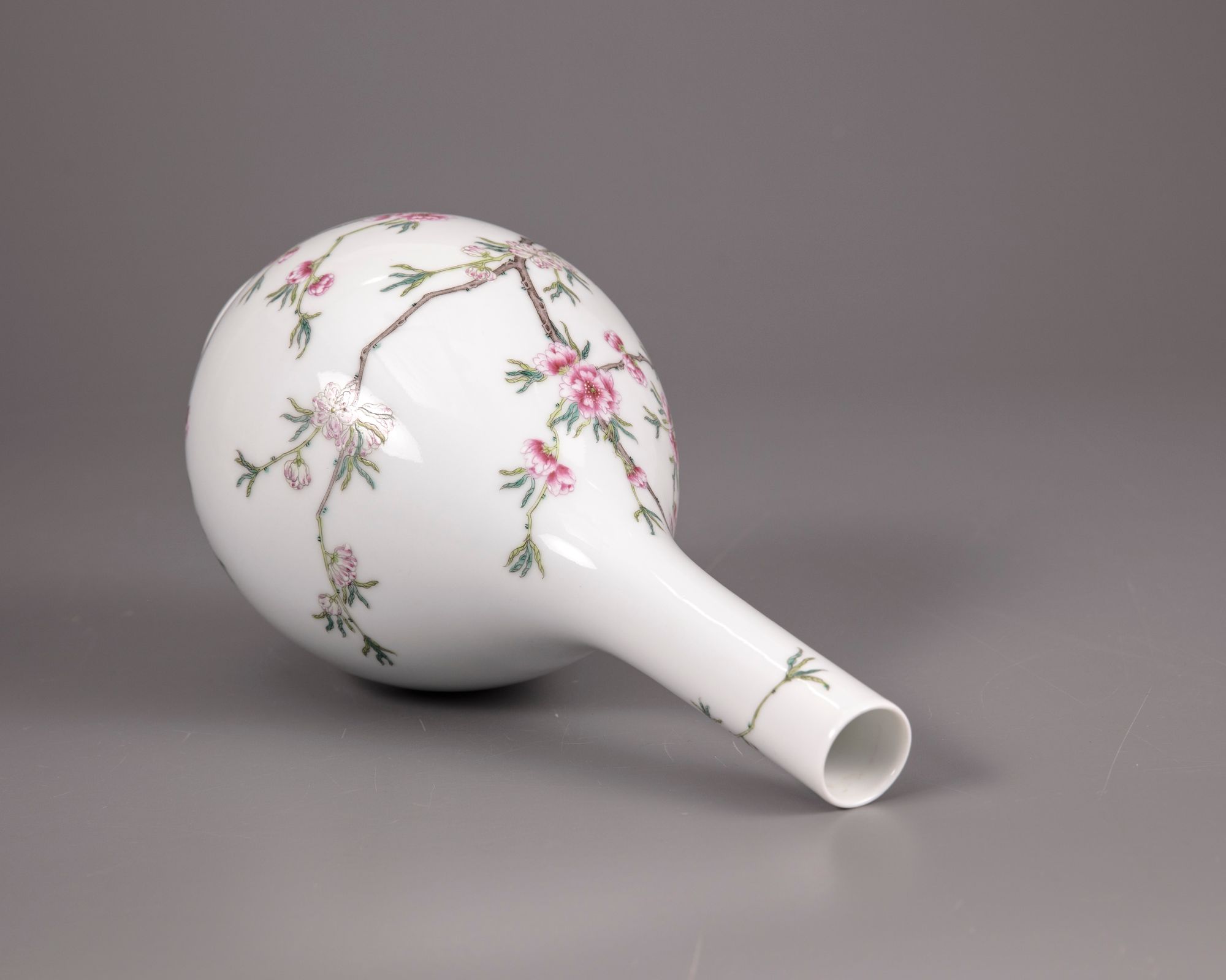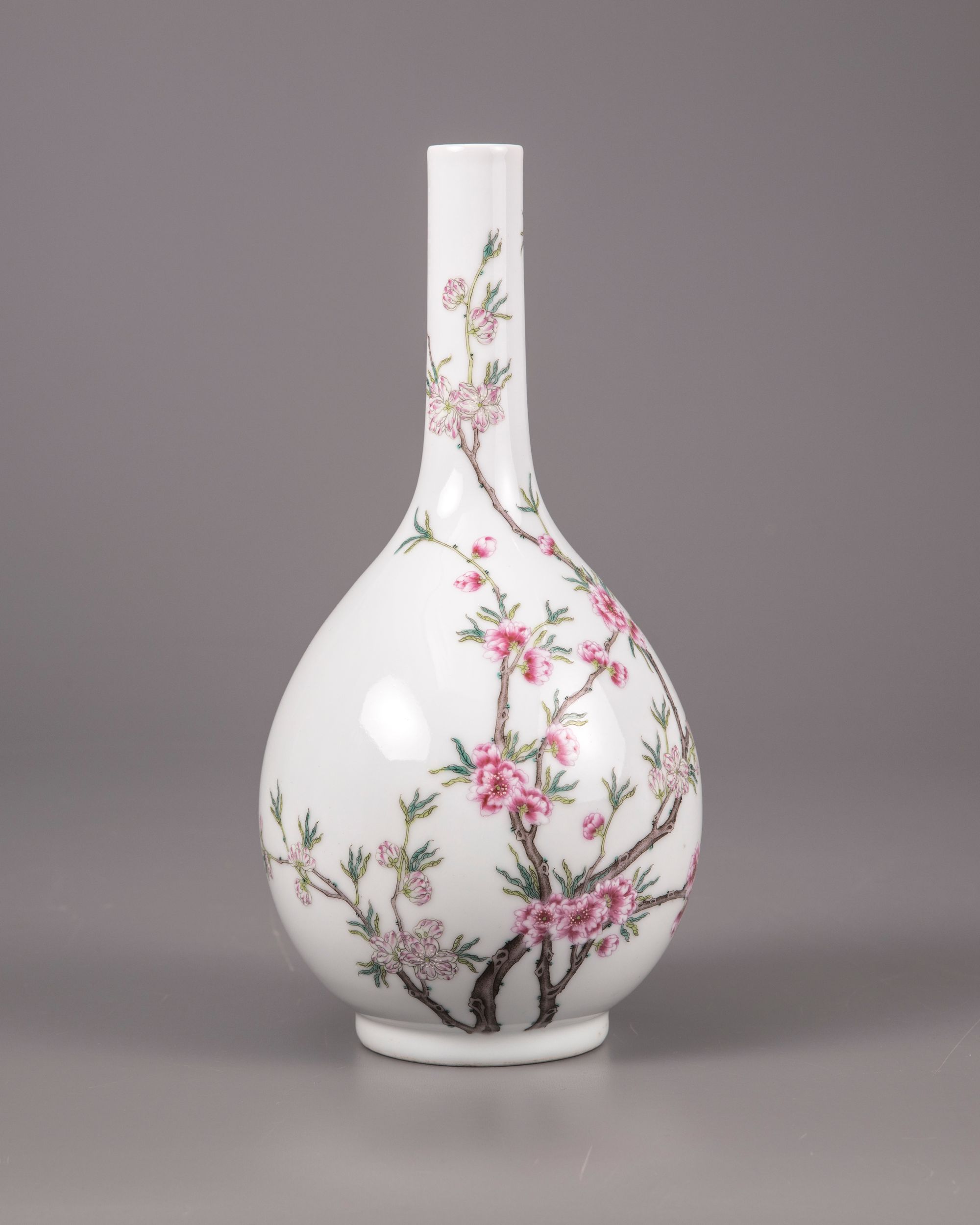The vase is decorated to the bulbous body with densely flowering prunus blossoms on a leafy gnarled branch extending from the foot around the body and up the rim. The base with an apocryphal Qianlong seal mark in iron-red.