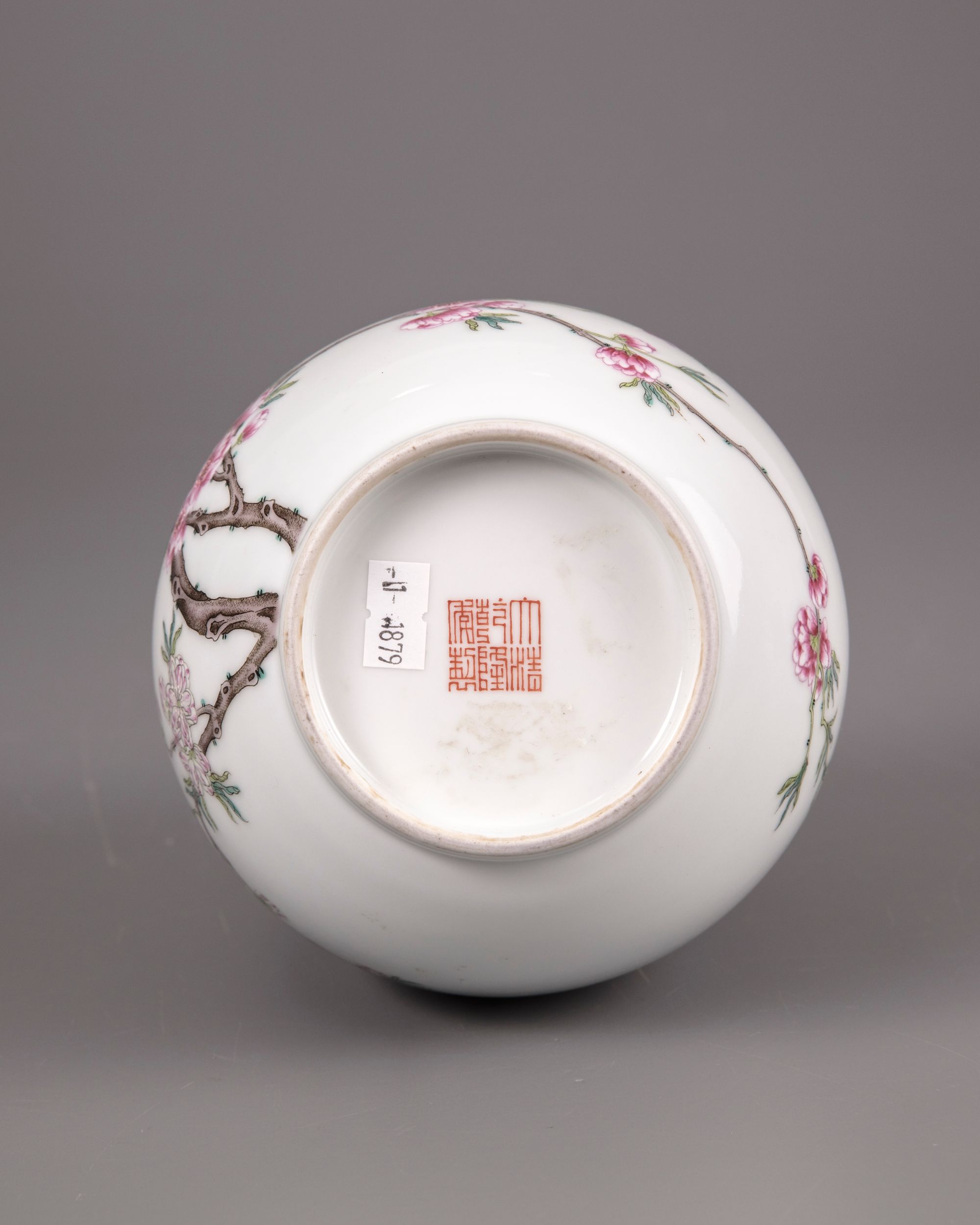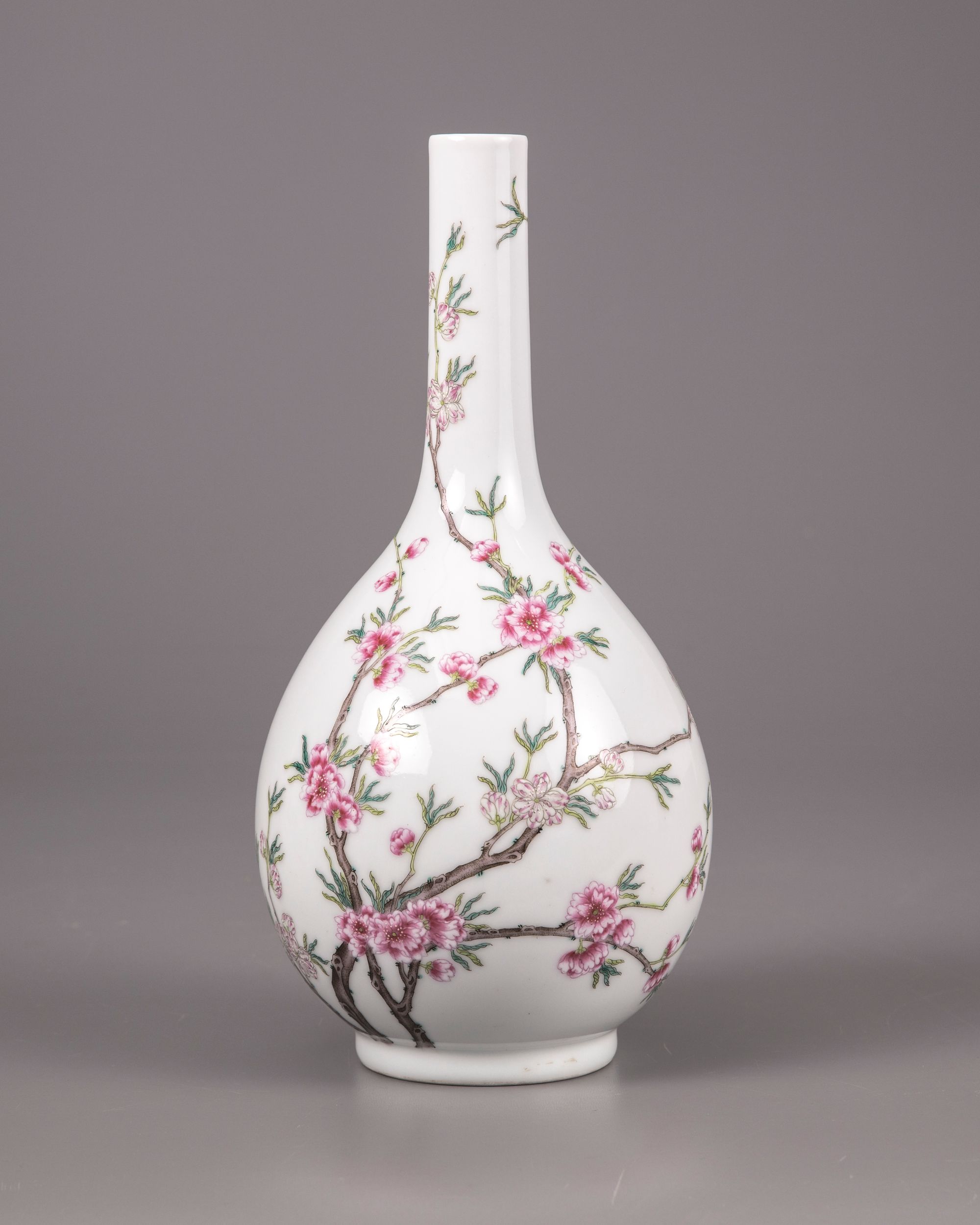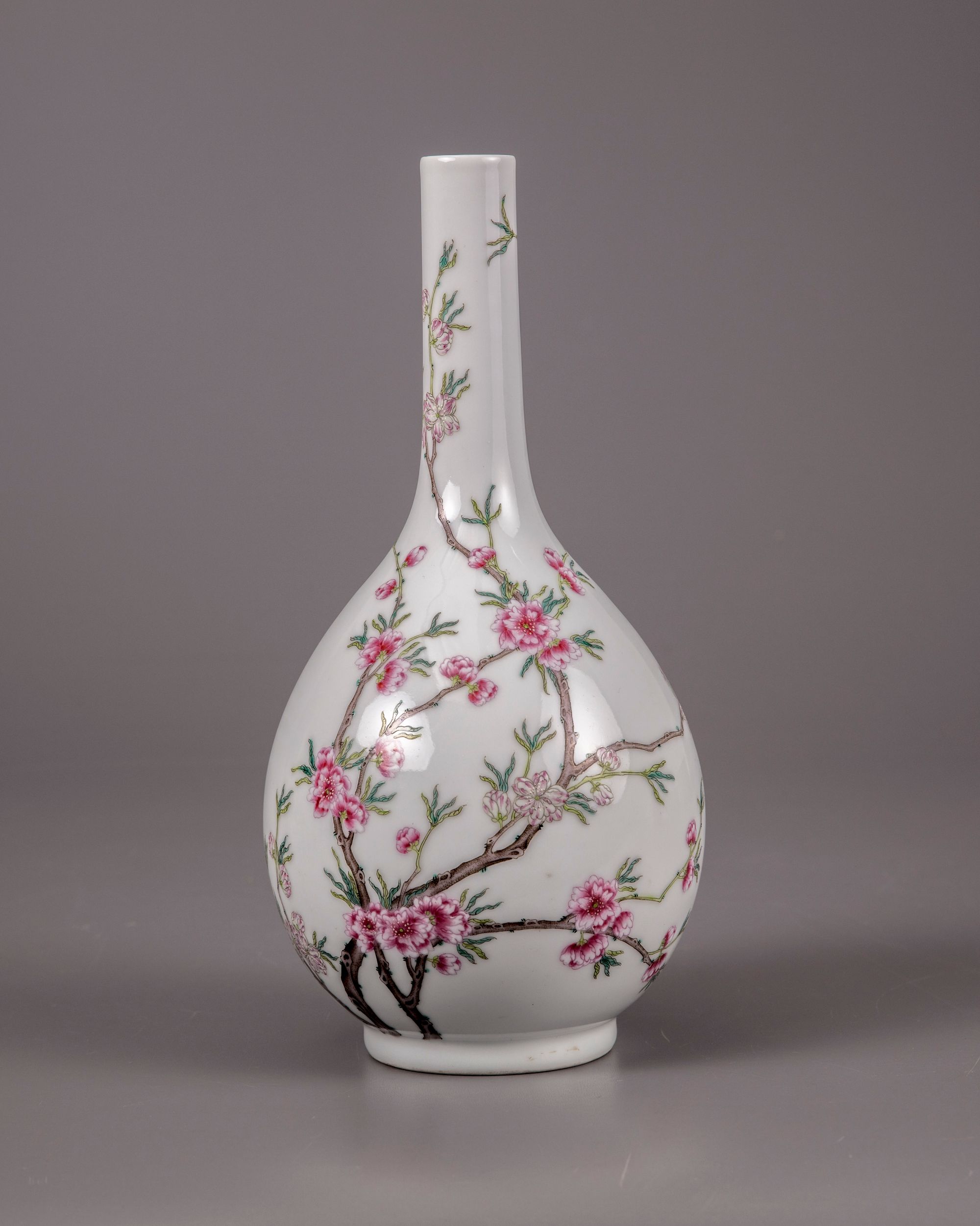 The vase is decorated to the bulbous body with densely flowering prunus blossoms on a leafy gnarled branch extending from the foot around the body and up the rim. The base with an apocryphal Qianlong seal mark in iron-red.