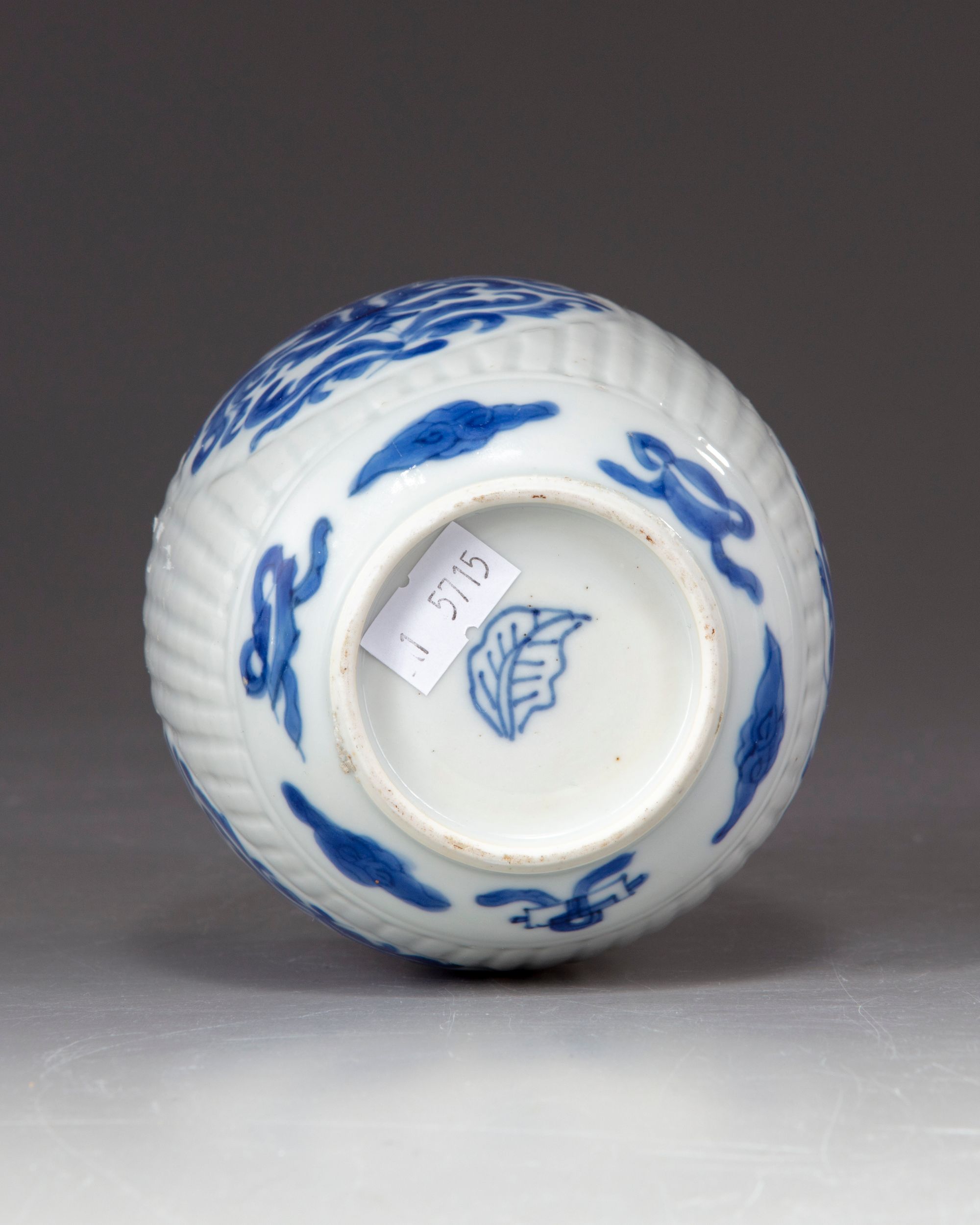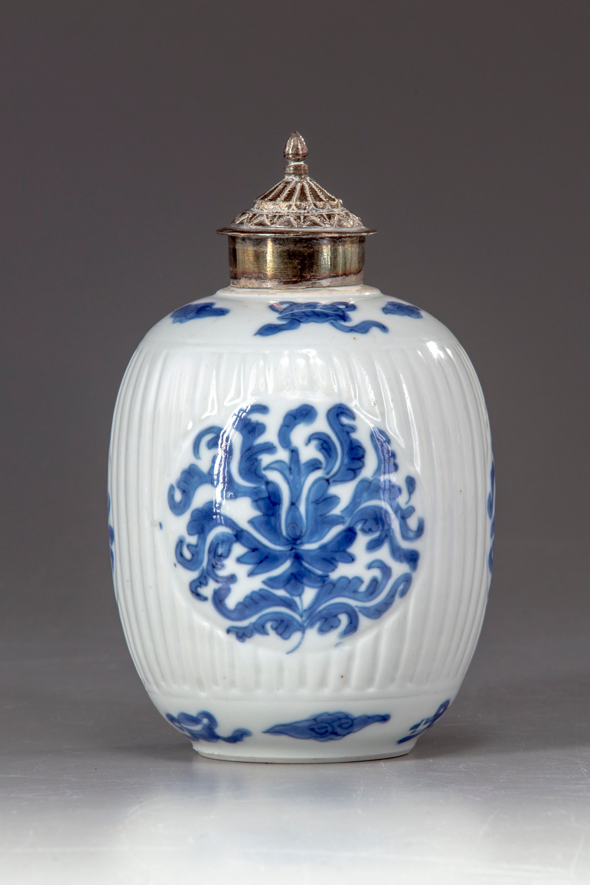 The ribbed body is reserved with four lotus roundels, set between a band of auspicious emblems to the shoulder and another one above the foot. The base is decorated with an artemisia leaf mark and silver mounting.