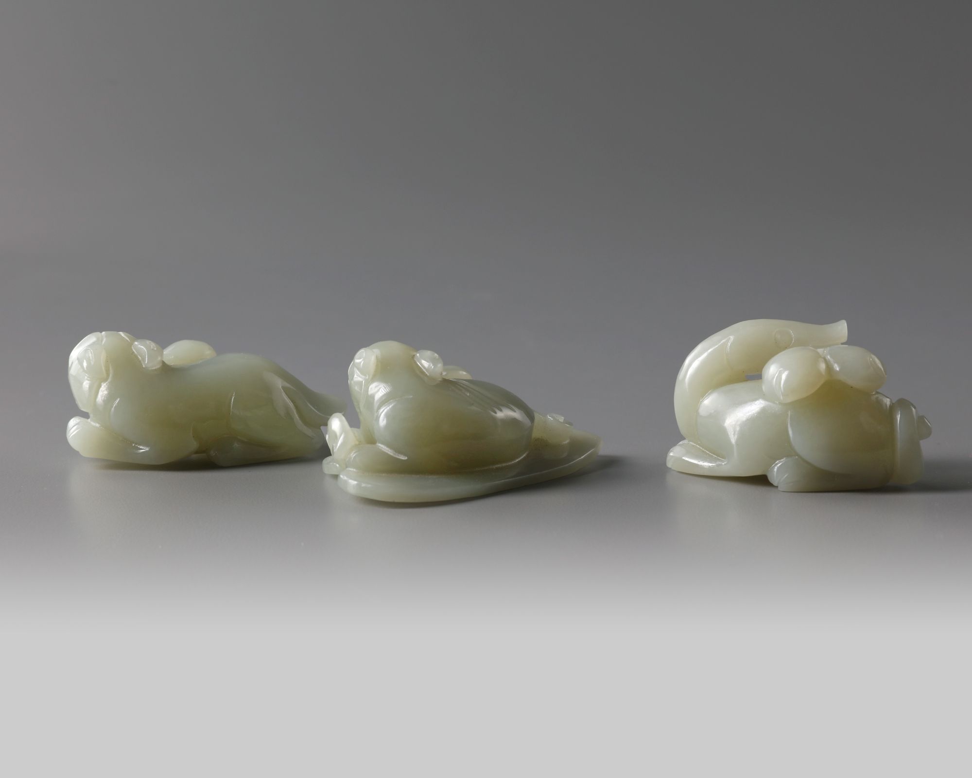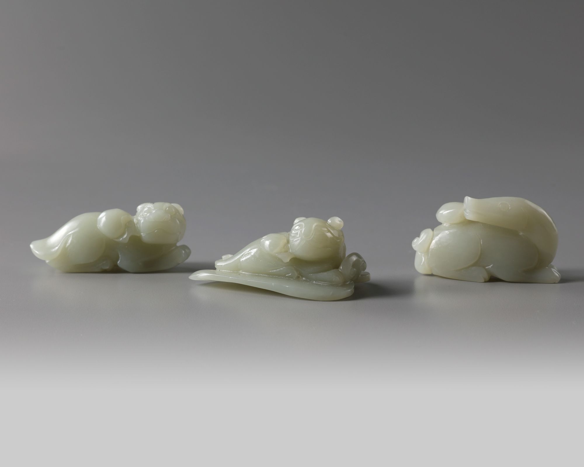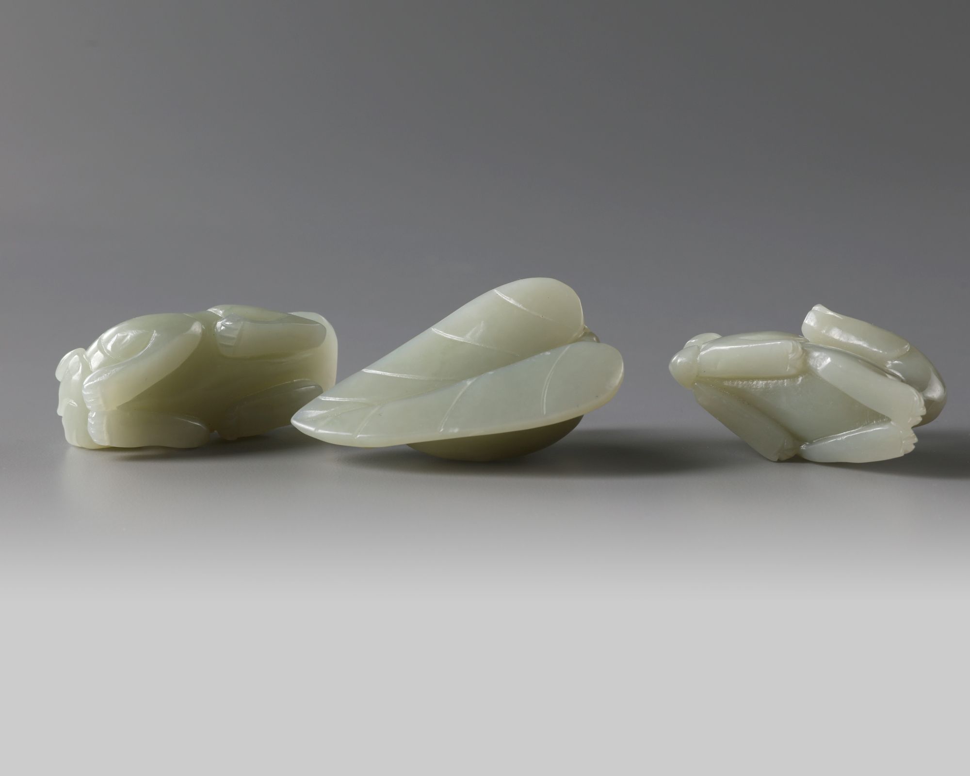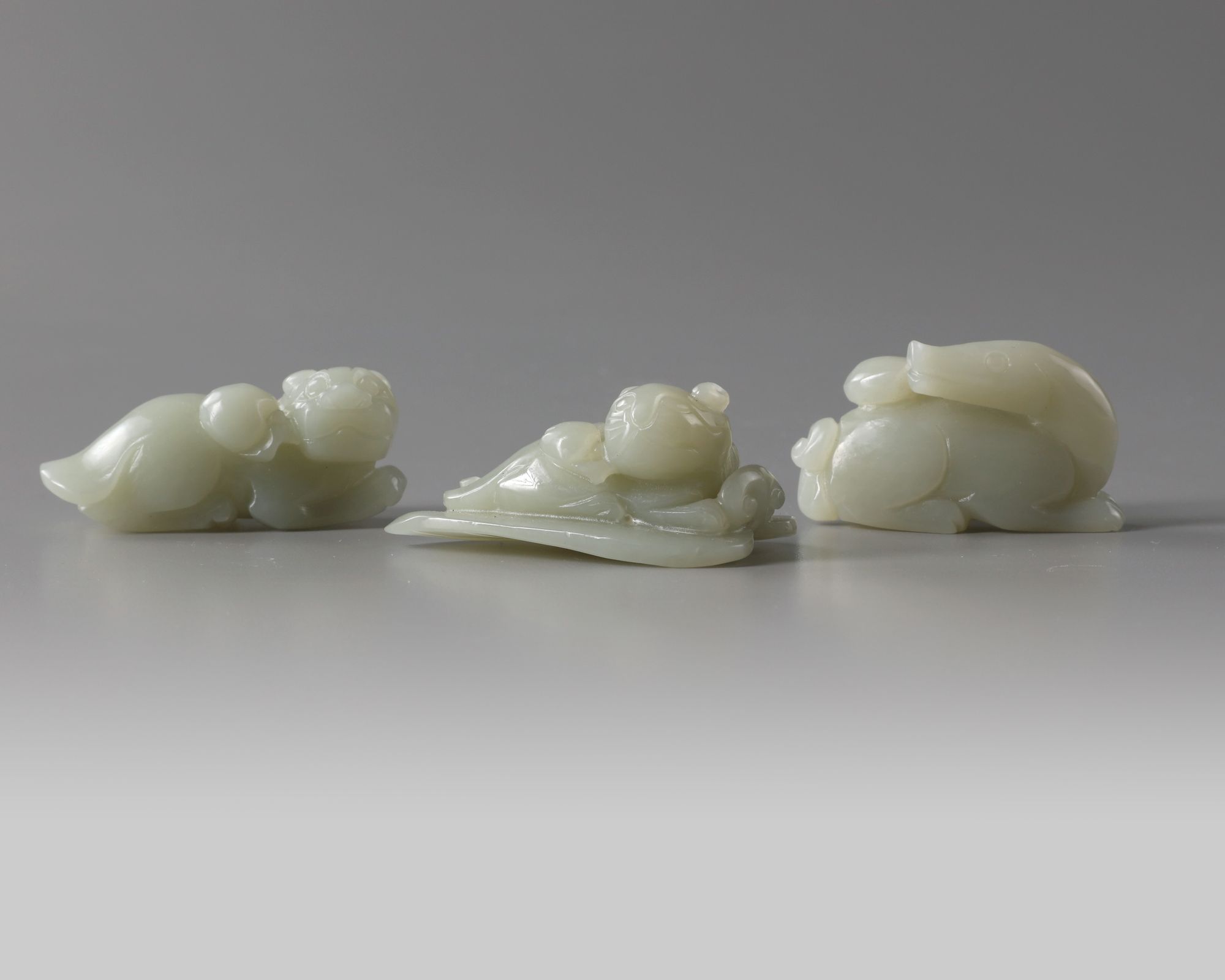 Comprising a crouched mythical beast holding a fruit; a cat holding a fruit on a branch on a leaf; and a hound holding two peaches.