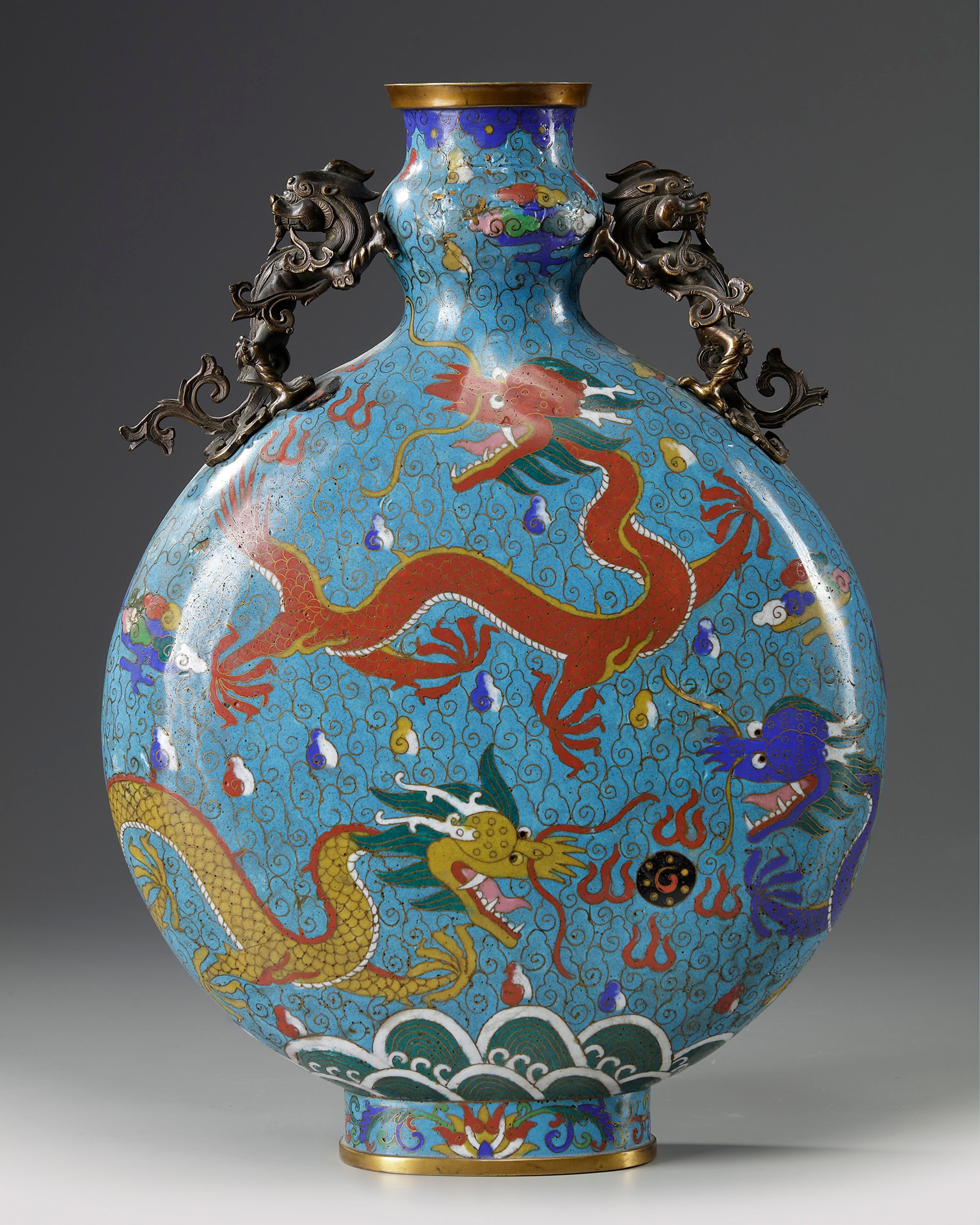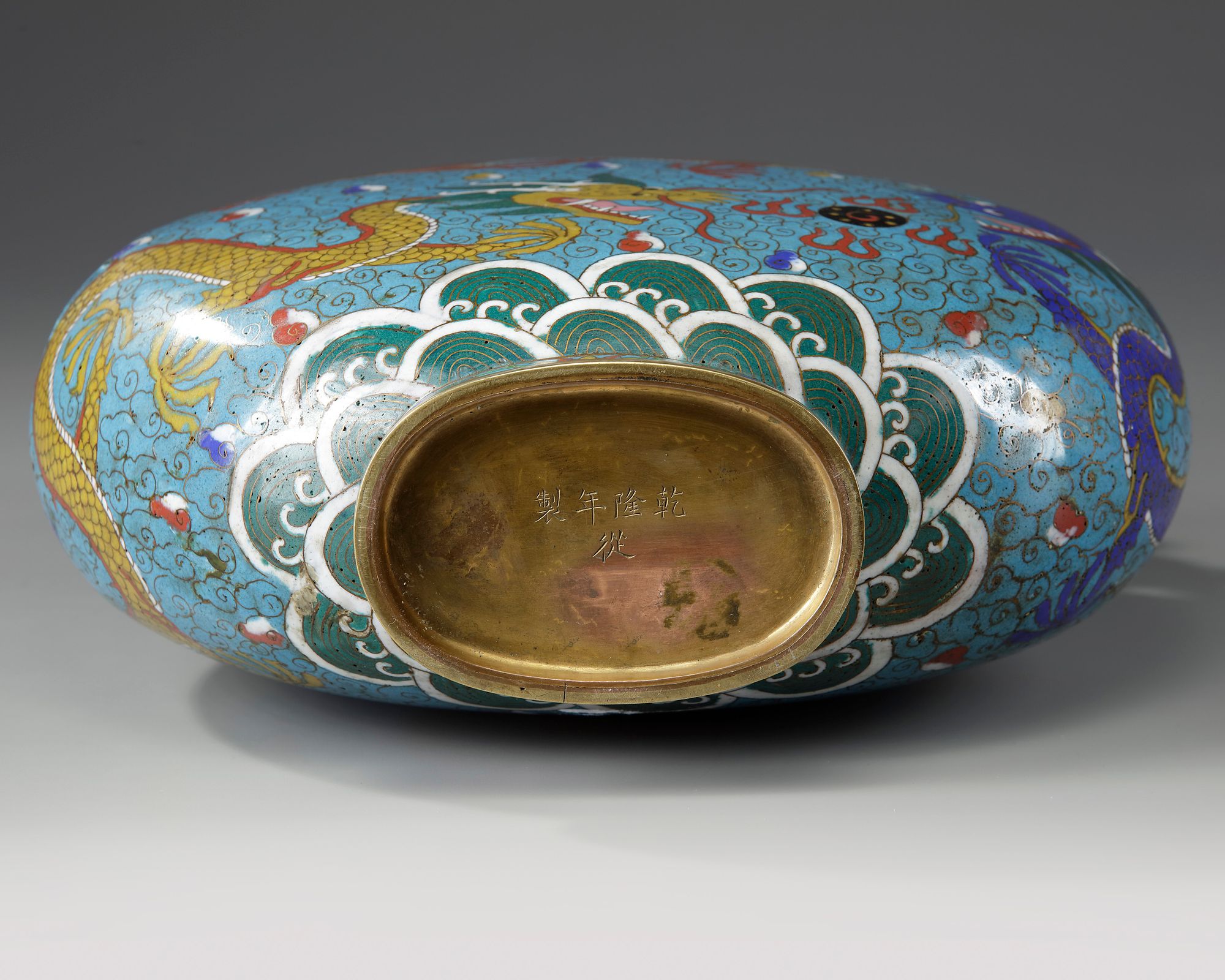 The moonflask is decorated with two qilin handles to the neck and shoulders, the body is decorated with five writhing dragons in various colours chasing flaming pearls amongst cloud scrolls. The neck is decorated with a ruyi-head band and the base with a floral band. The base with an incised apocryphal 'Qianlong nian zhi' and 'cong' mark.