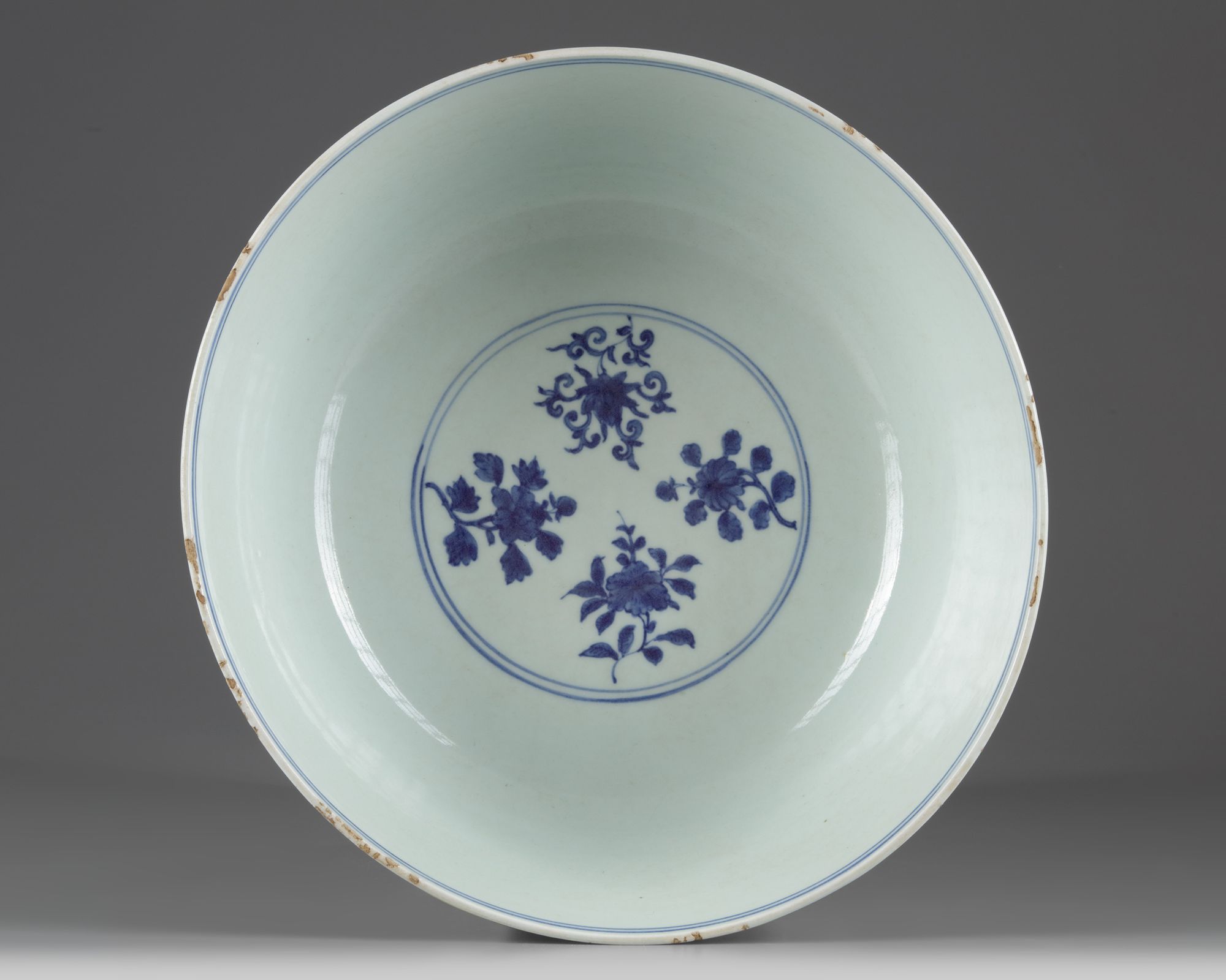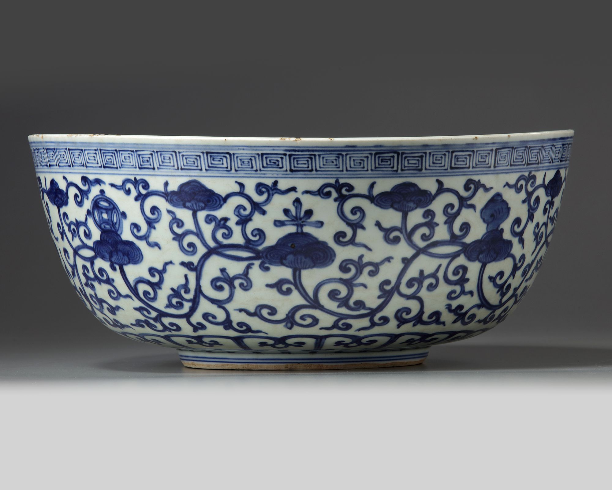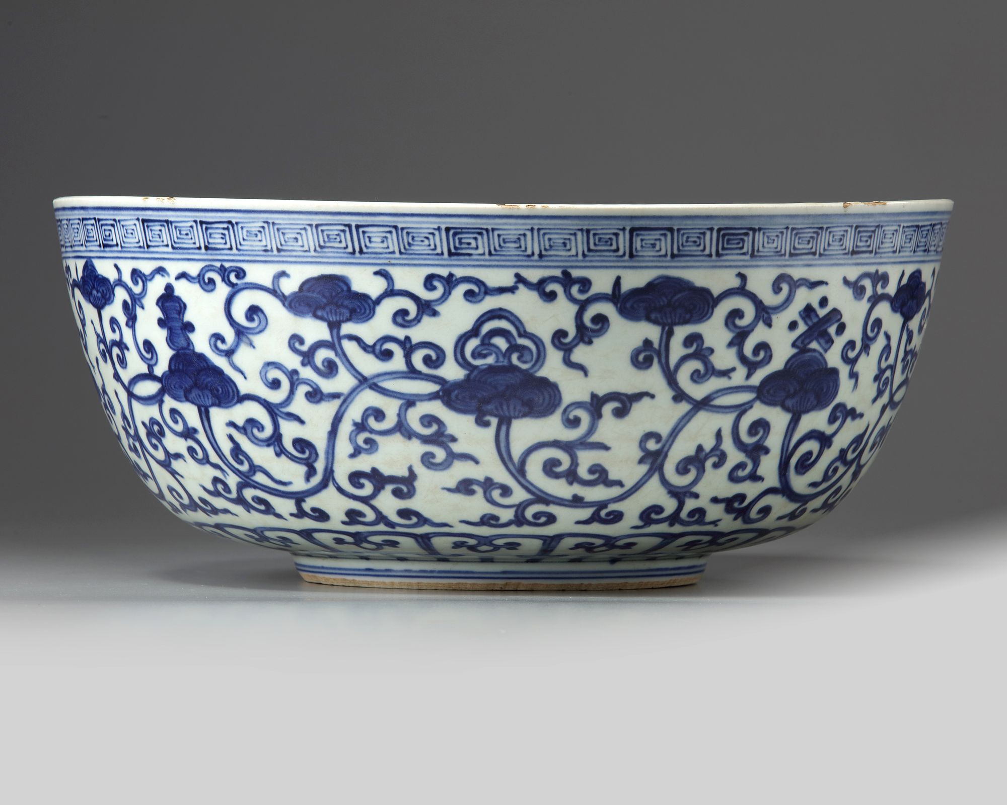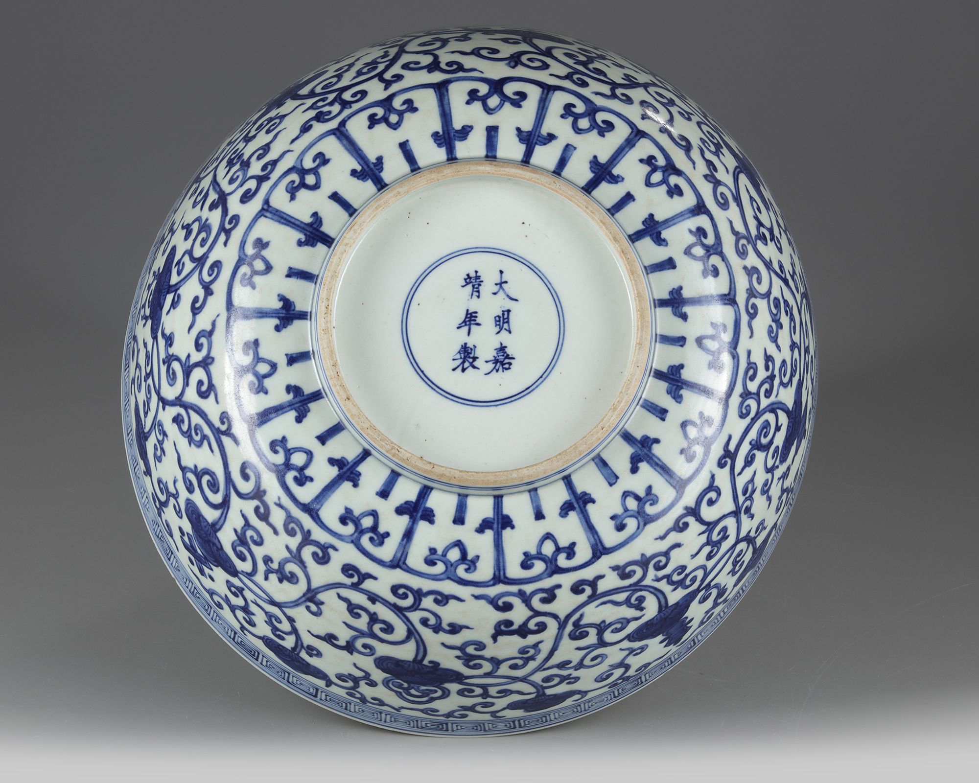 The bowl is decorated to the exterior with scrolling flowers supporting precious objects below a keyfret band. The interior is decorated with a roundel enclosing four sprays of chrysanthemum, peony, rose, and lotus. The base with a Jiajing mark.