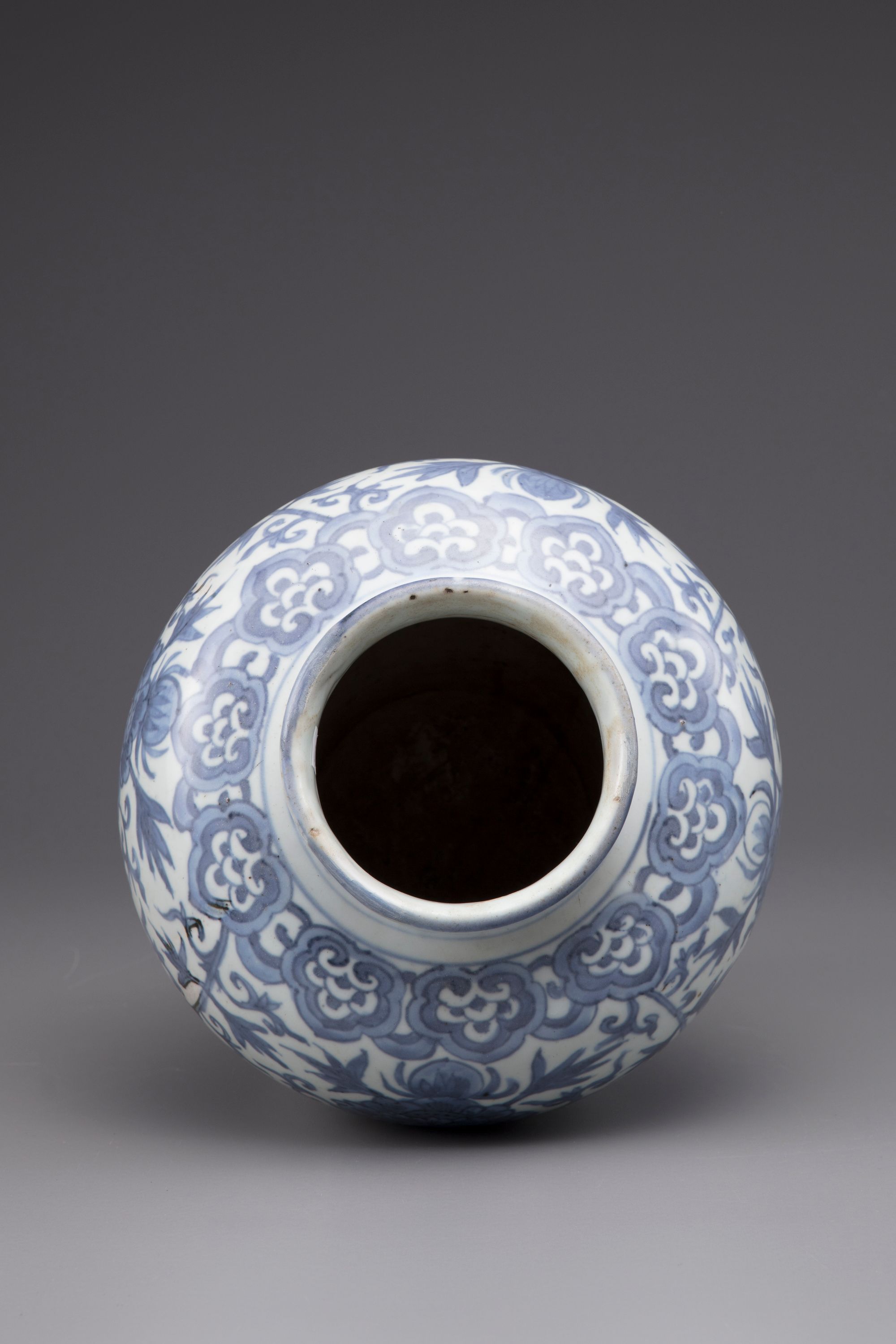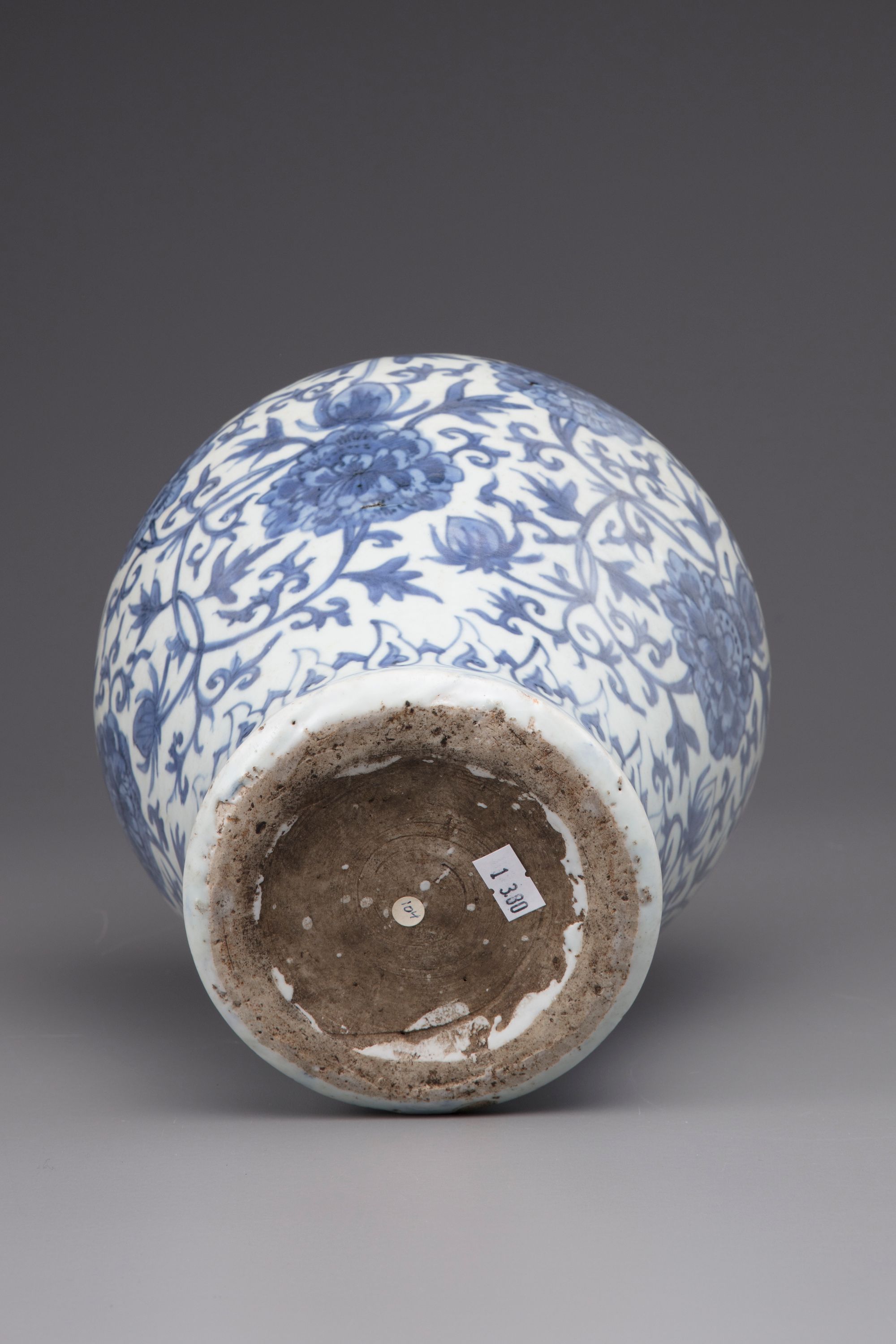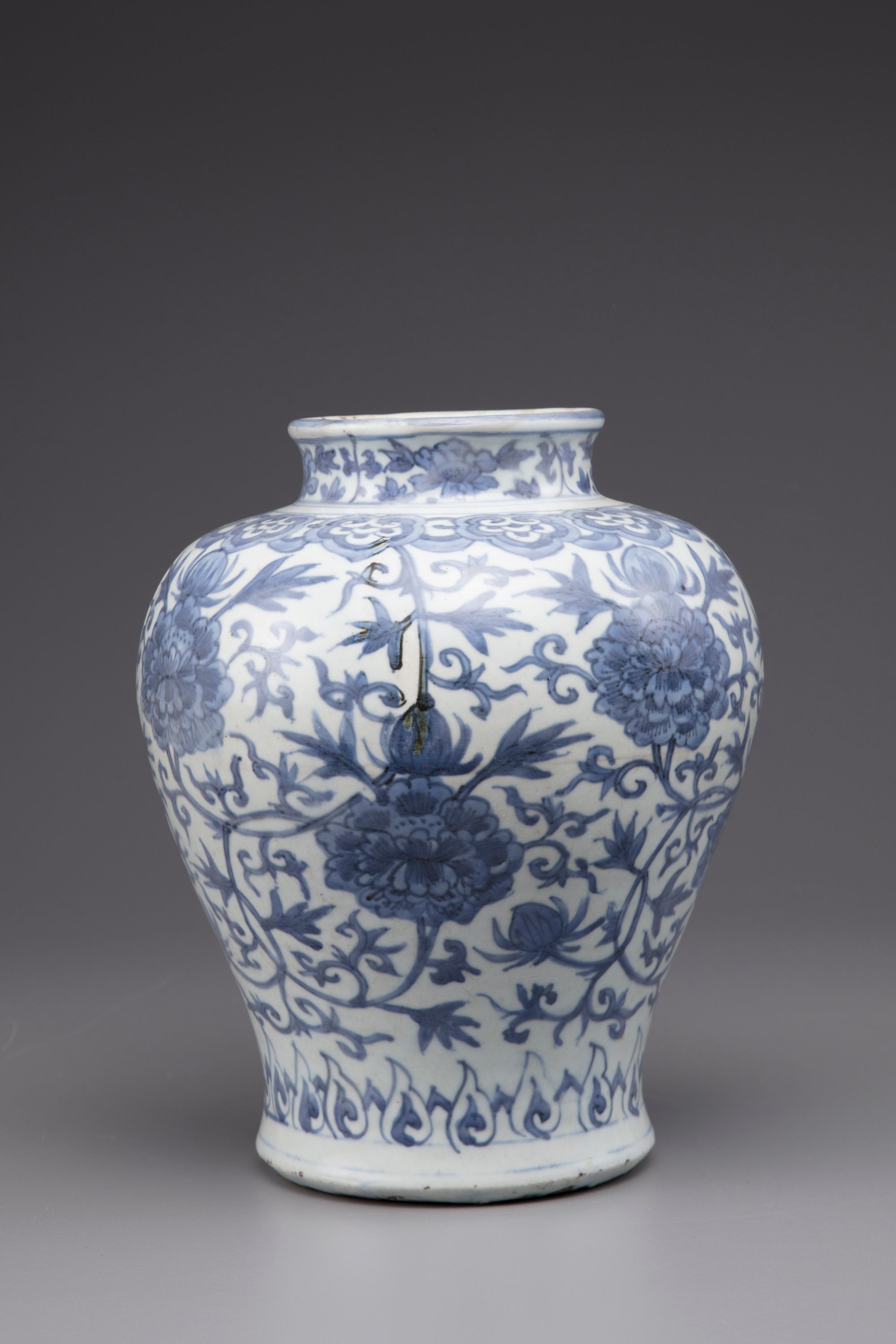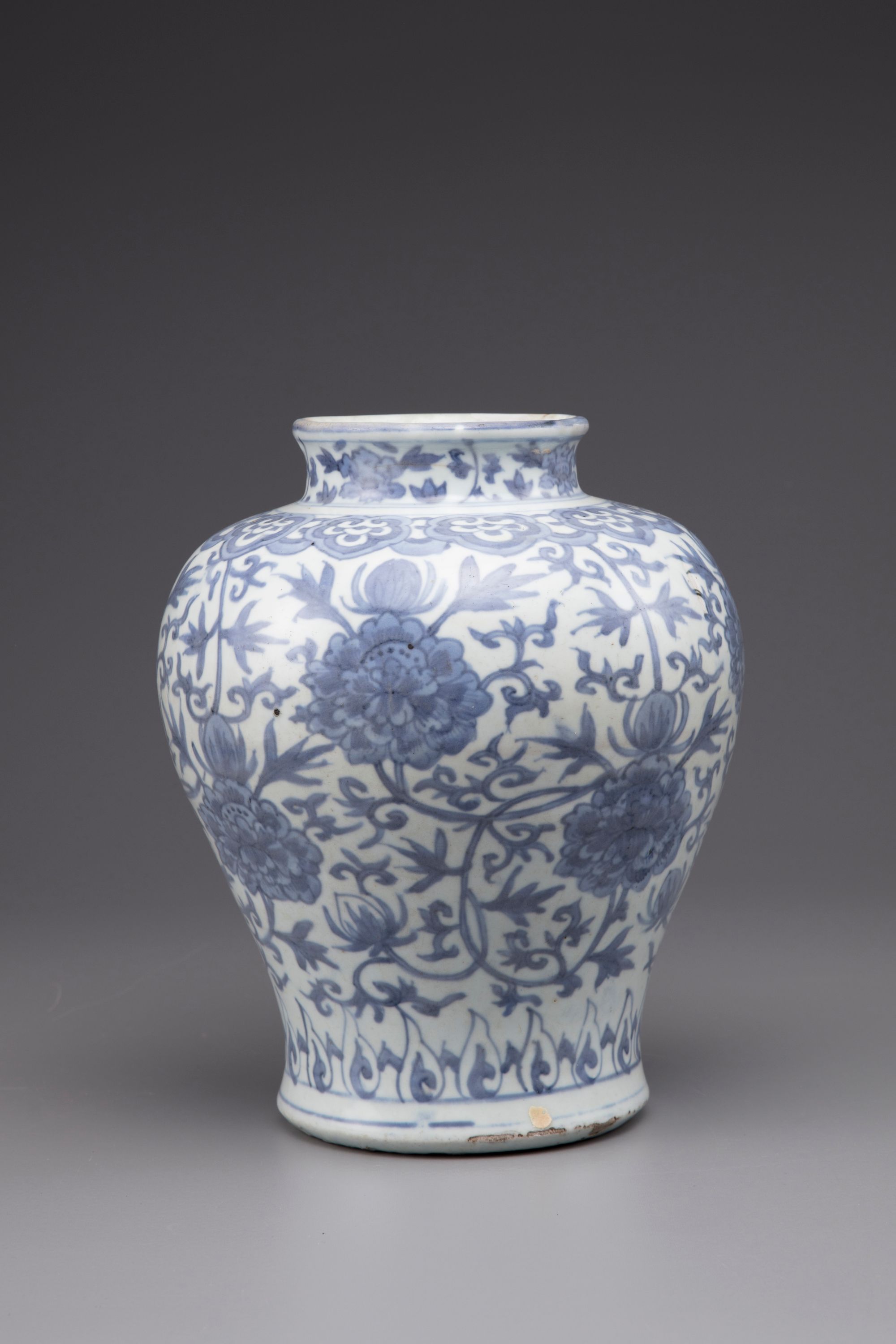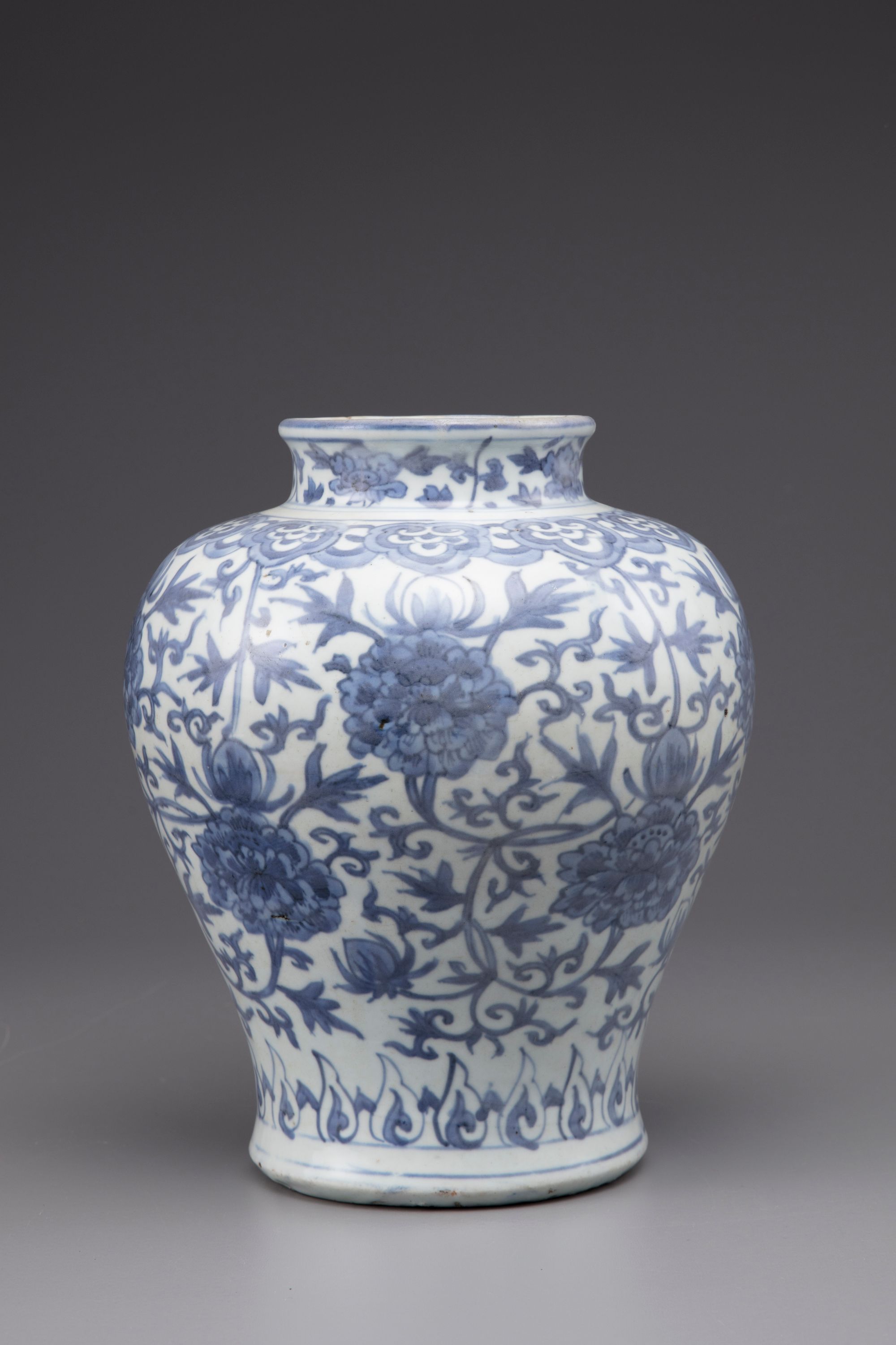 Baluster shaped vase with short flaring neck, decorated in underglaze blue, with a peony sprays under a rudi-head border.