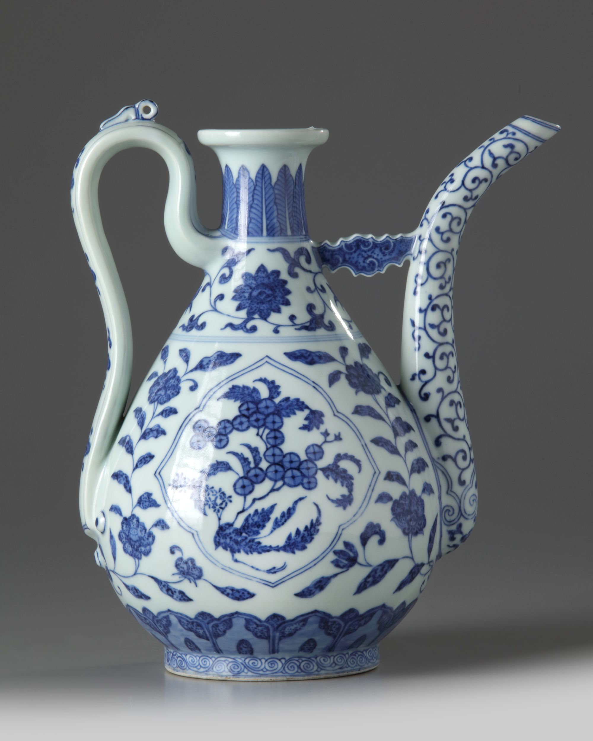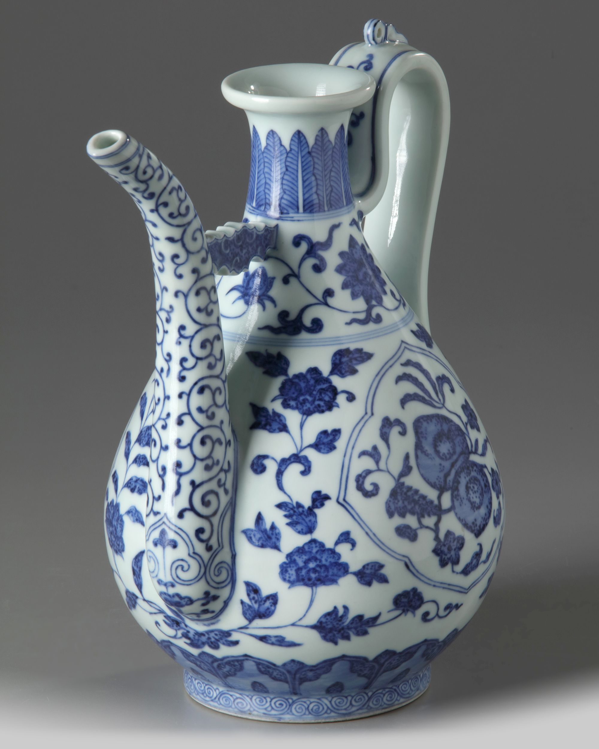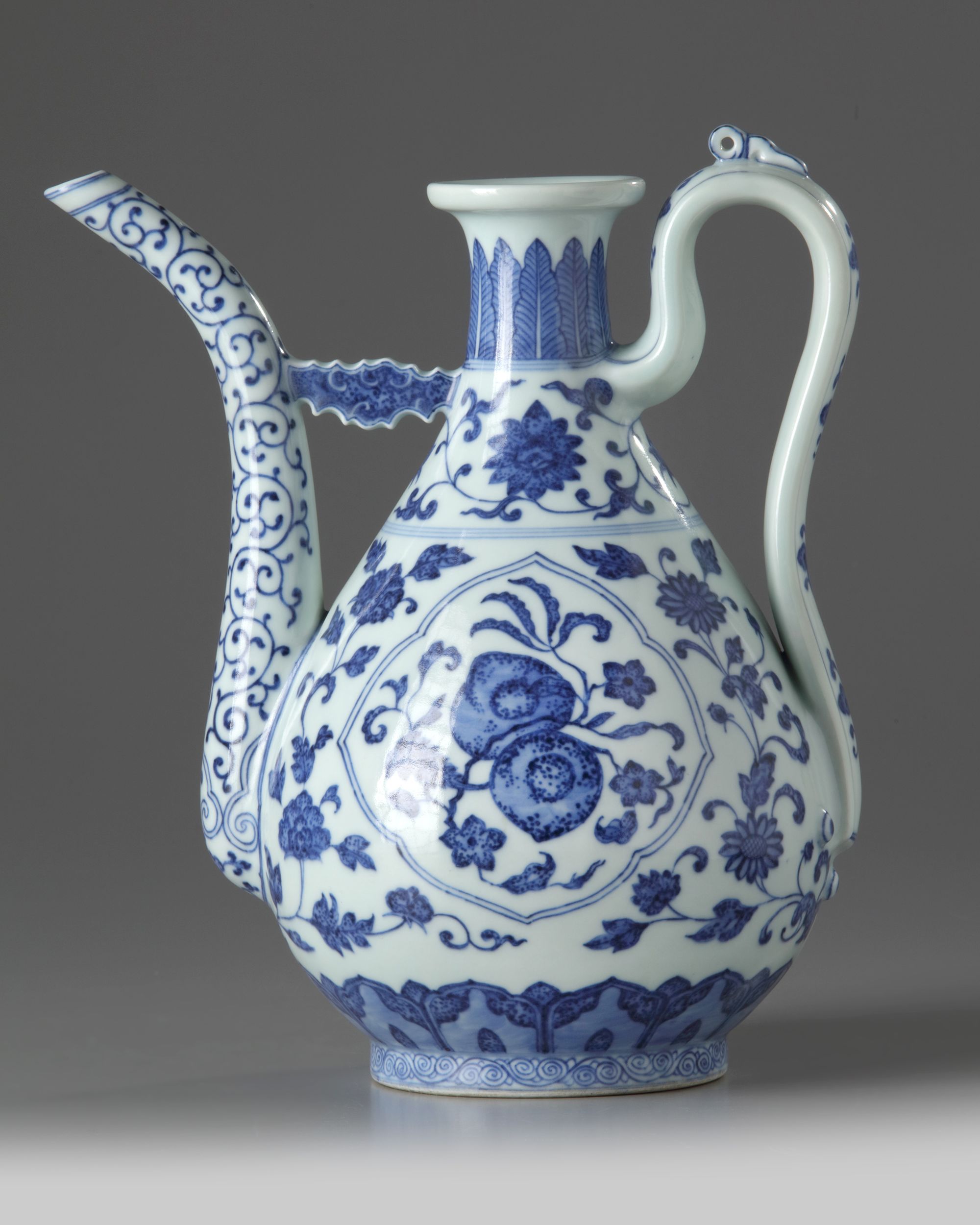 The ewer is decorated in cobalt blue imitating 'heaping and piling', the body is decorated with two panels, one enclosing a peach branch and the other a loquat branch, all surrounded by further flowering branches and a band of lotus scrolls below a band of stiff leaves. The curved handle is decorated with lingzhi sprigs and the spout with further scrolls.