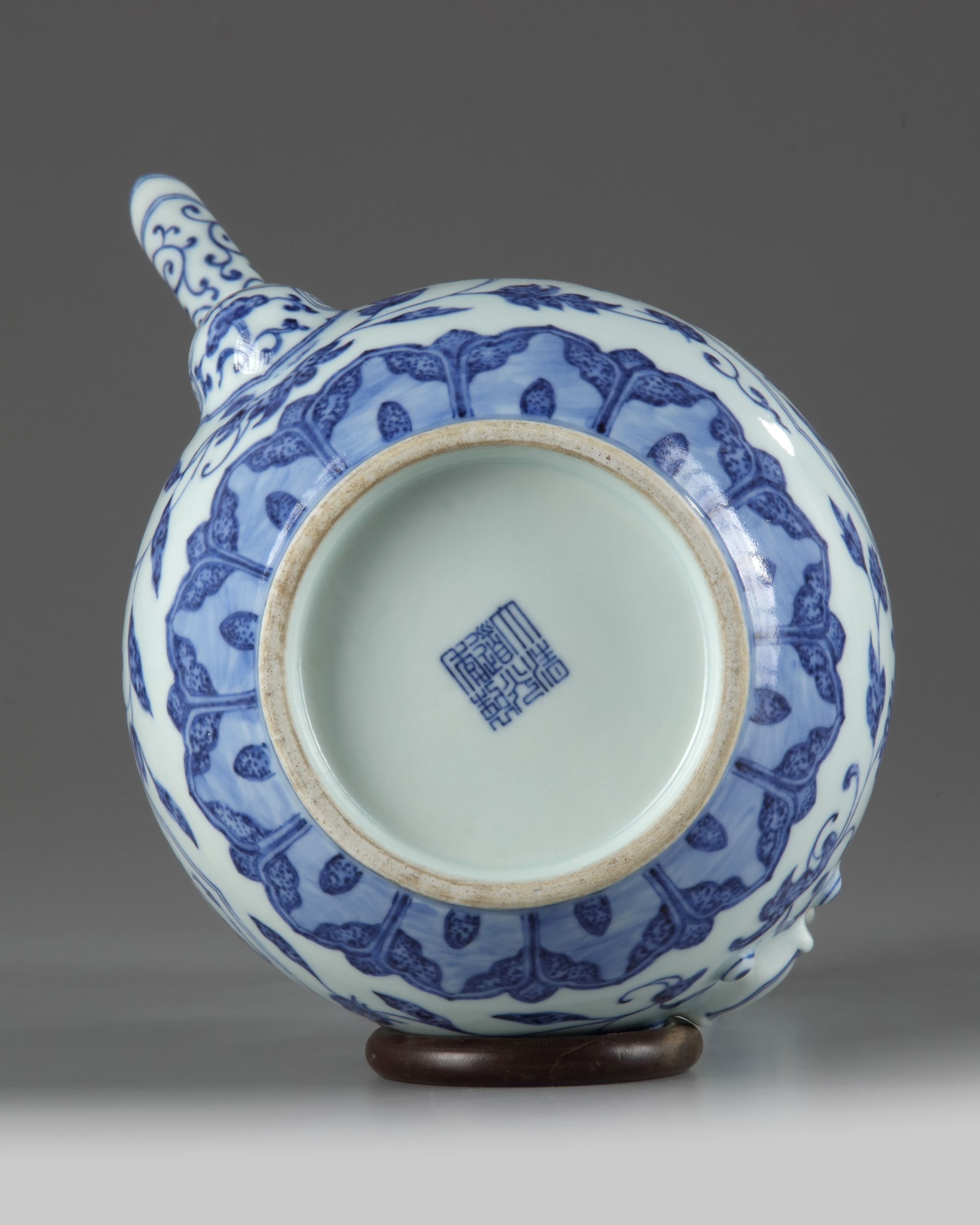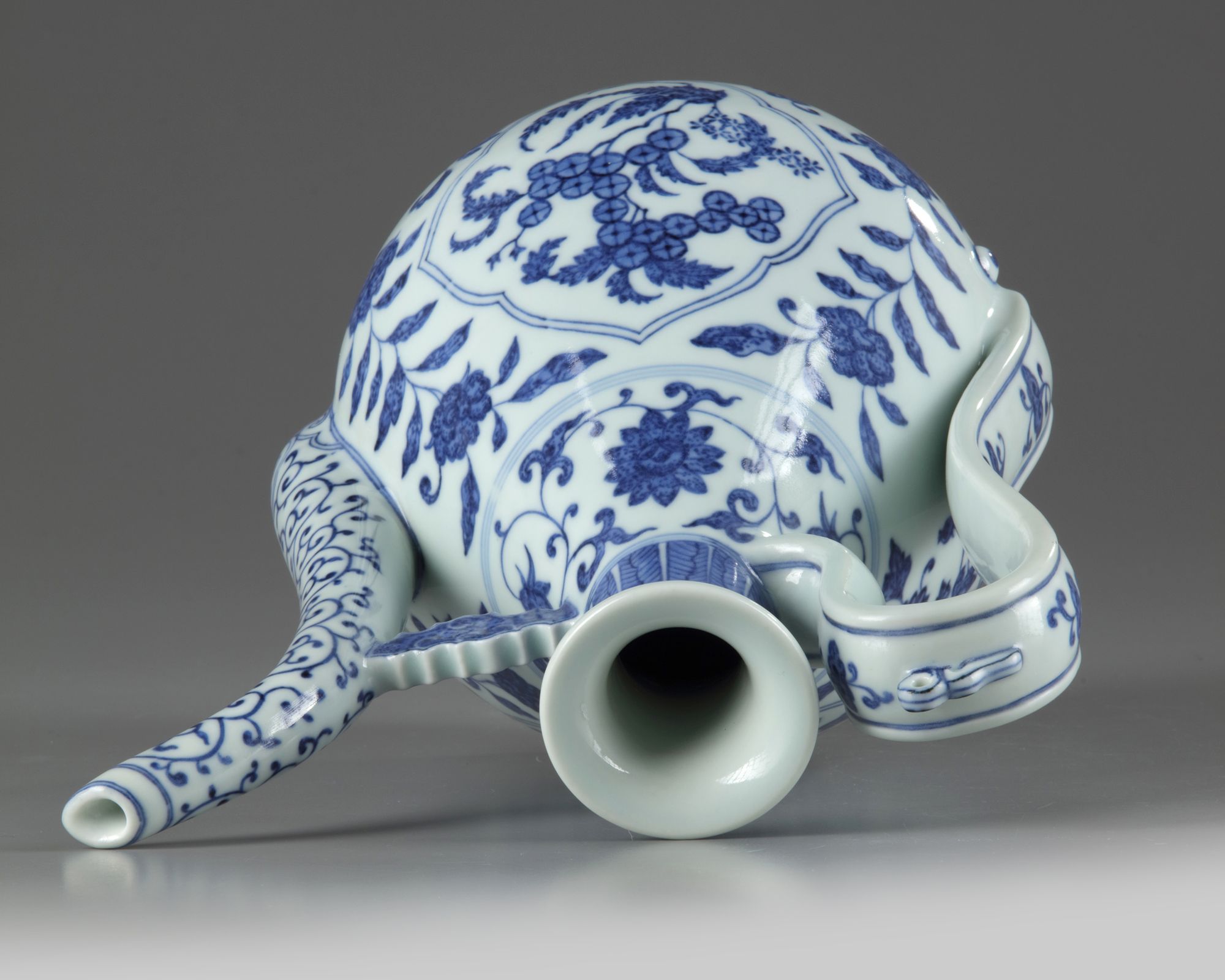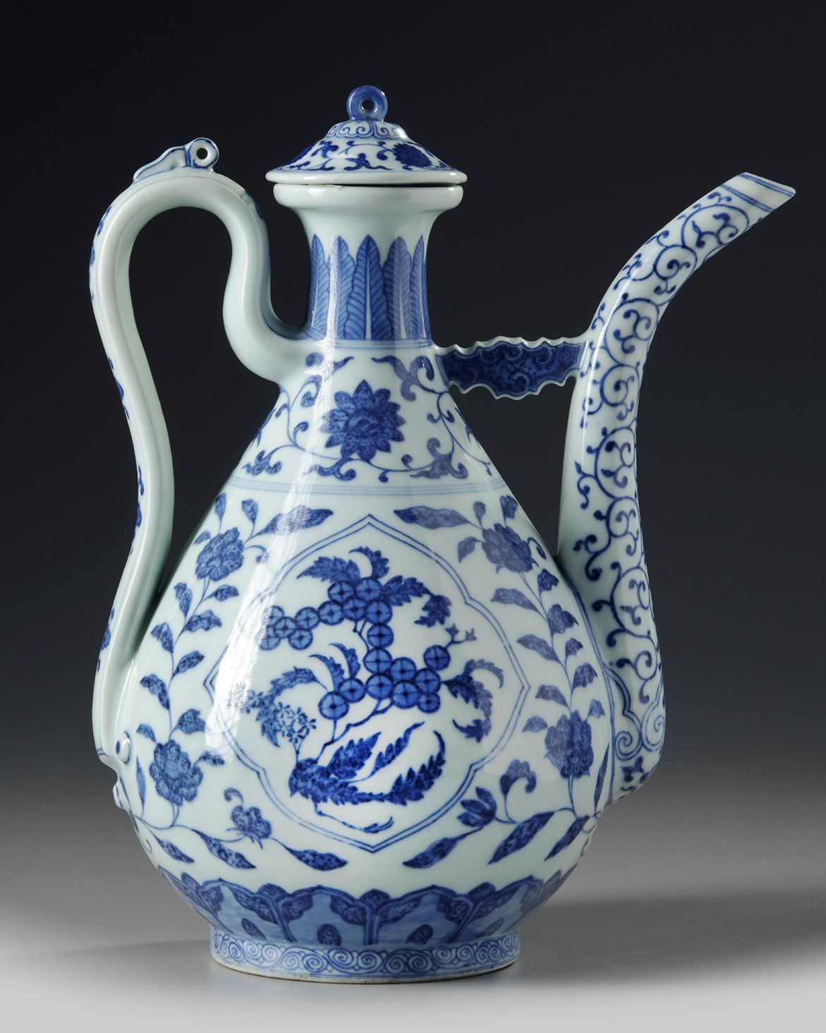 The ewer is decorated in cobalt blue imitating 'heaping and piling', the body is decorated with two panels, one enclosing a peach branch and the other a loquat branch, all surrounded by further flowering branches and a band of lotus scrolls below a band of stiff leaves. The curved handle is decorated with lingzhi sprigs and the spout with further scrolls.