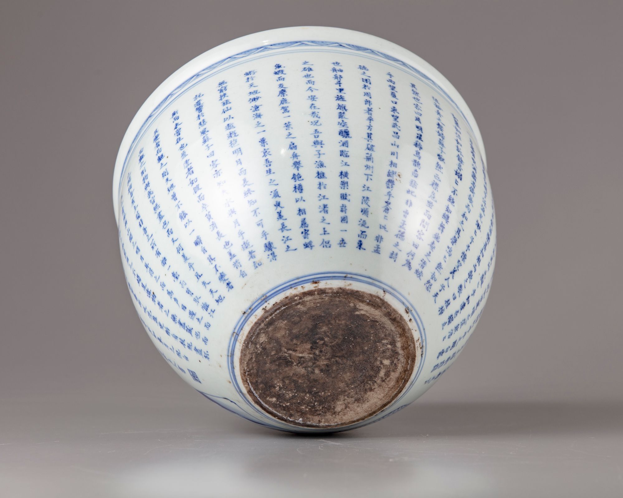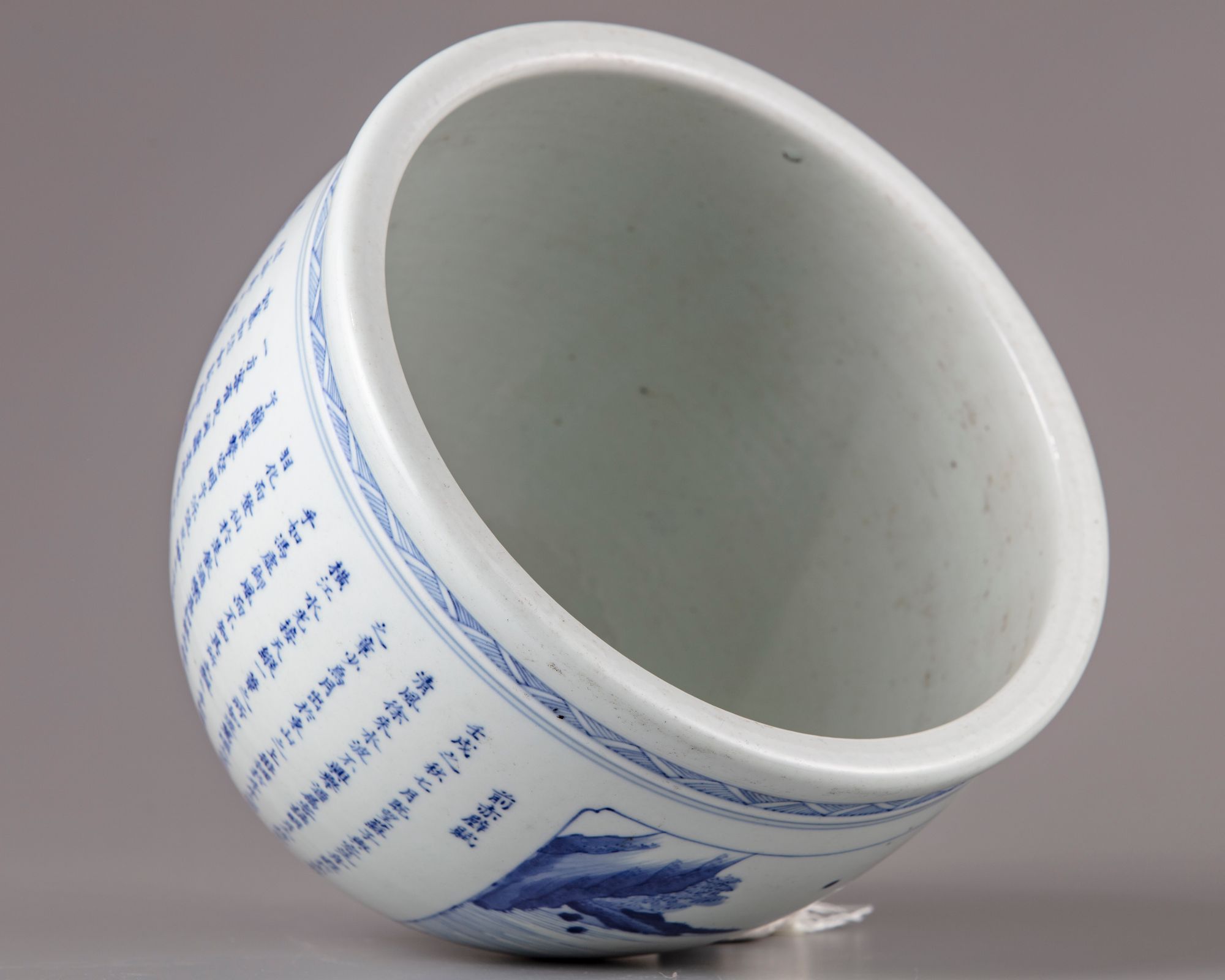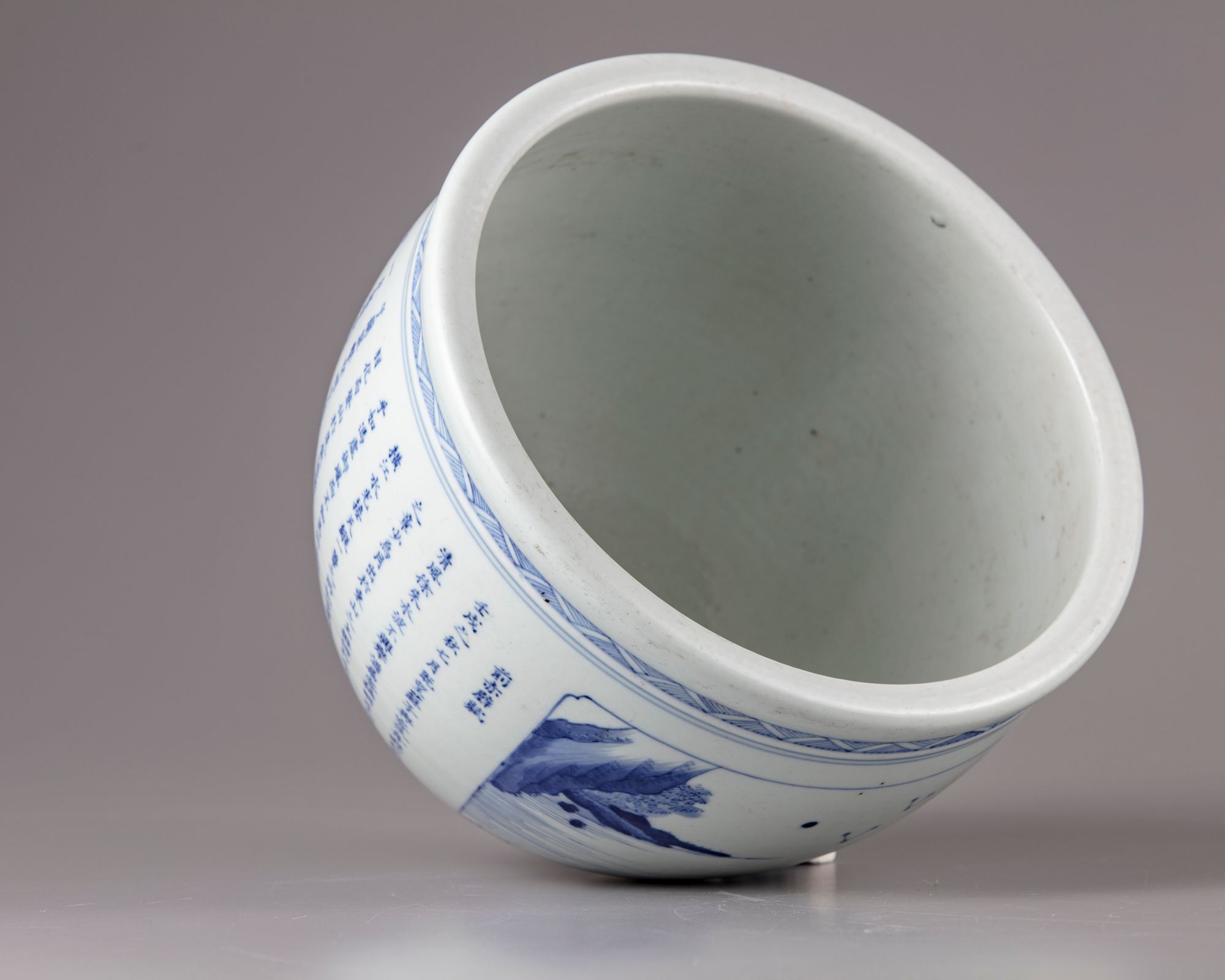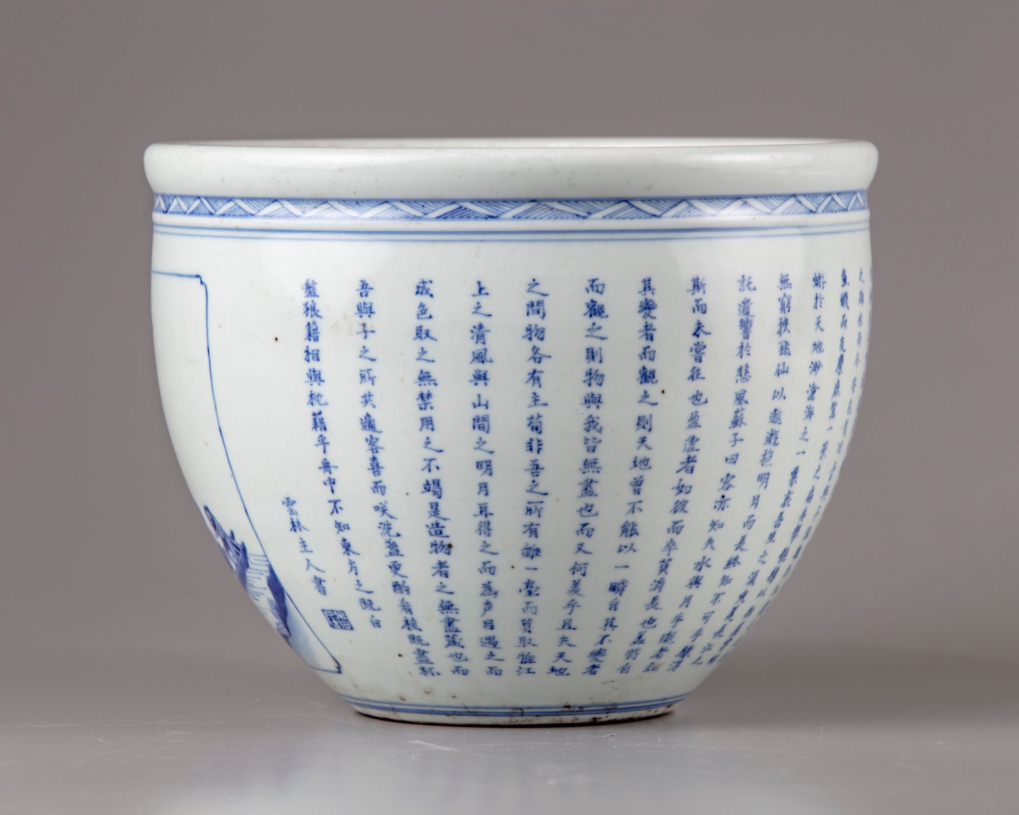The jar is heavy potted, decorated with a panel enclosing a boat in a lake, The reverse with a Chinese calligraphy " long text of poem".