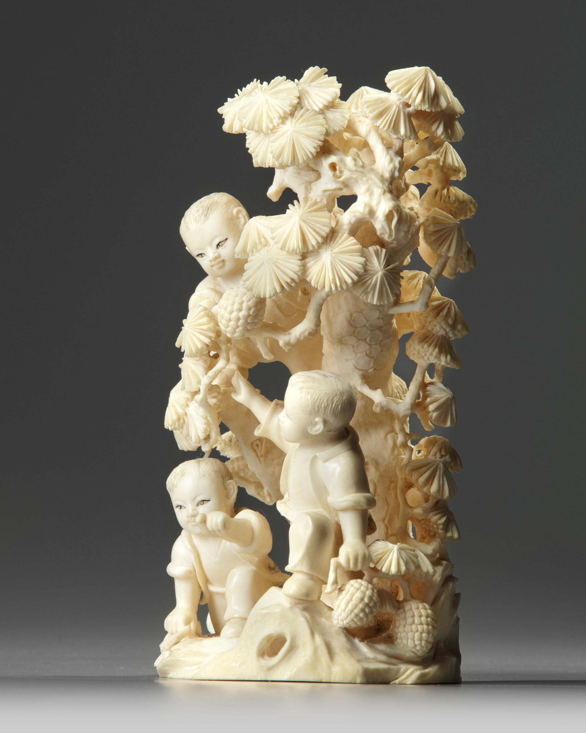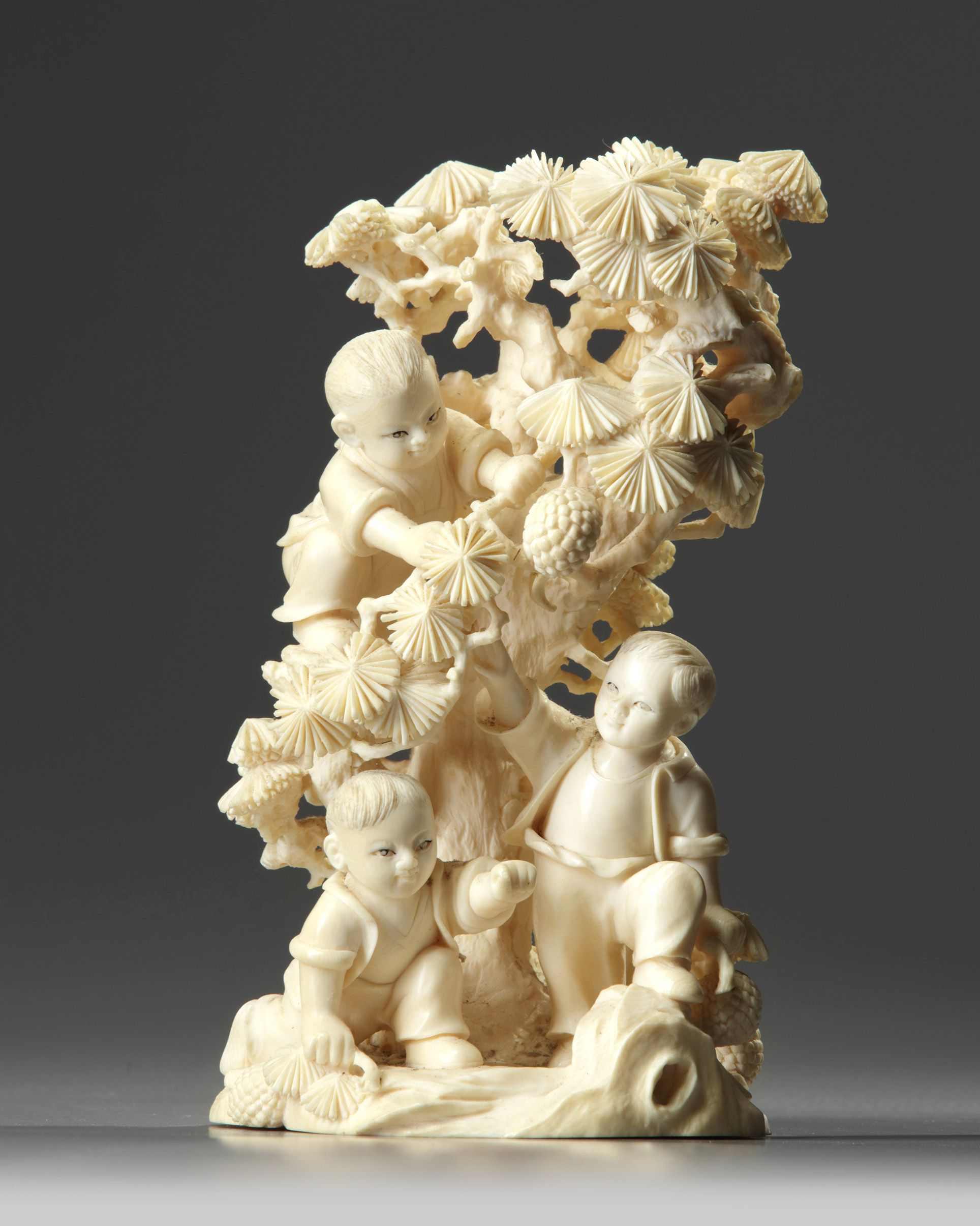 The group is carved and pierced in the round as three boys playing around a gnarled pine tree, two of them hold branches with pine cones while the third clambers up the branches.
