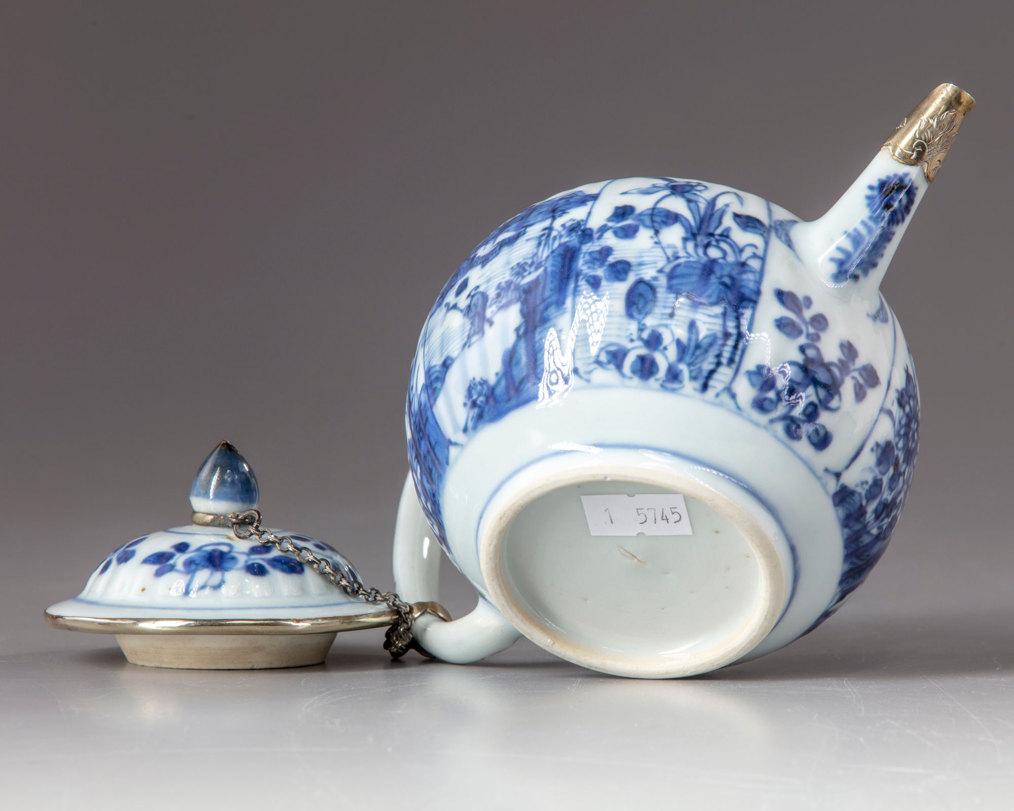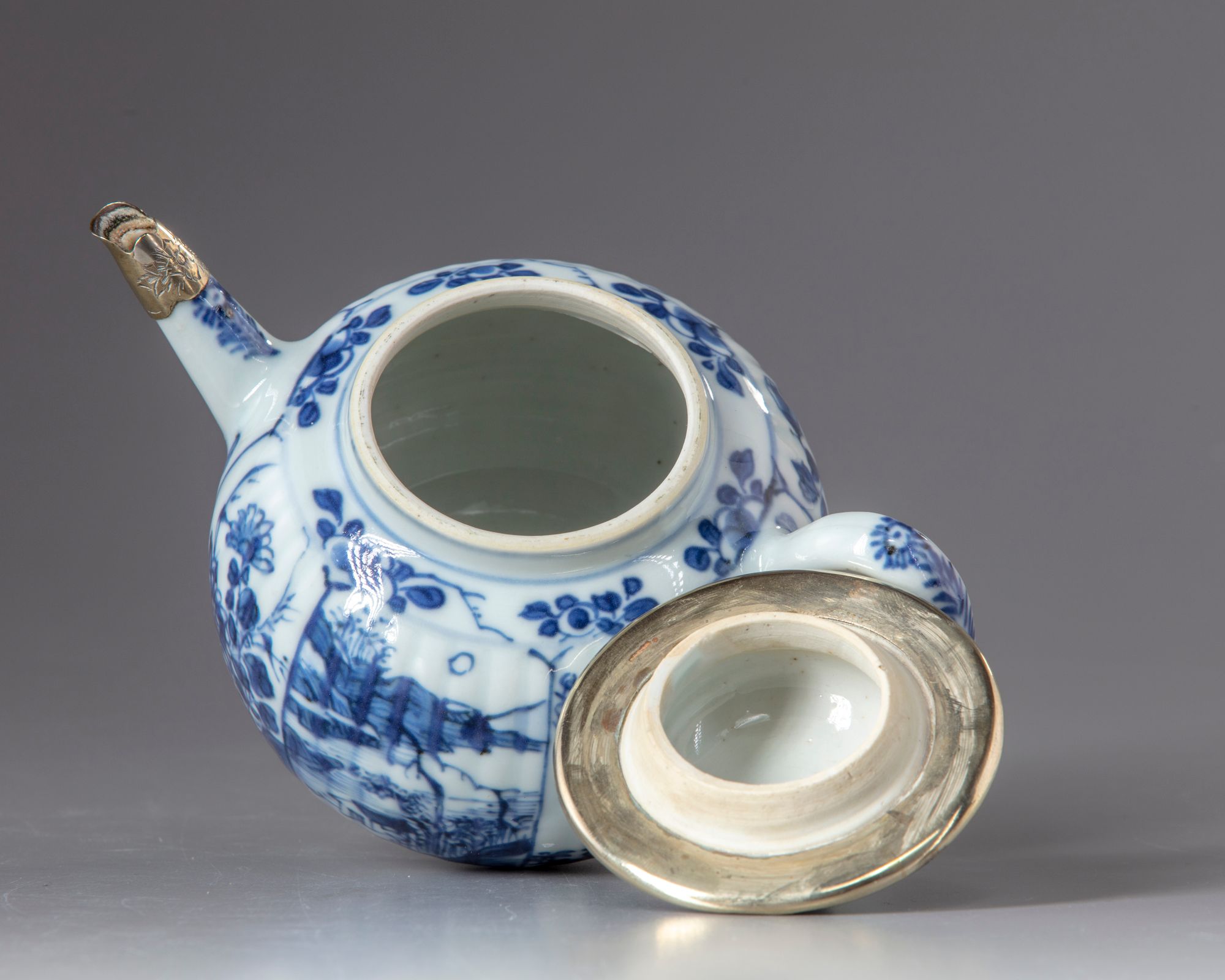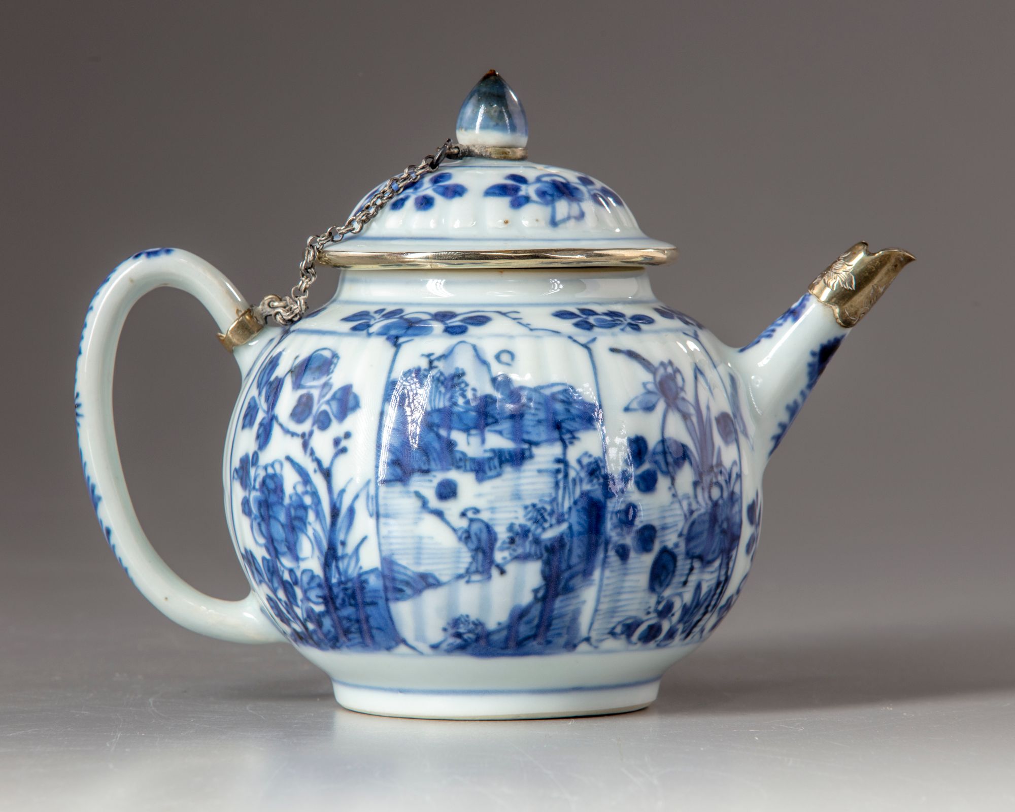 A Chinese porcelain teapot with a cover, a small spout and a handle, decorated in cobalt-blue with alternating panels enclosing a landscape and flowers on a ribbed ground.Further painted with flower sprigs and silver mounting.