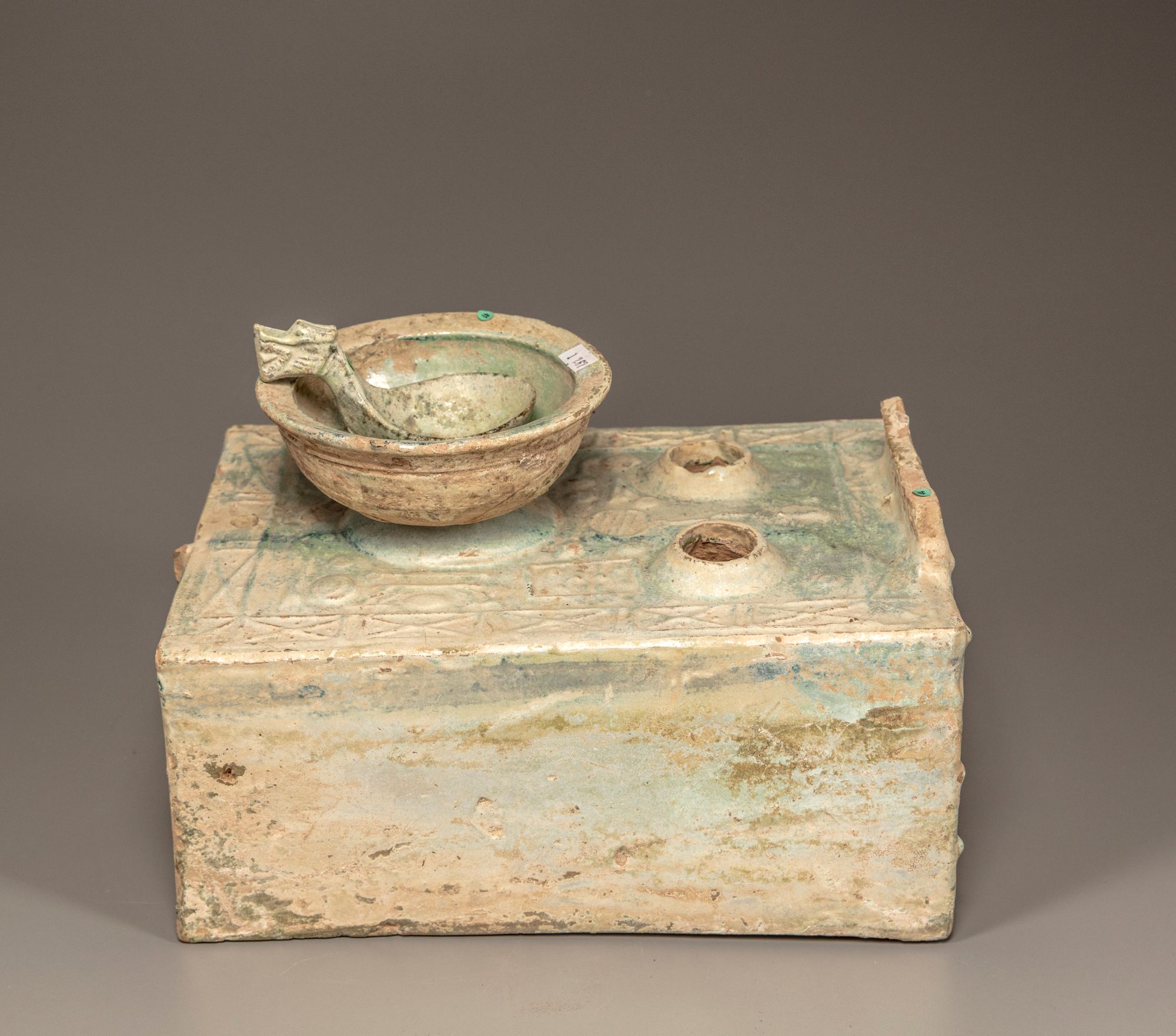 The stove is of rectangular form decorated to the upper surface with geometric designs with three cooking apertures. The bowl is modelled with a lipped rim, the exterior with a double bowstring band. The deep ladle is modelled with a dragon-head handle.
