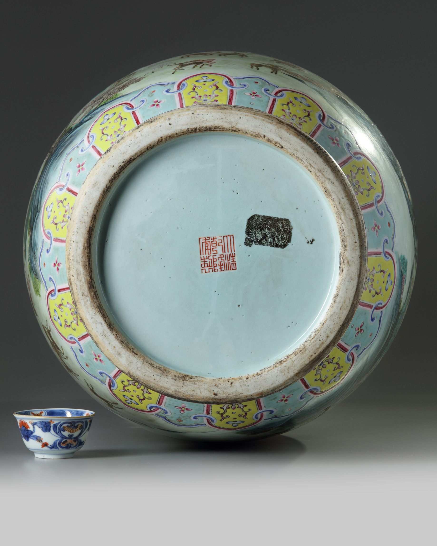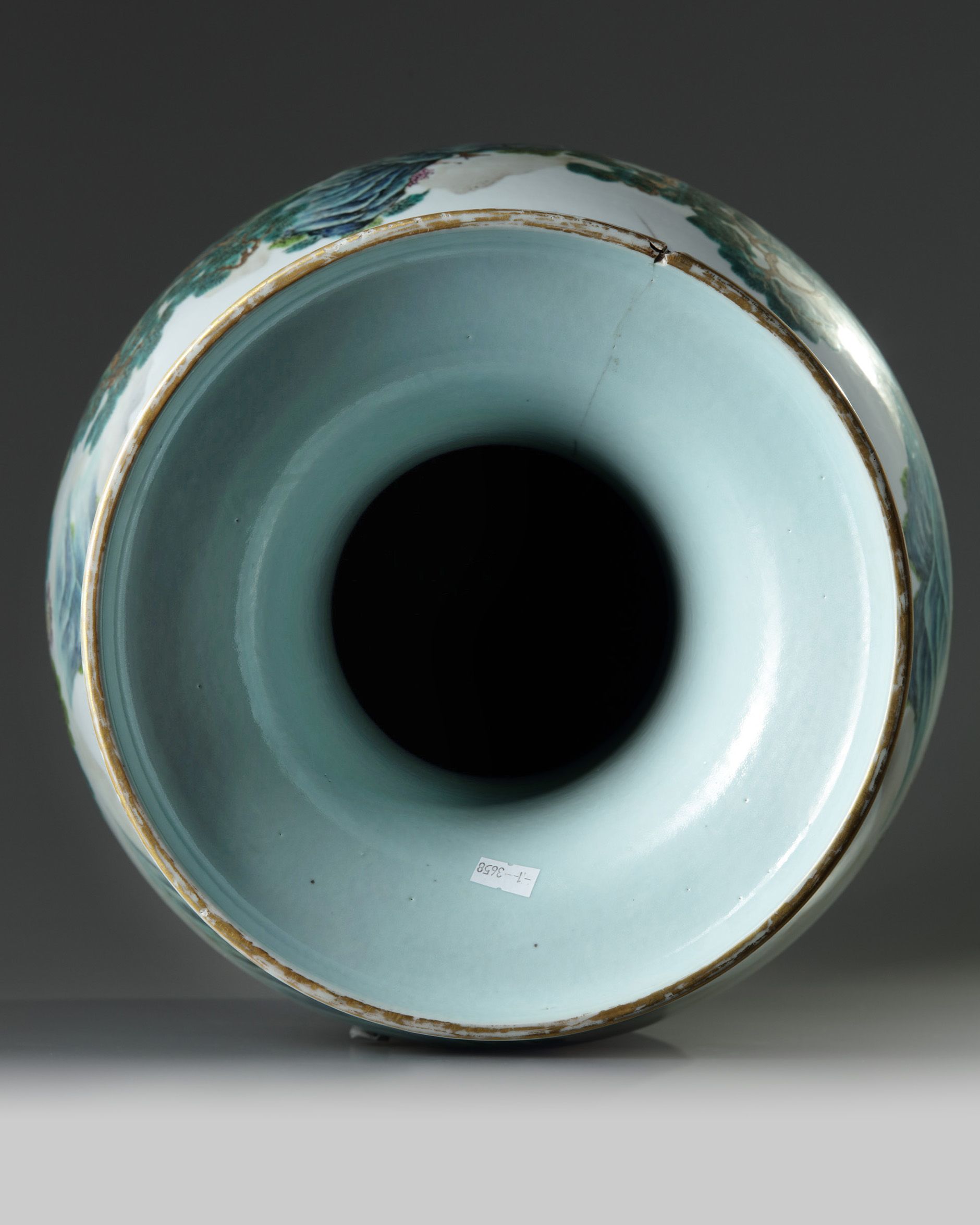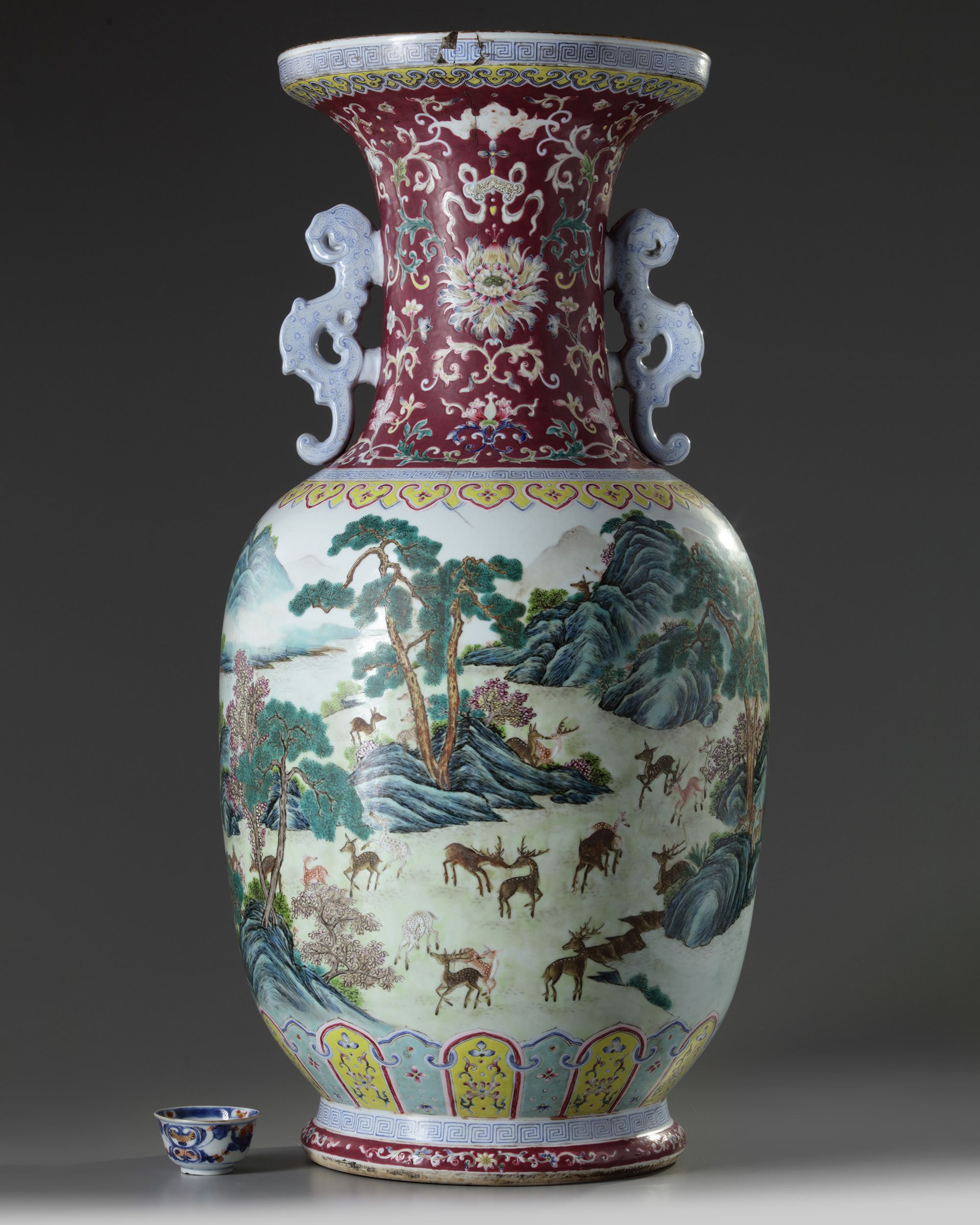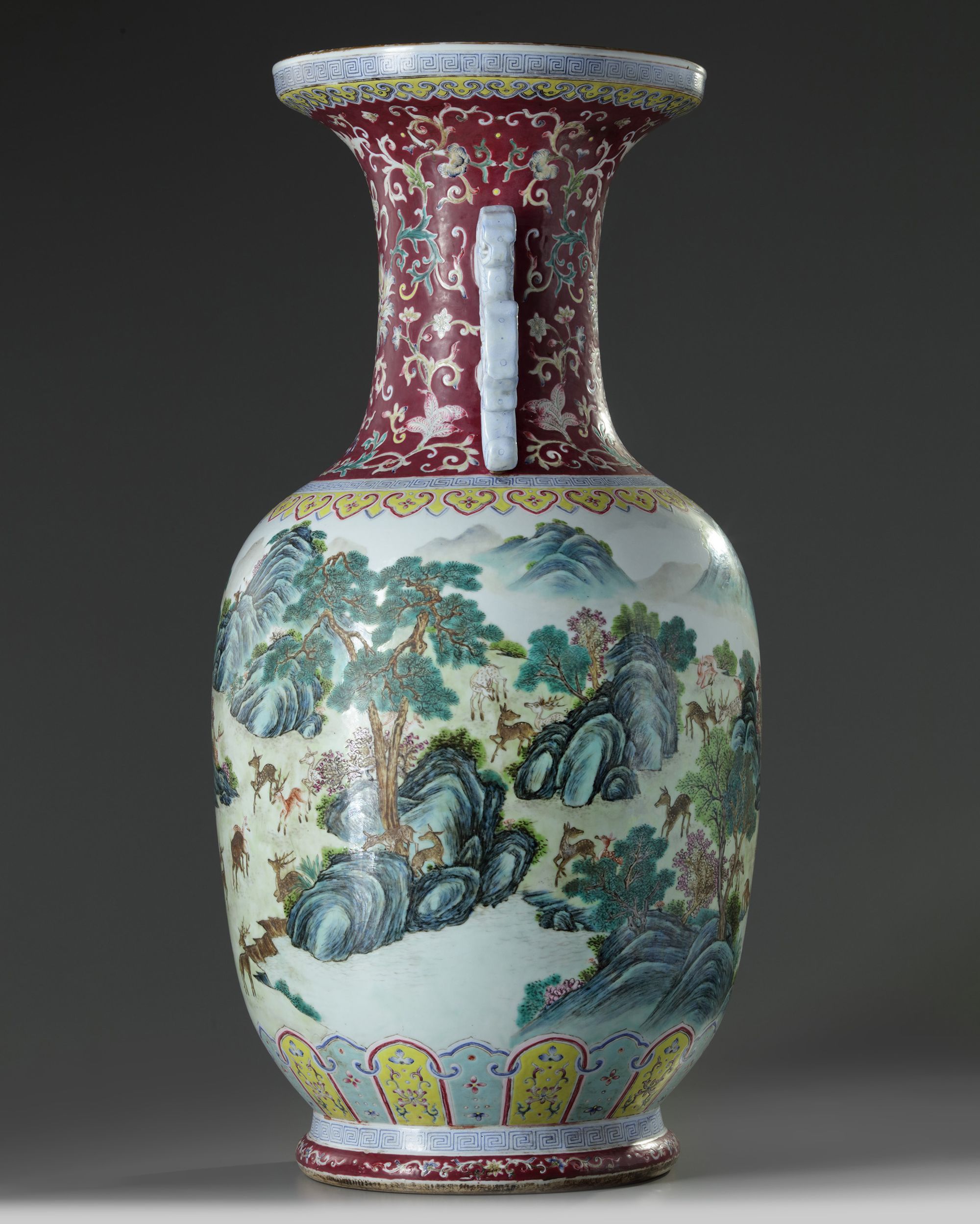 The vase is decorated with a continuous scene of deer in a mountainous river landscape below scrolling lotus on a puce ground. The neck is decorated with two blue-enamelled stylised handles and the turquoise-glazed base has an apocryphal Qianlong mark.