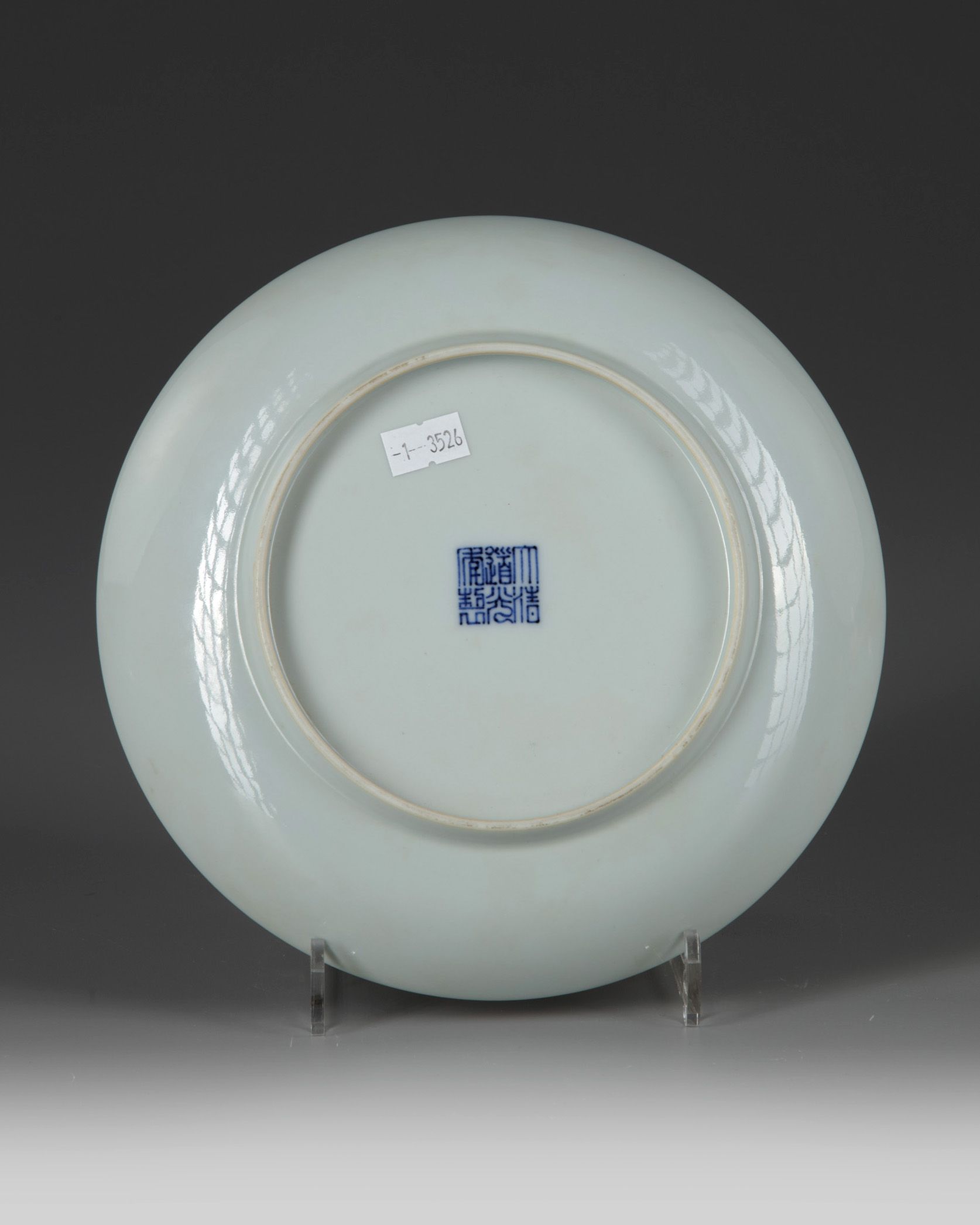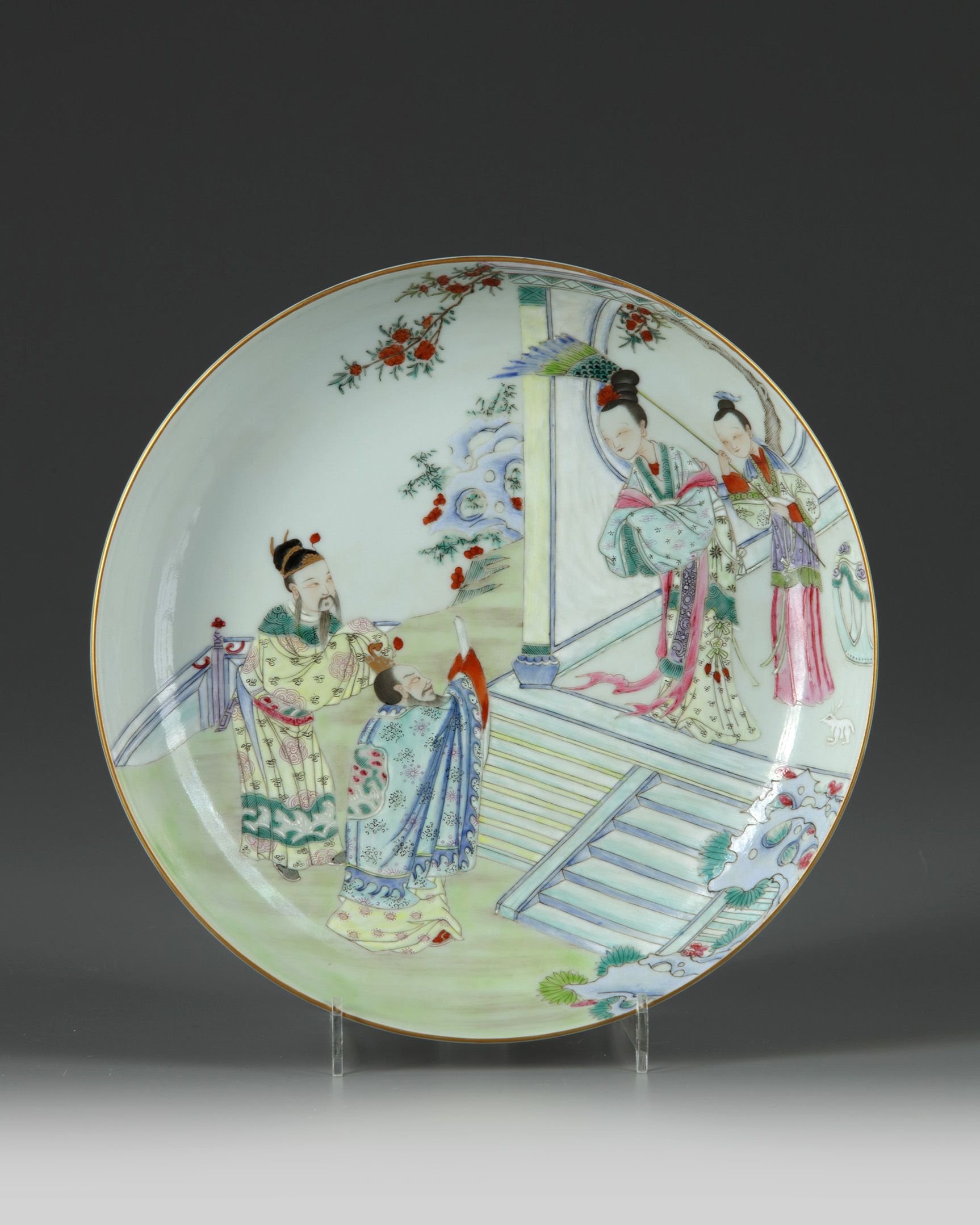 The interior is enamelled with a scene depicting two scholar officials greeting a lady with her attendant while a white rabbit looks on. The base with an apocryphal Daoguang mark.