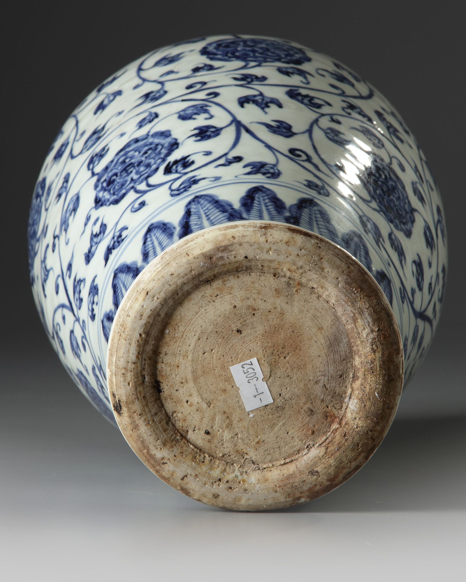 The vase is decorated to the body in various shades of cobalt blue with a wide band enclosing leafy scrolling peonies, all below a lotus meander to the shoulder and a stiff leaf band to the foot. The base is unglazed.