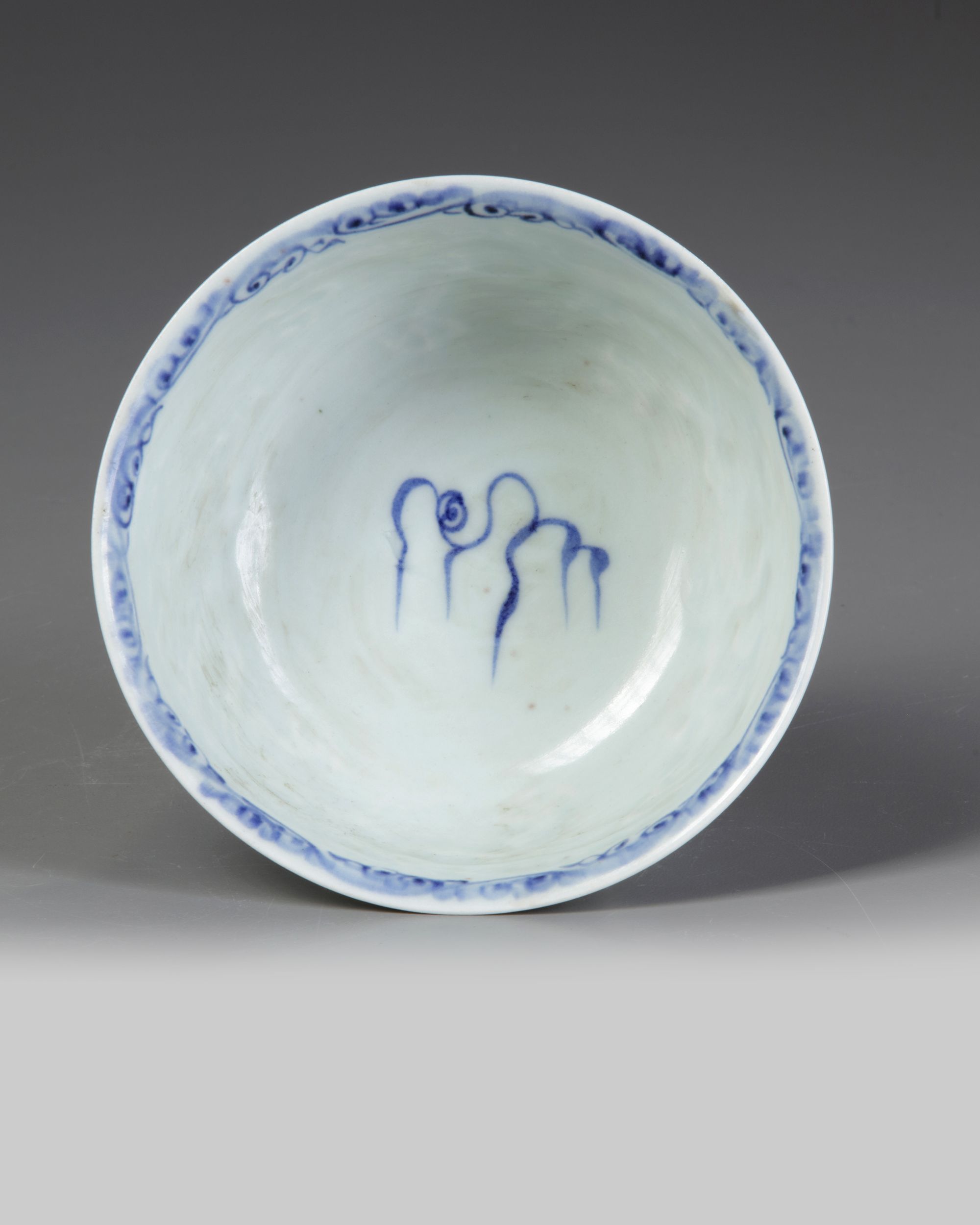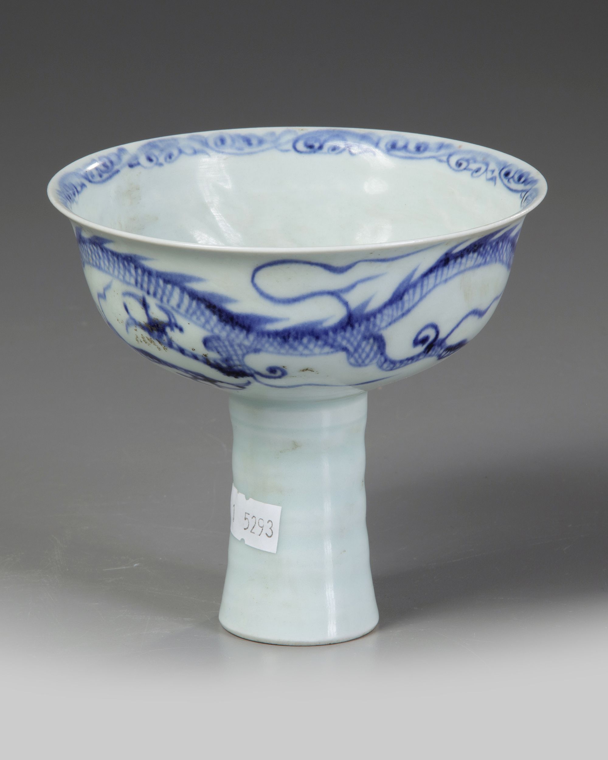 The stem cup is decorated to the interior in cobalt-blue with a flaming pearl, in low relief with a dragon, to the exterior with a three-clawed dragon chasing a flaming pearl.