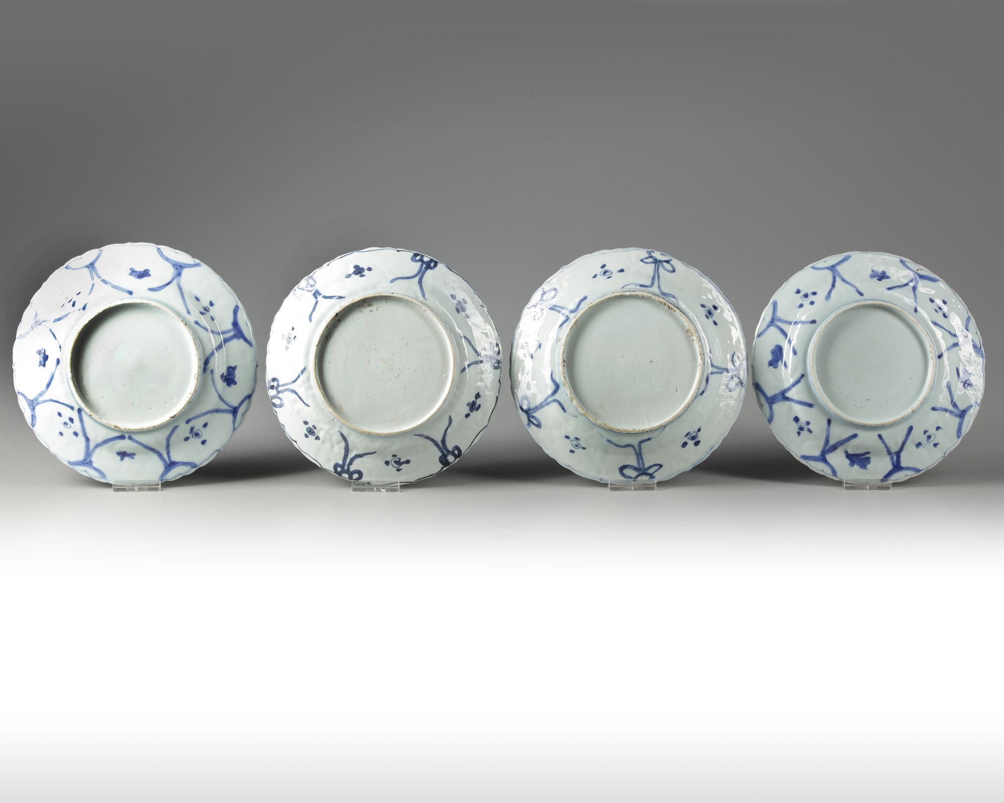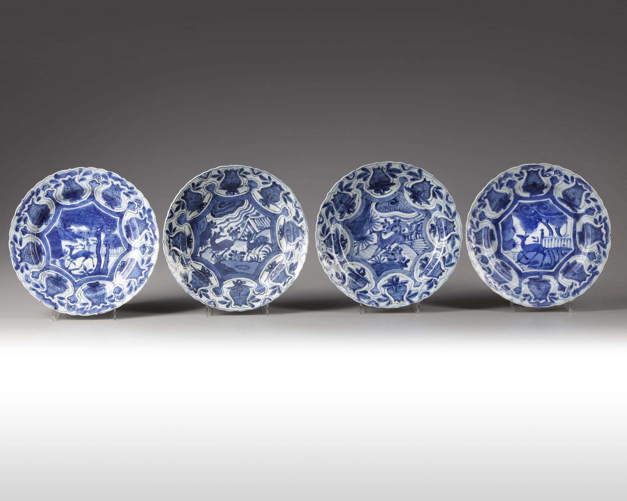 Found Chinese porcelain dishes, decorated with a central panel enclosing a deer in a fenced garden, to the sides with pomegranate.