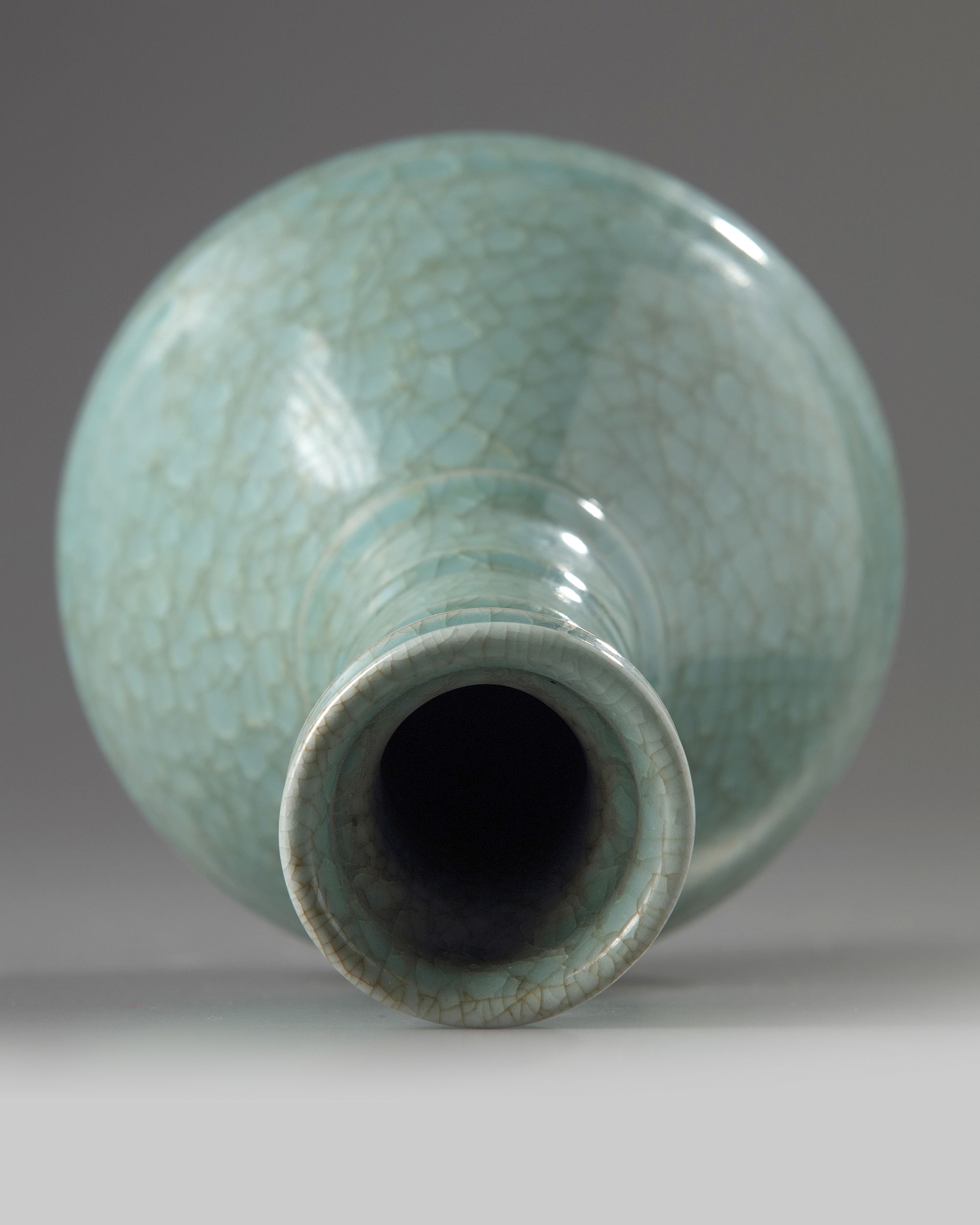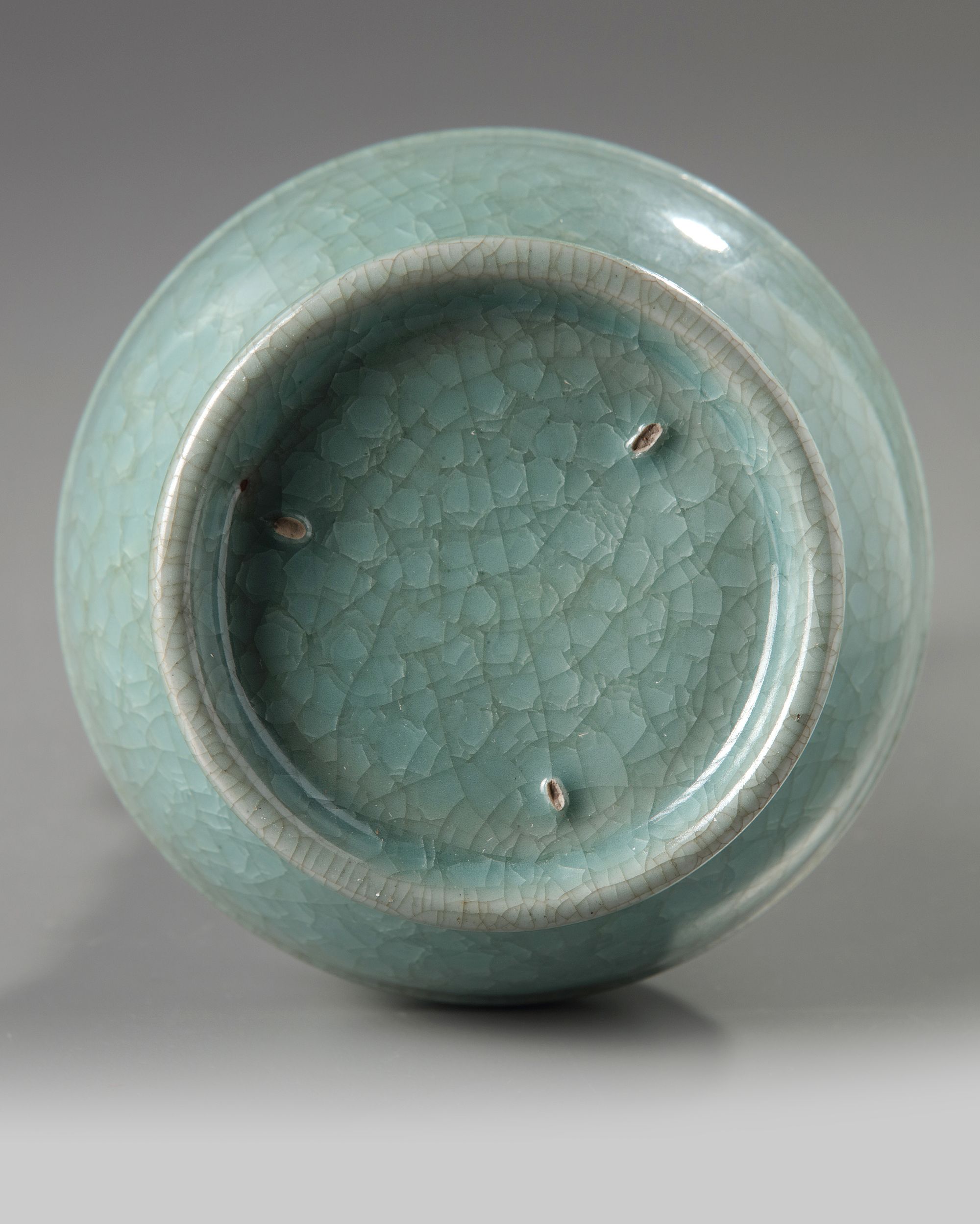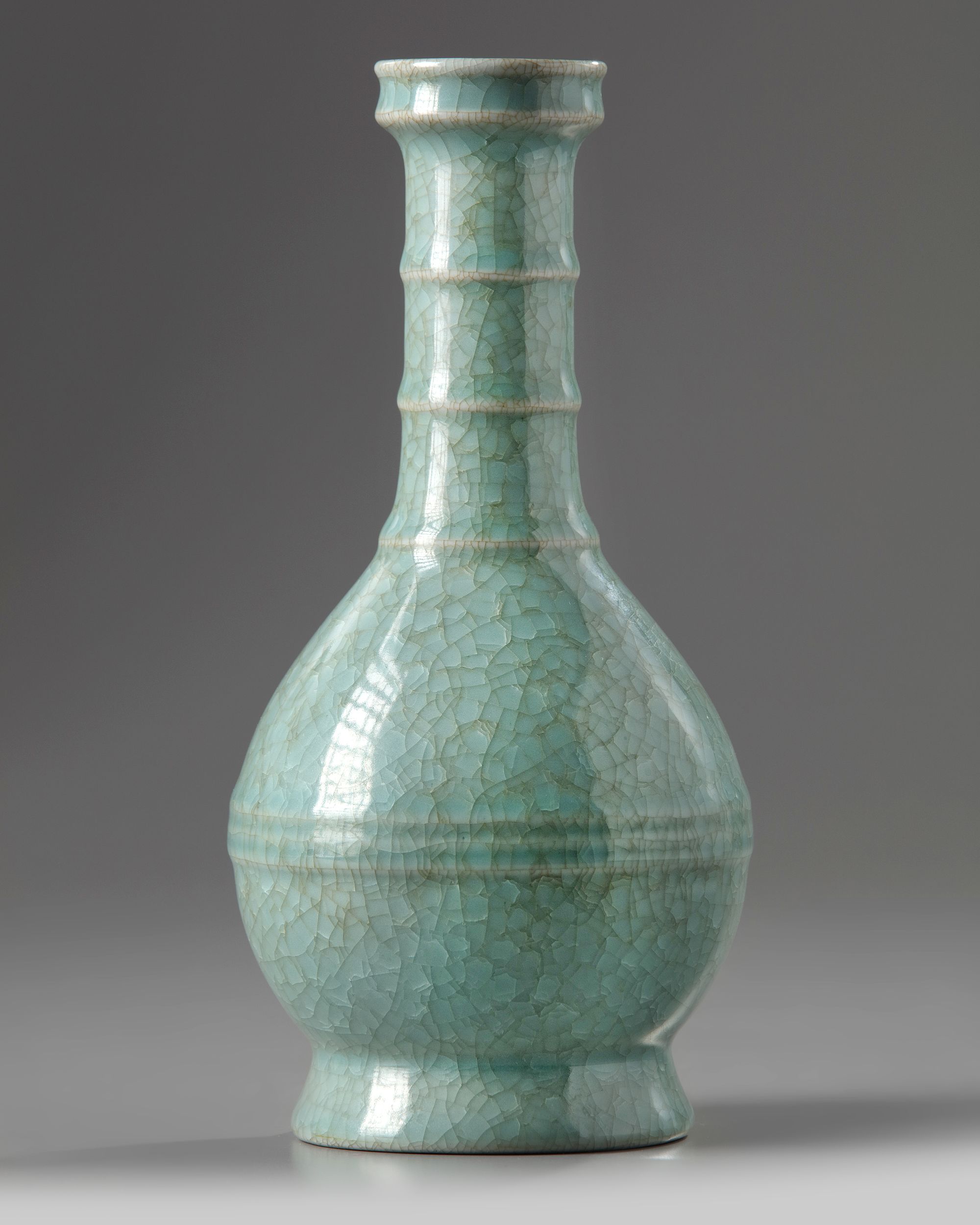 The vase is decorated with evenly-spaced ribs to the neck and shoulder below a galleried rim. The body is decorated with a set of three bands.