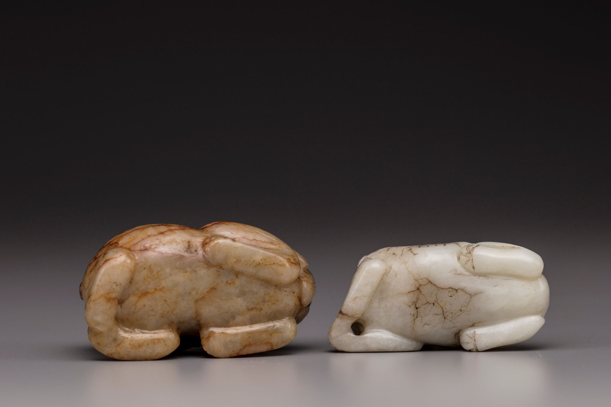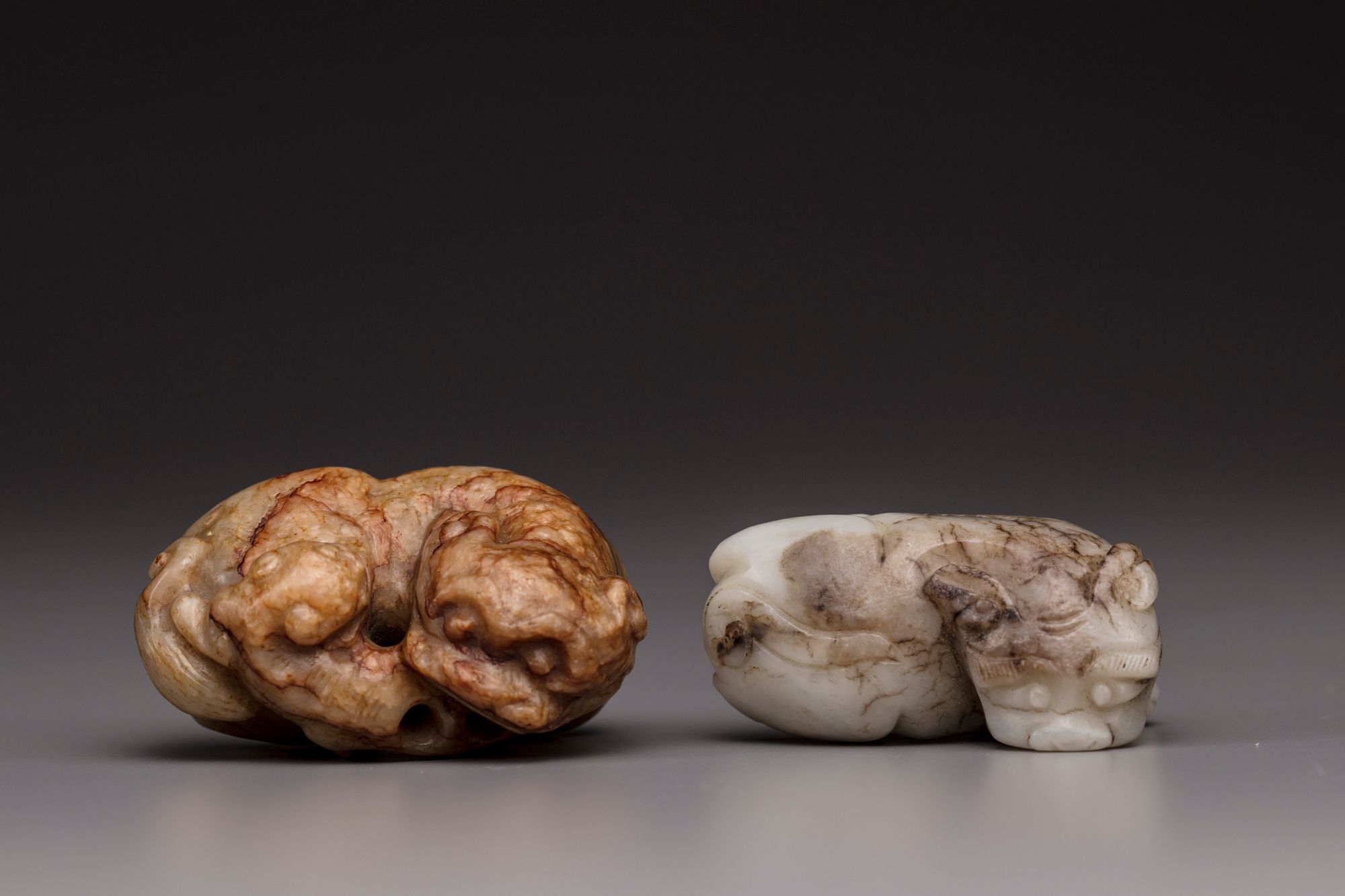 The first is carved as a Buddhist lion with its feet tucked underneath, the stone is of a white tone with grey inclusions. The second is carved as a Buddhist lion with its cub clambering upon its back. The stone is of a caramel tone with russet veins. With one wood stand.