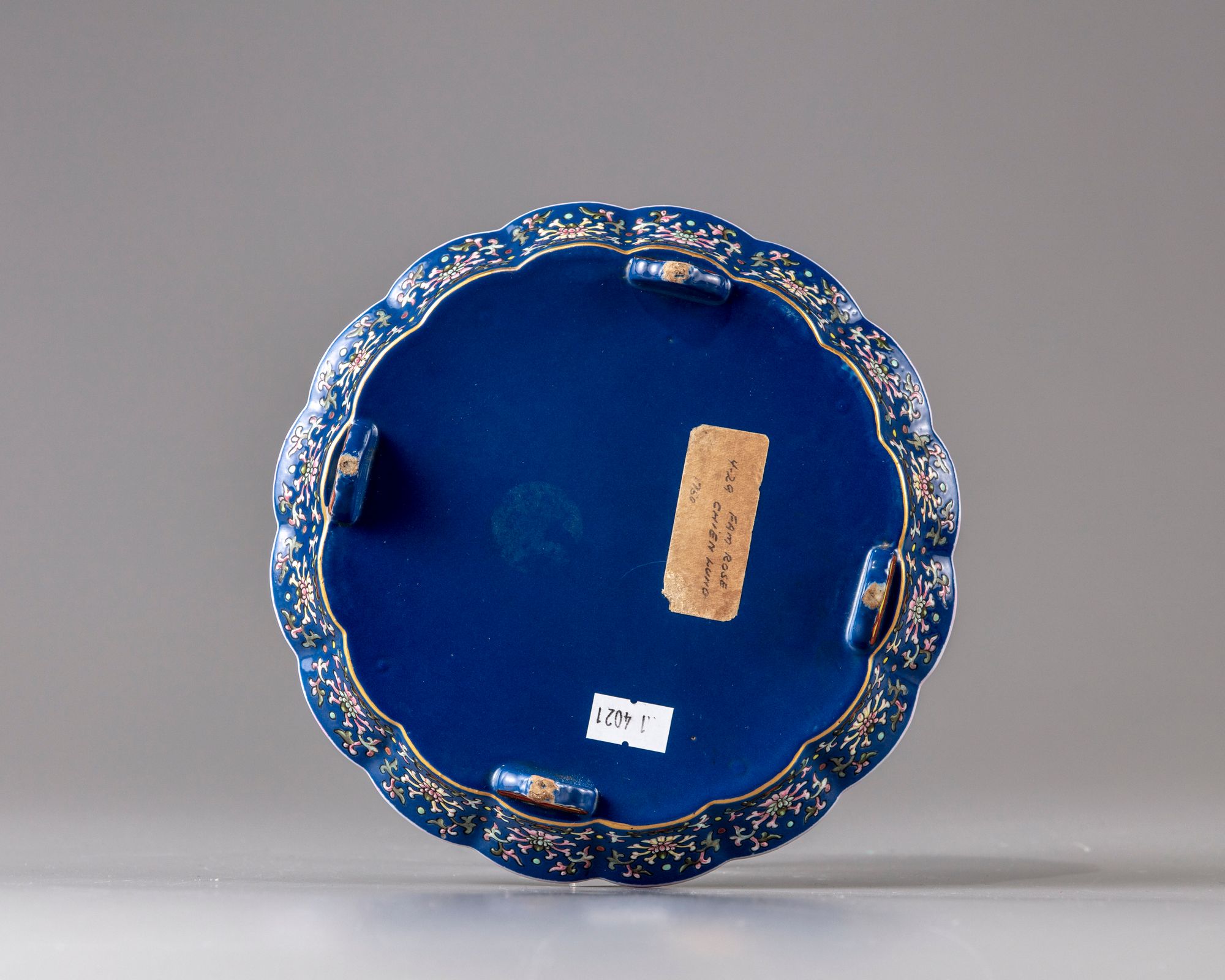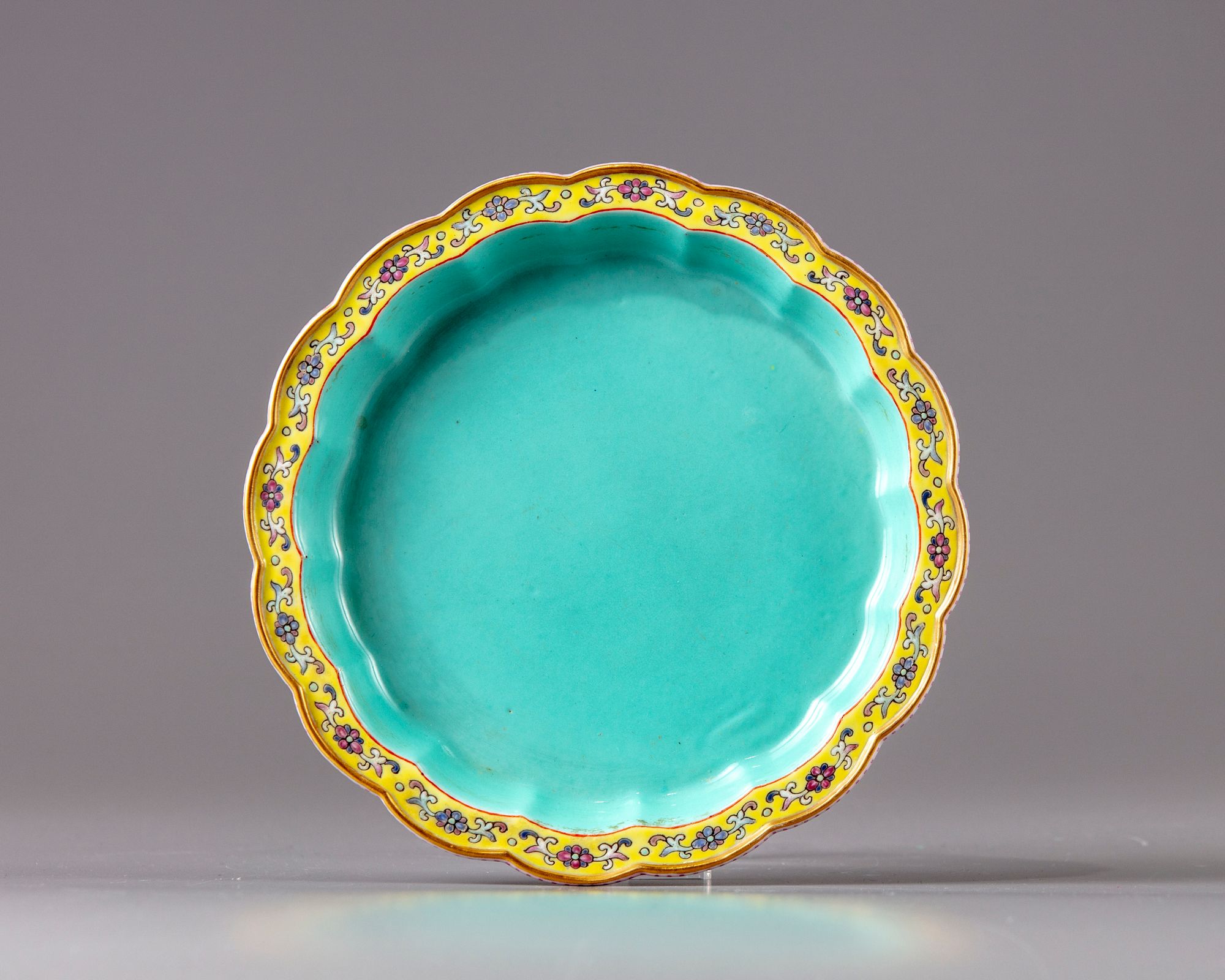 Standing on three small ruyi shaped feet with a gilt reverted rim.The interior is covered with turquoise glaze and the rim decorated with flower scrolls on a yellow background. The lobed sides decorated with lotus ,buds and C-scrolls on a dark blue ground .