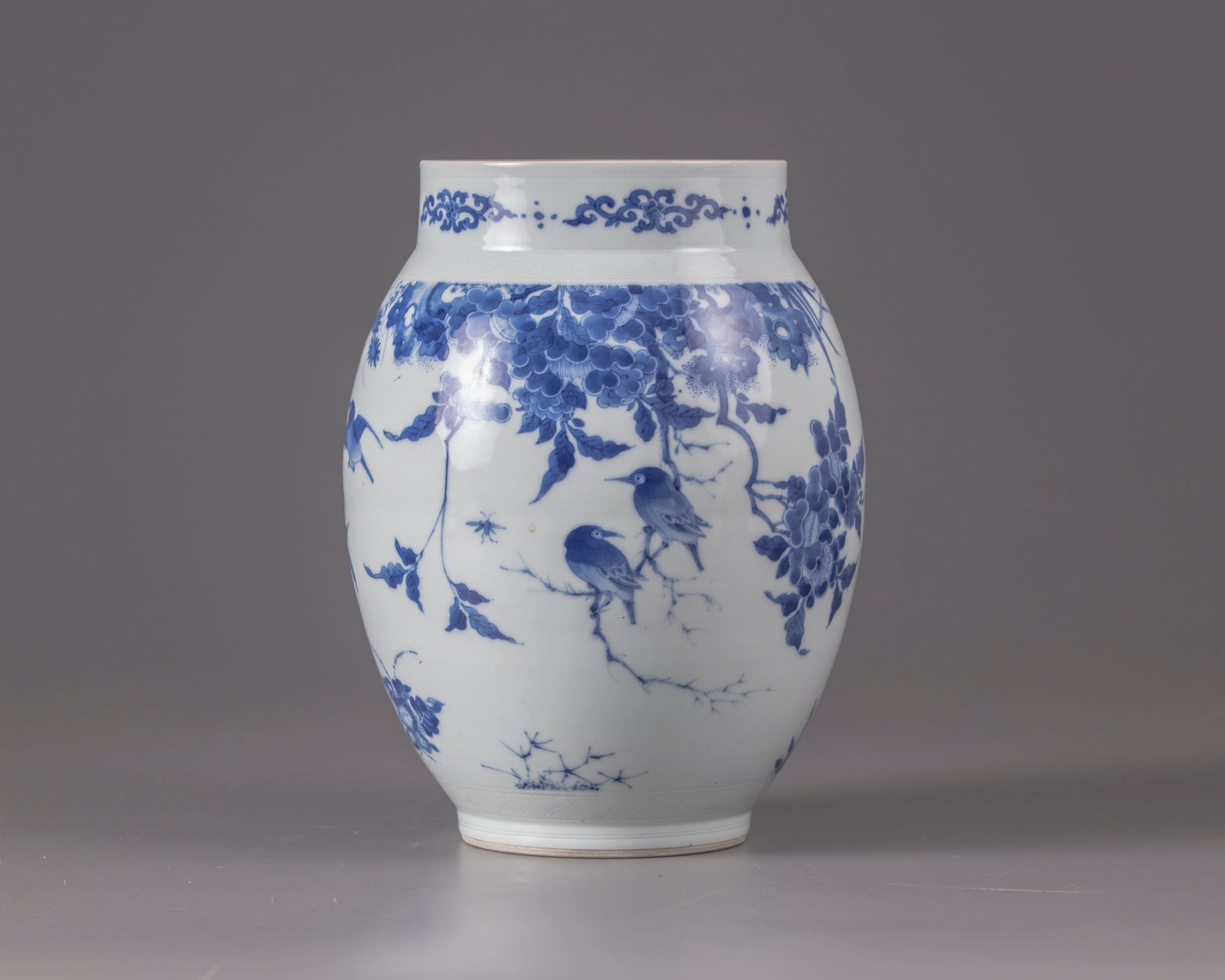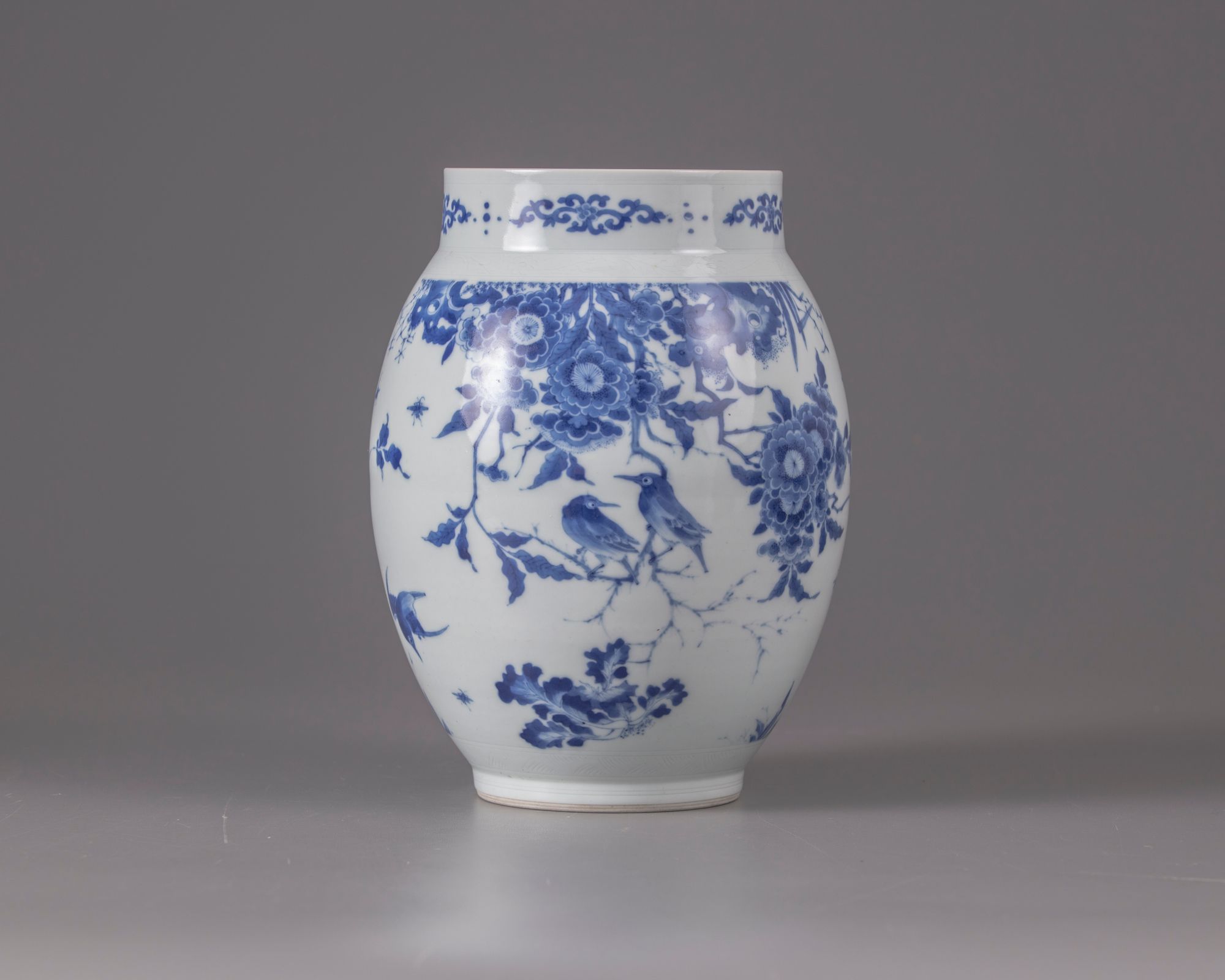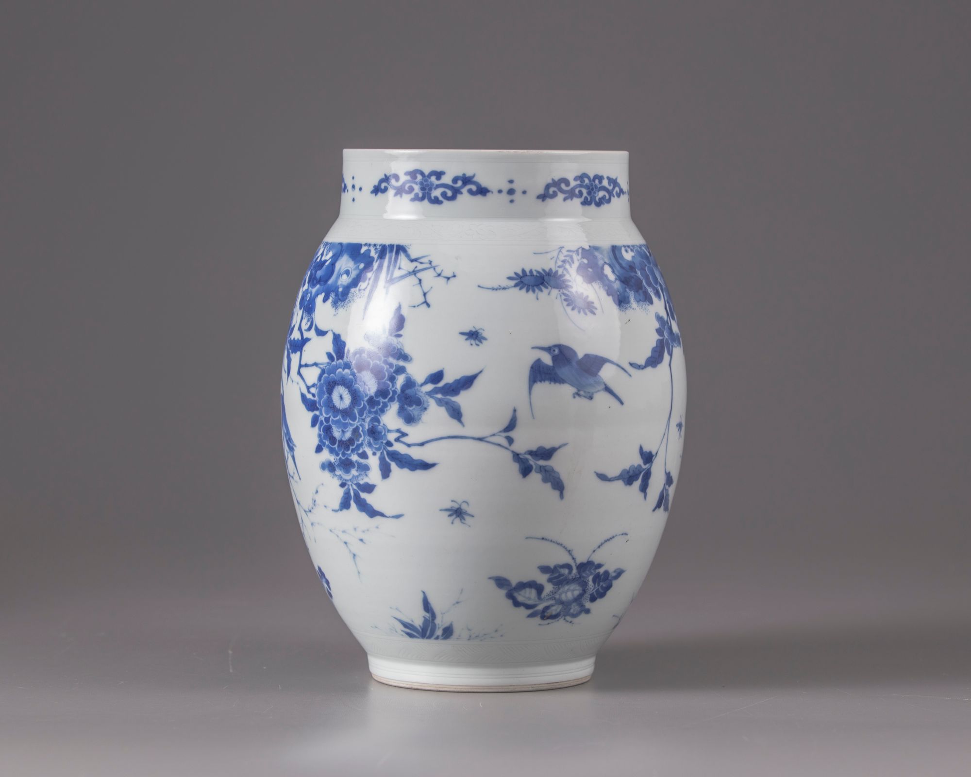 The jar is decorated to the body with various kinds of flowers, flowering branches,foliage and birds.