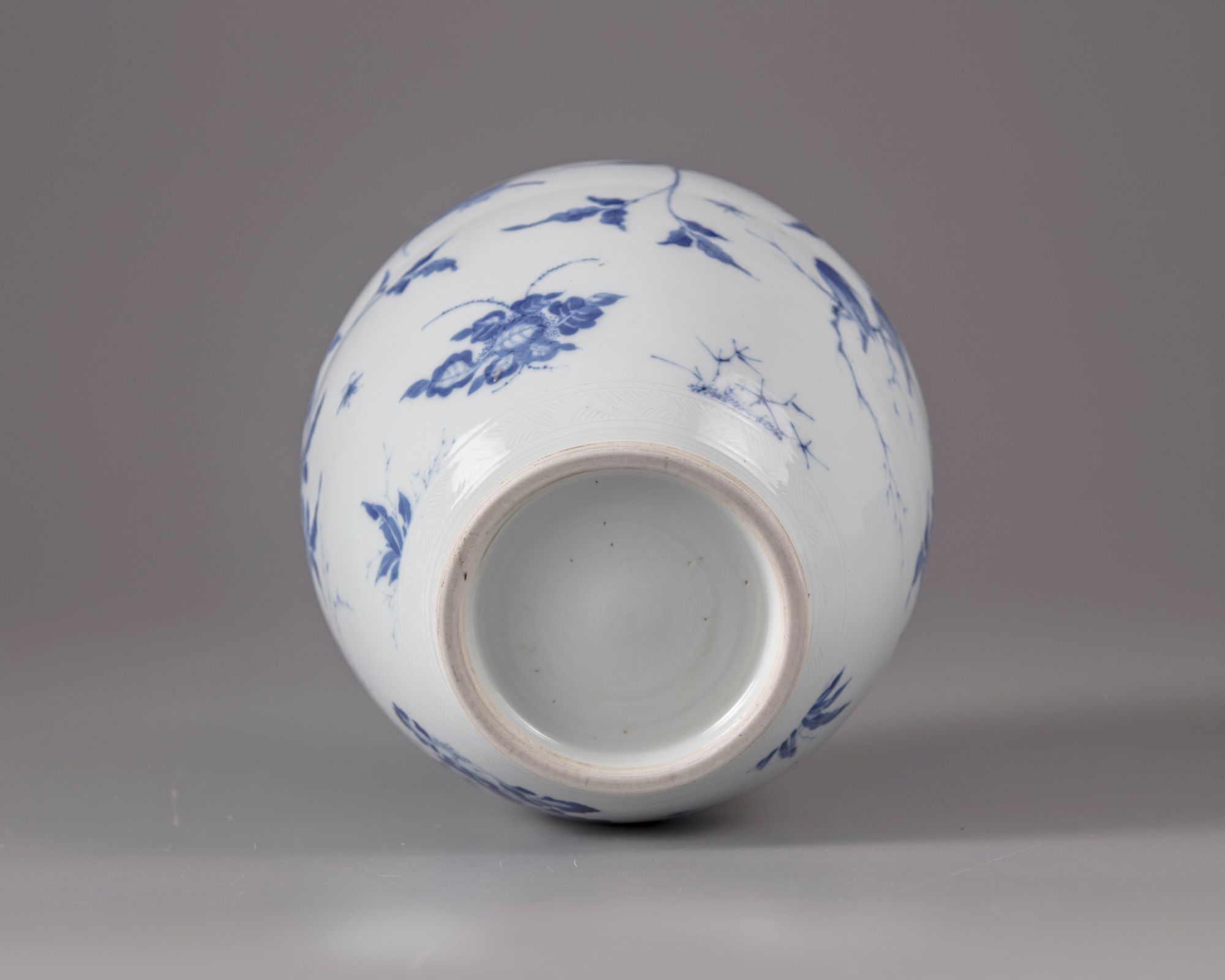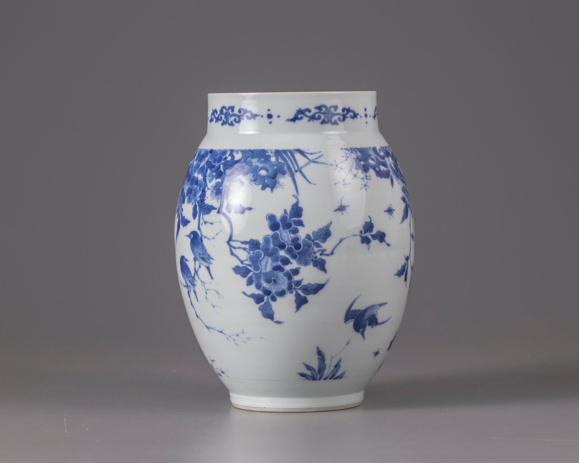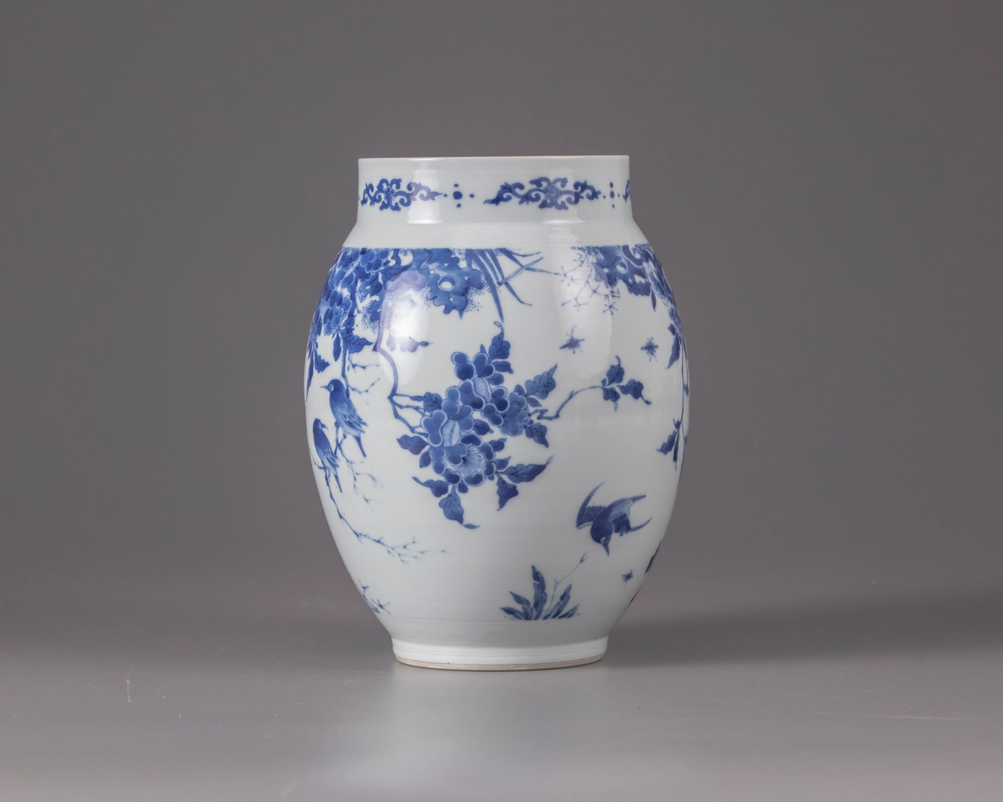 The jar is decorated to the body with various kinds of flowers, flowering branches,foliage and birds.