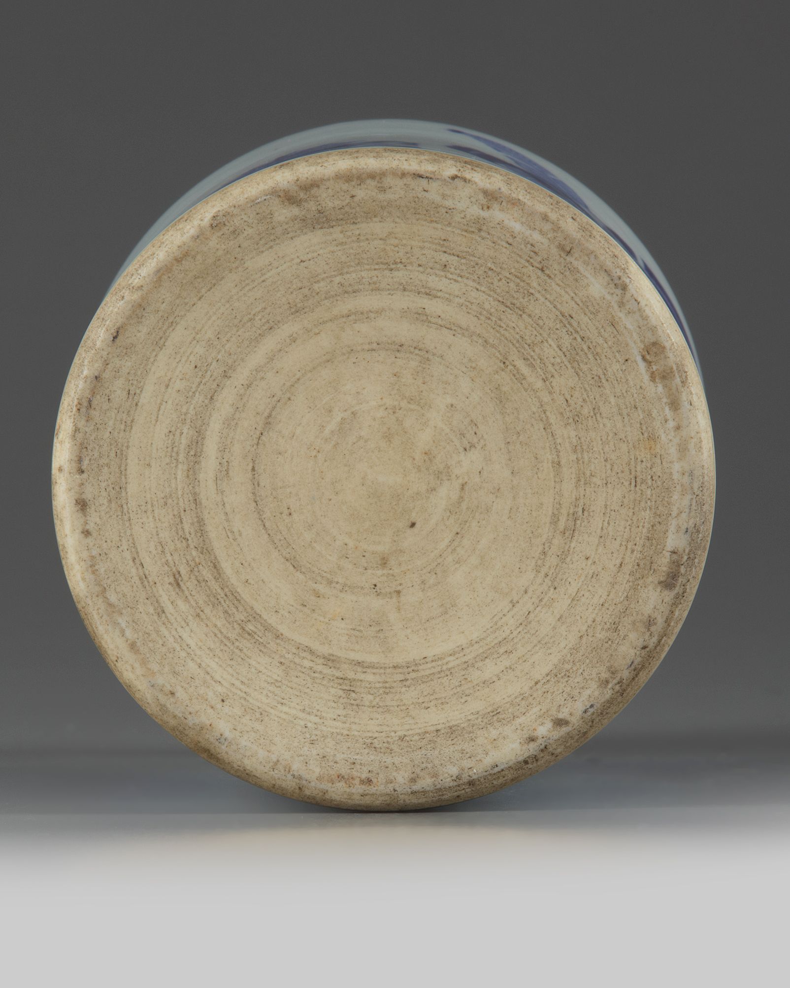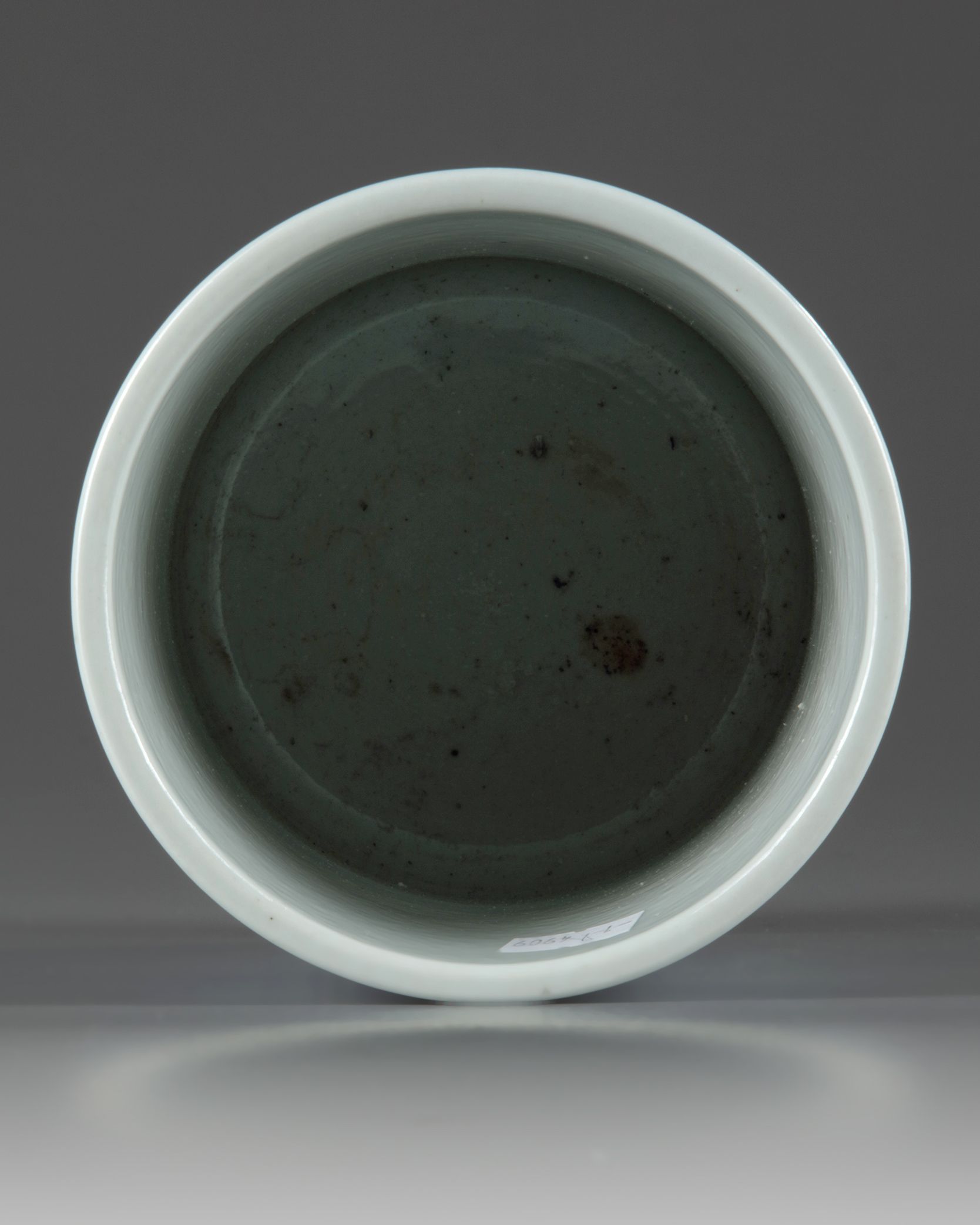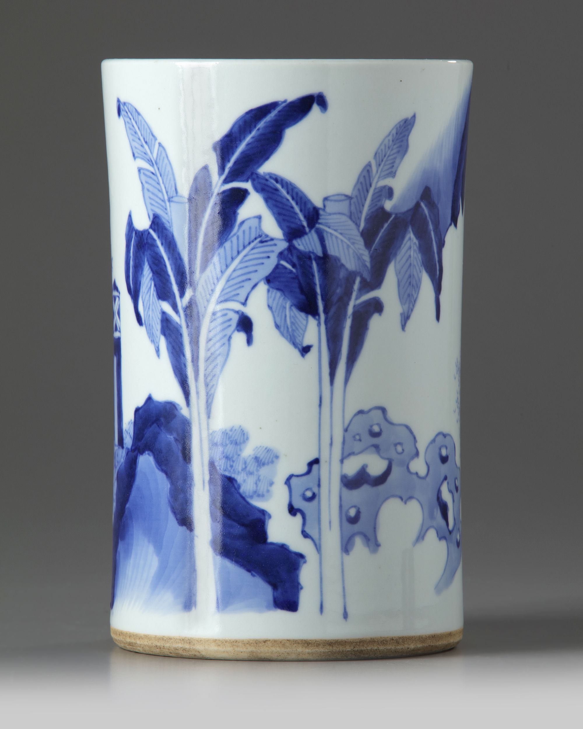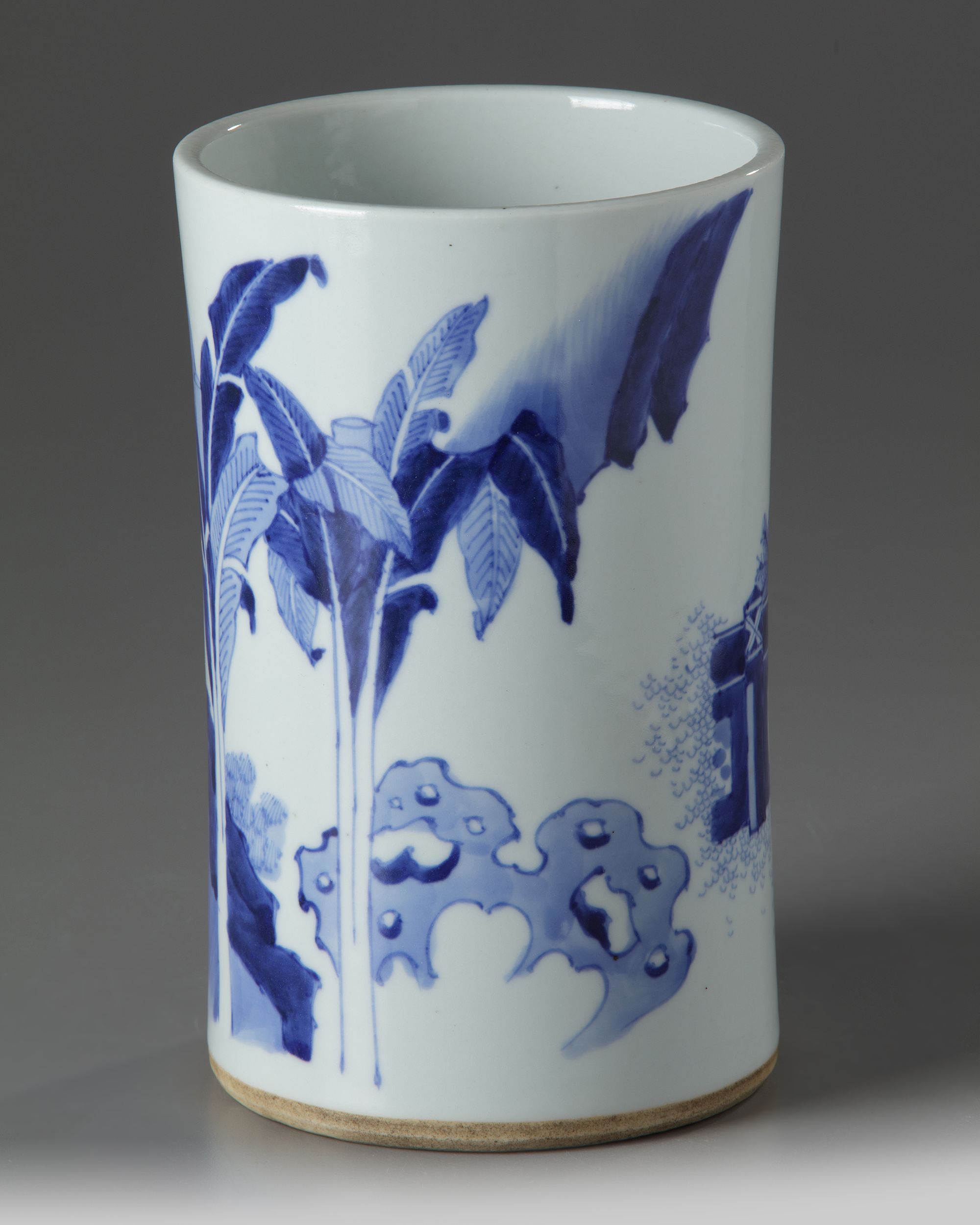 The exterior is decorated with a seated qilin in a fenced garden amongst pierced rocks and plantain.