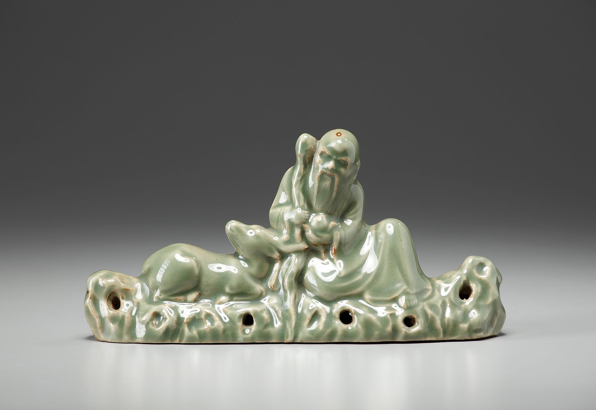 Modeled in the shape of Shoulao sitting on a rock with a dear resting beside him.