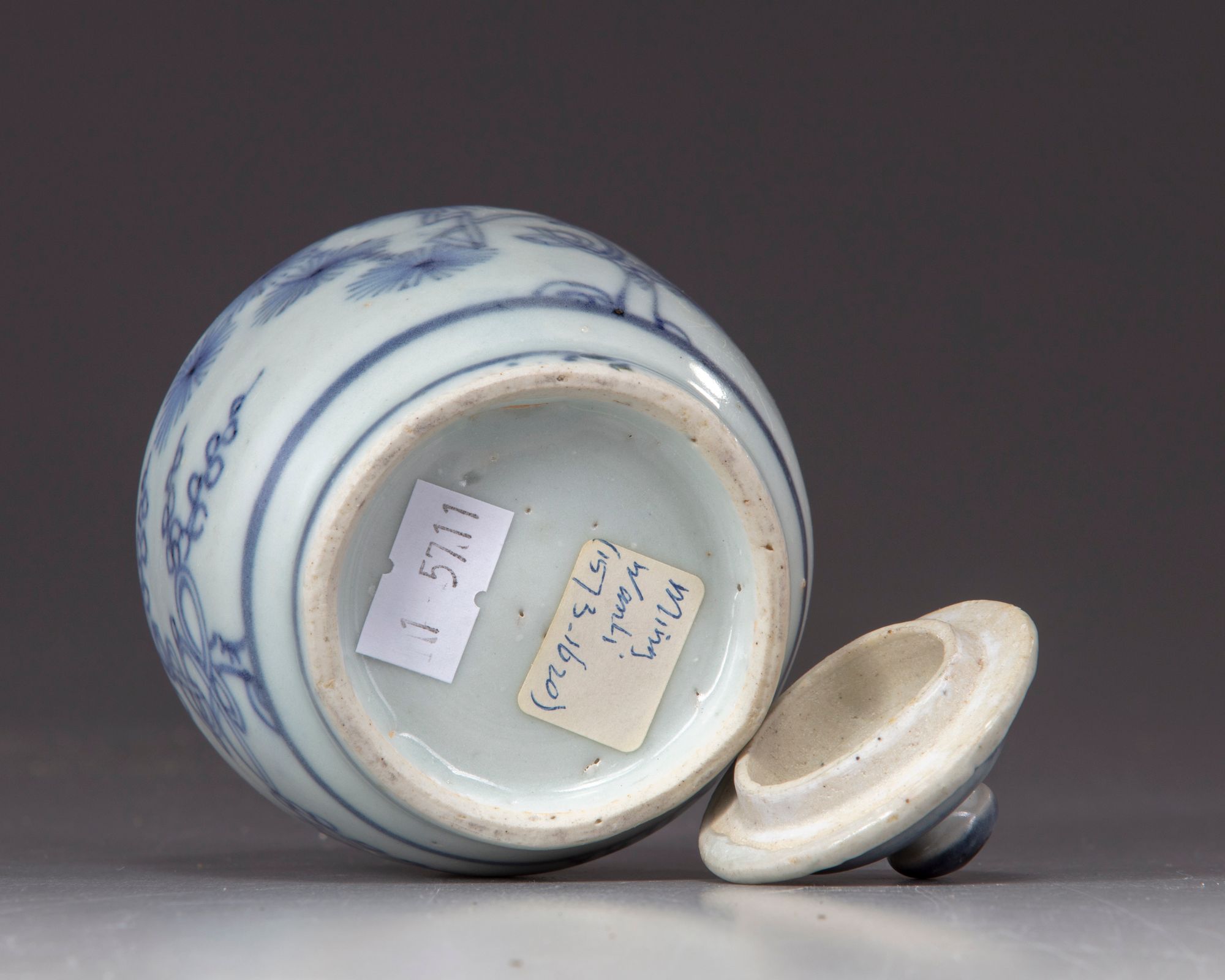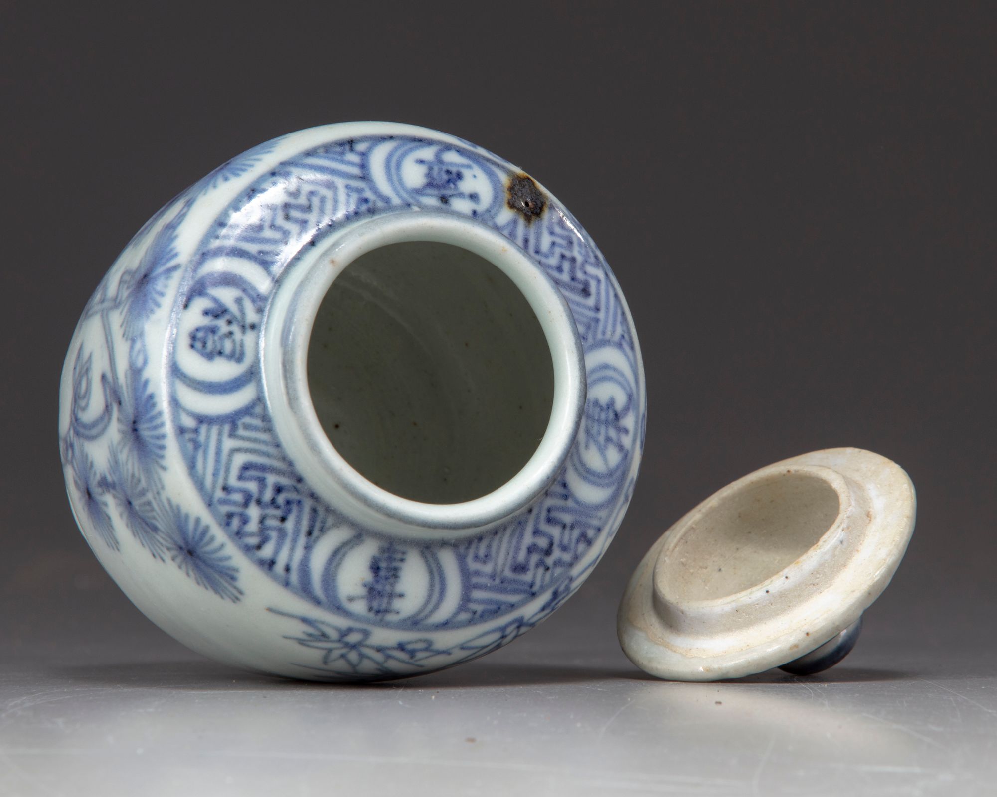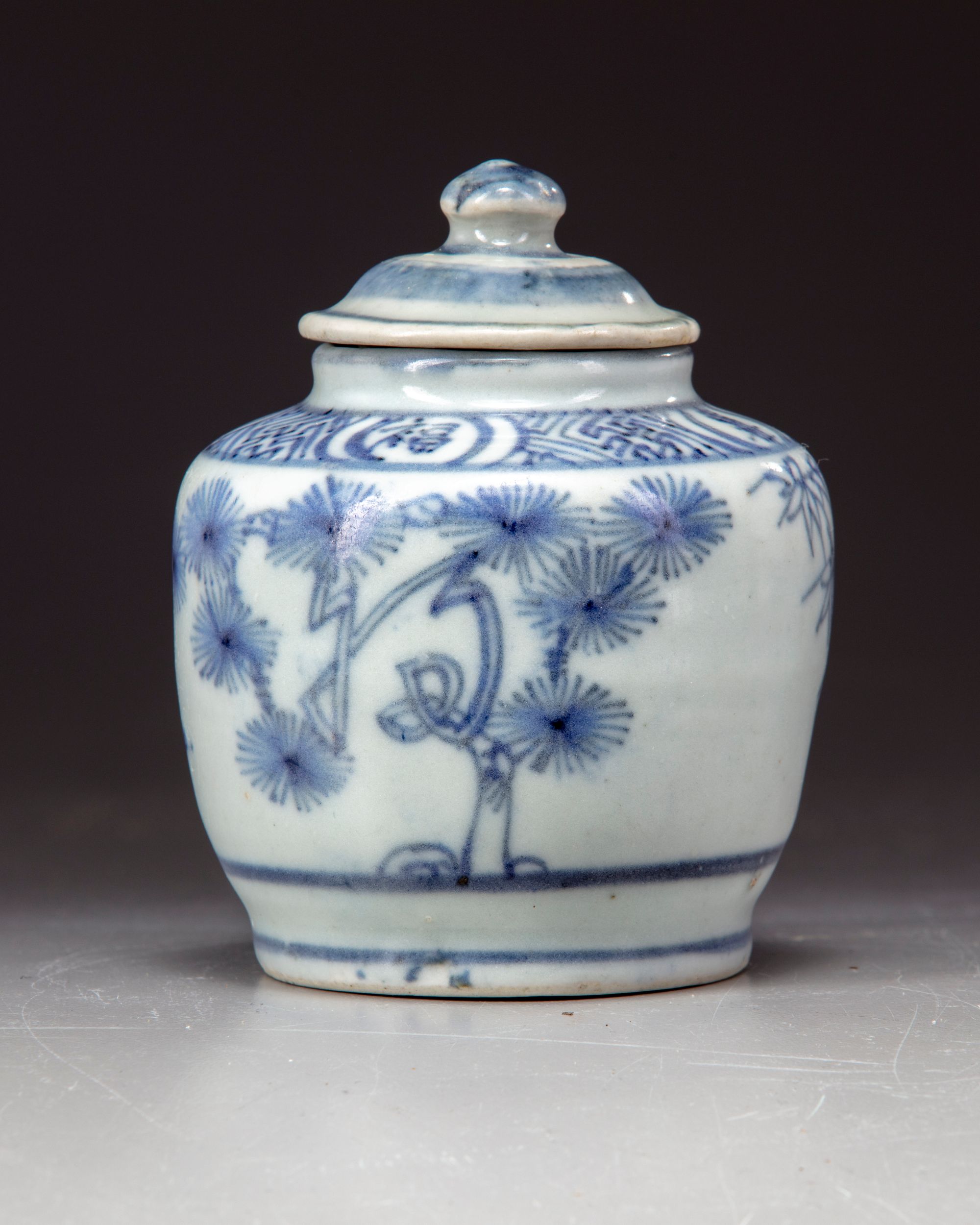 A small Chinese porcelain jar, decorated with "the three Friends of Winter" pine, bamboo, and plum, below a band containing Chinese characters.