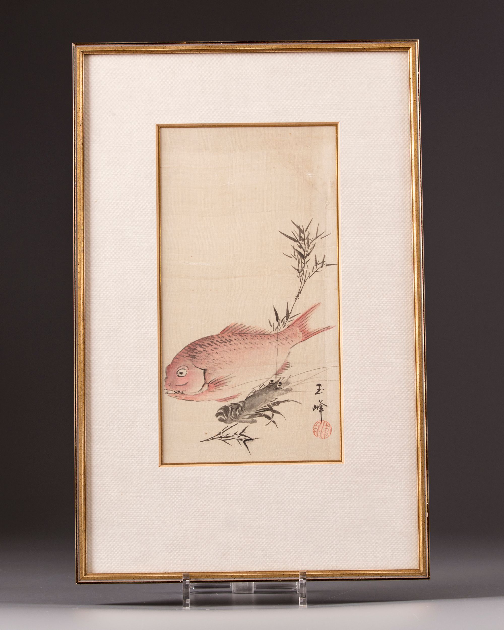 A painting of a fish with a lobster on silk, framed and glazed with a seal mark.