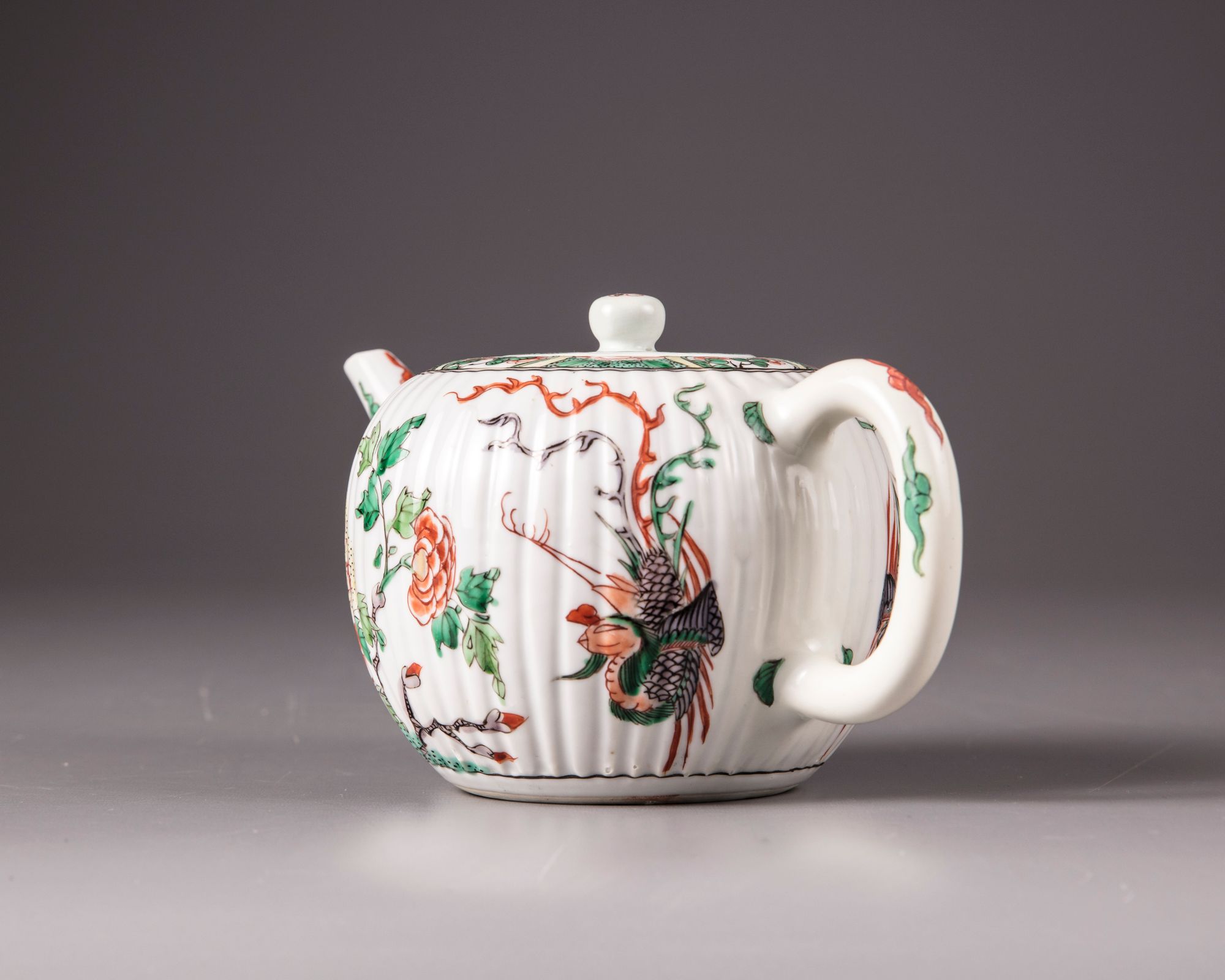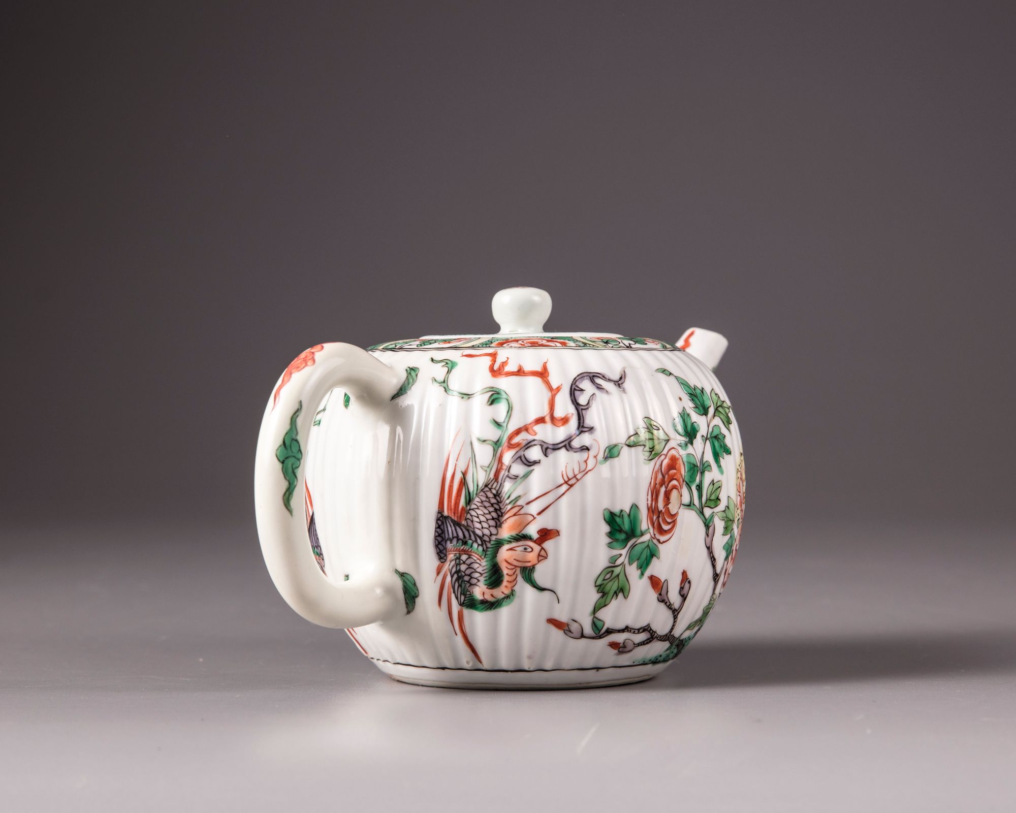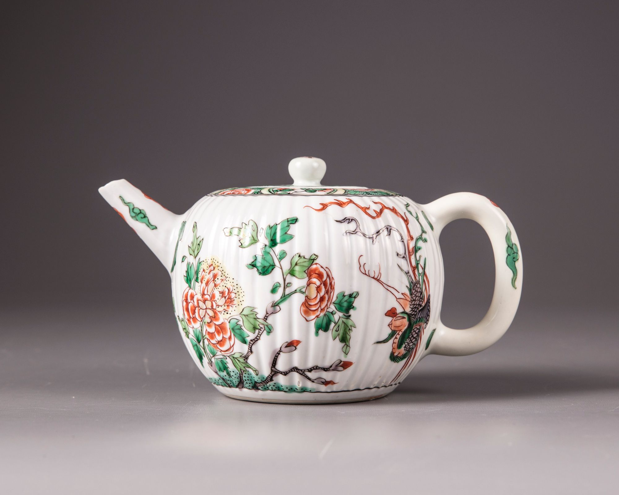 The body of the teapot is moulded with ribs imitating the petals of a chrysanthemum flower, both sides are decorated with a phoenix in flight amongst peonies. The rim is decorated with a seeded band with floral cartouches. The spout and rim are decorated with cloud scrolls. The flat cover is a moulded design and is surmounted by a ball finial.