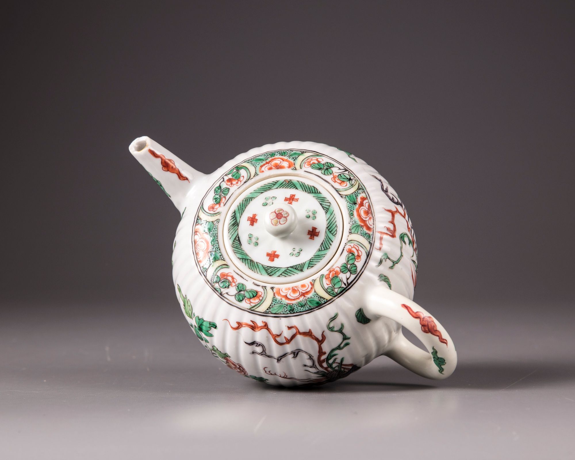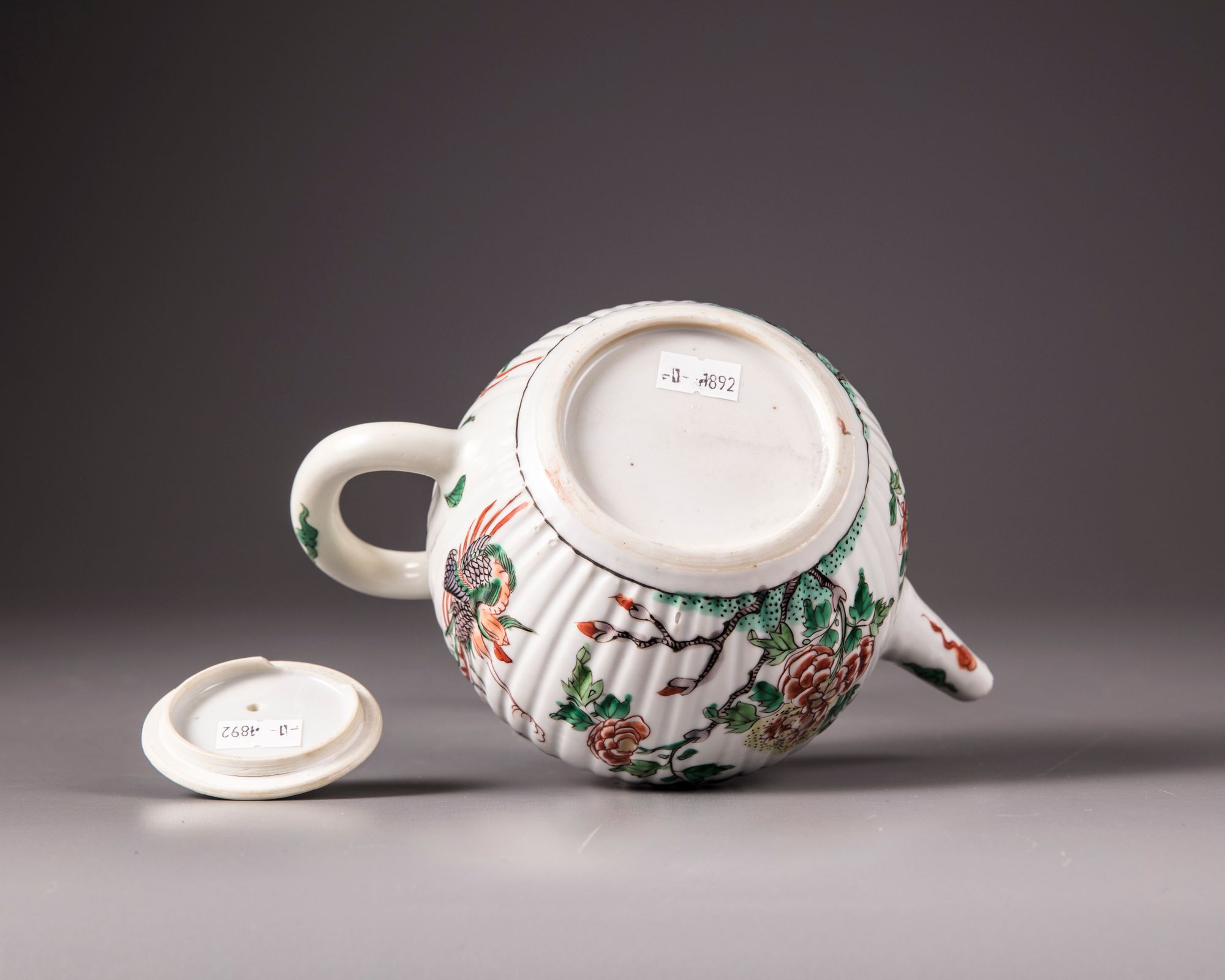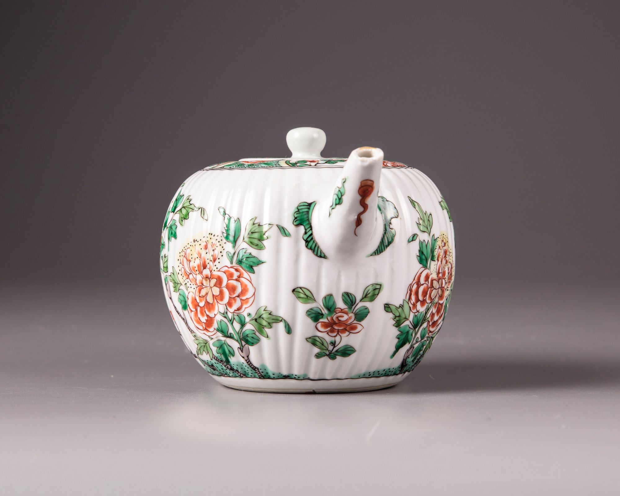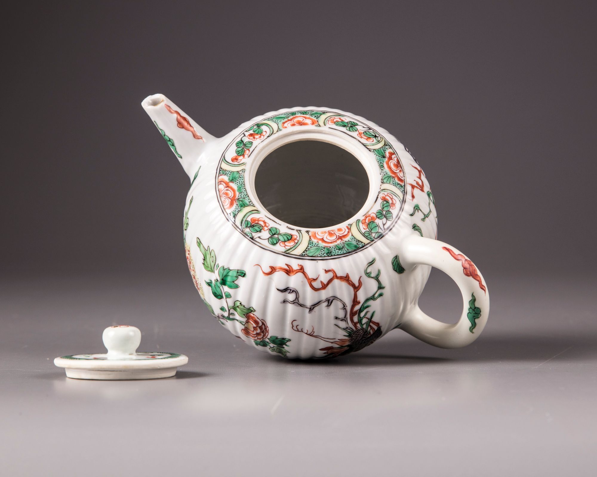 The body of the teapot is moulded with ribs imitating the petals of a chrysanthemum flower, both sides are decorated with a phoenix in flight amongst peonies. The rim is decorated with a seeded band with floral cartouches. The spout and rim are decorated with cloud scrolls. The flat cover is a moulded design and is surmounted by a ball finial.