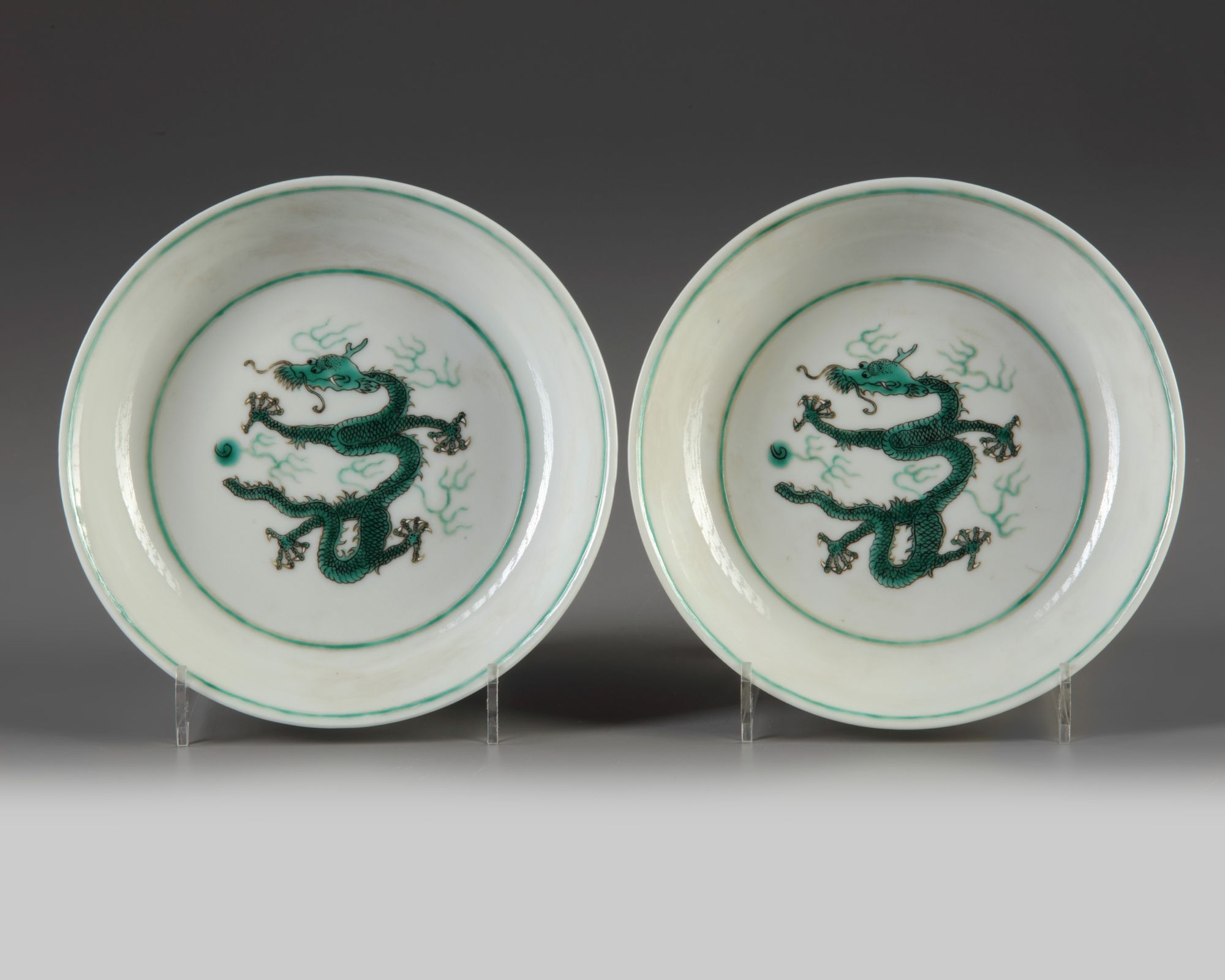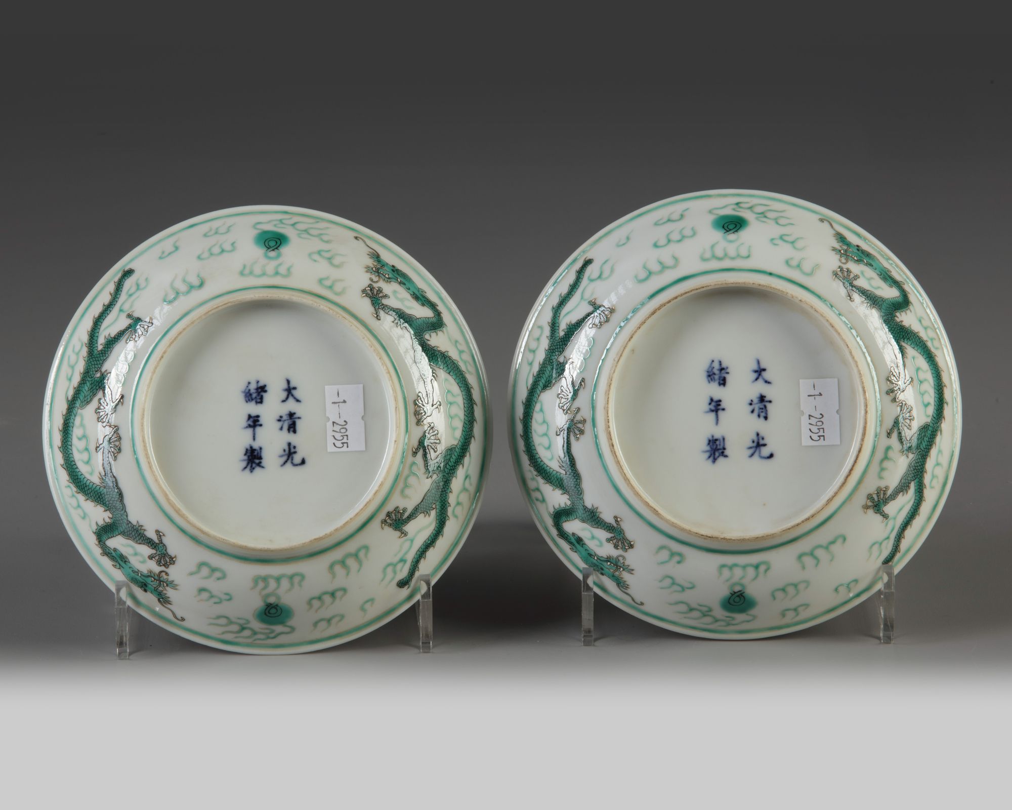 Each dish si decroated with a dragon in green enamel with five white-enamelled claws chasing the flaming pearl amongst flame scrolls, encircled by two green-enamelled bands. Each exterior is decorated with two striding dragons chasing the flaming pearl amongst further flame scrolls. Each base with a Guangxu mark in underglaze blue.
