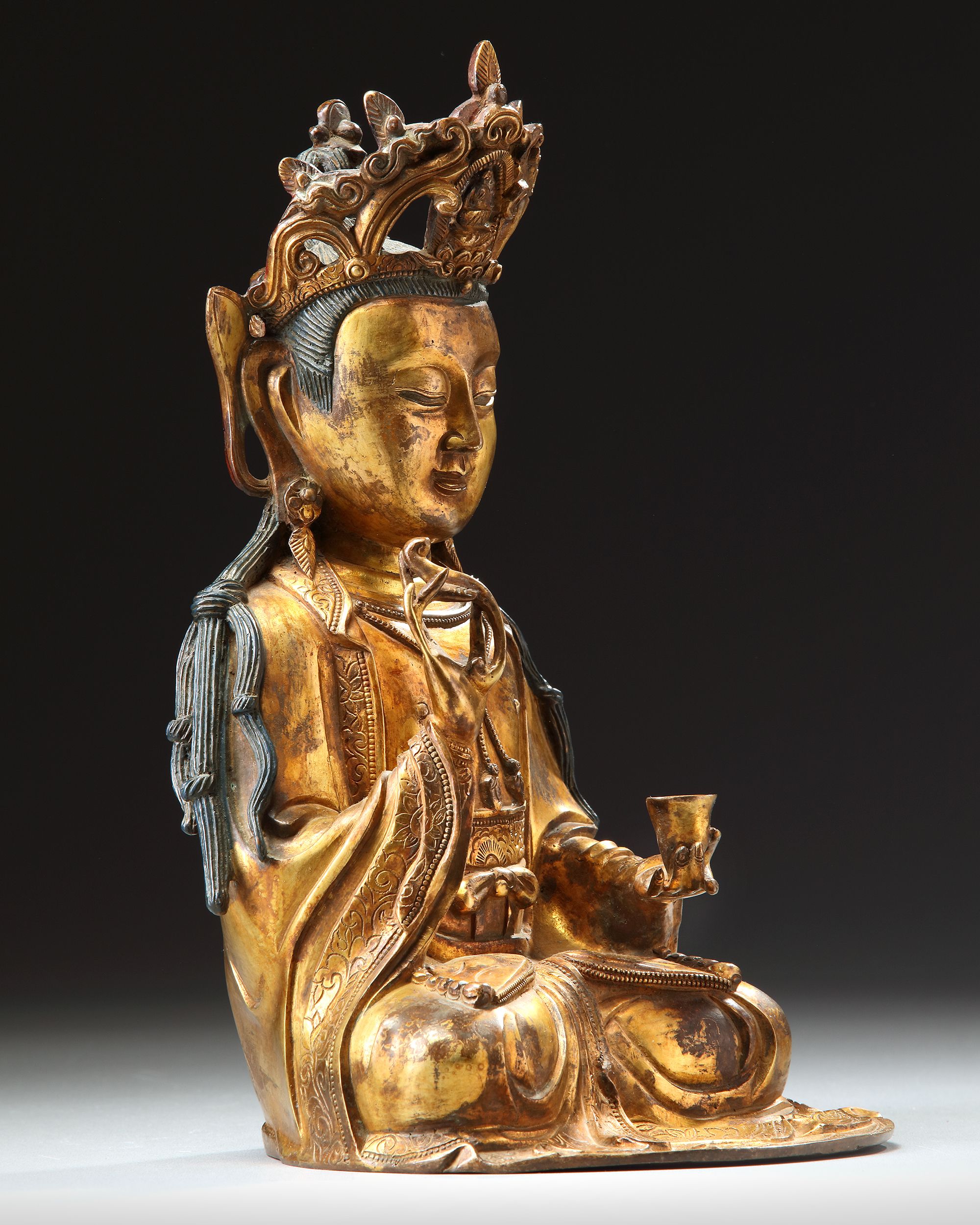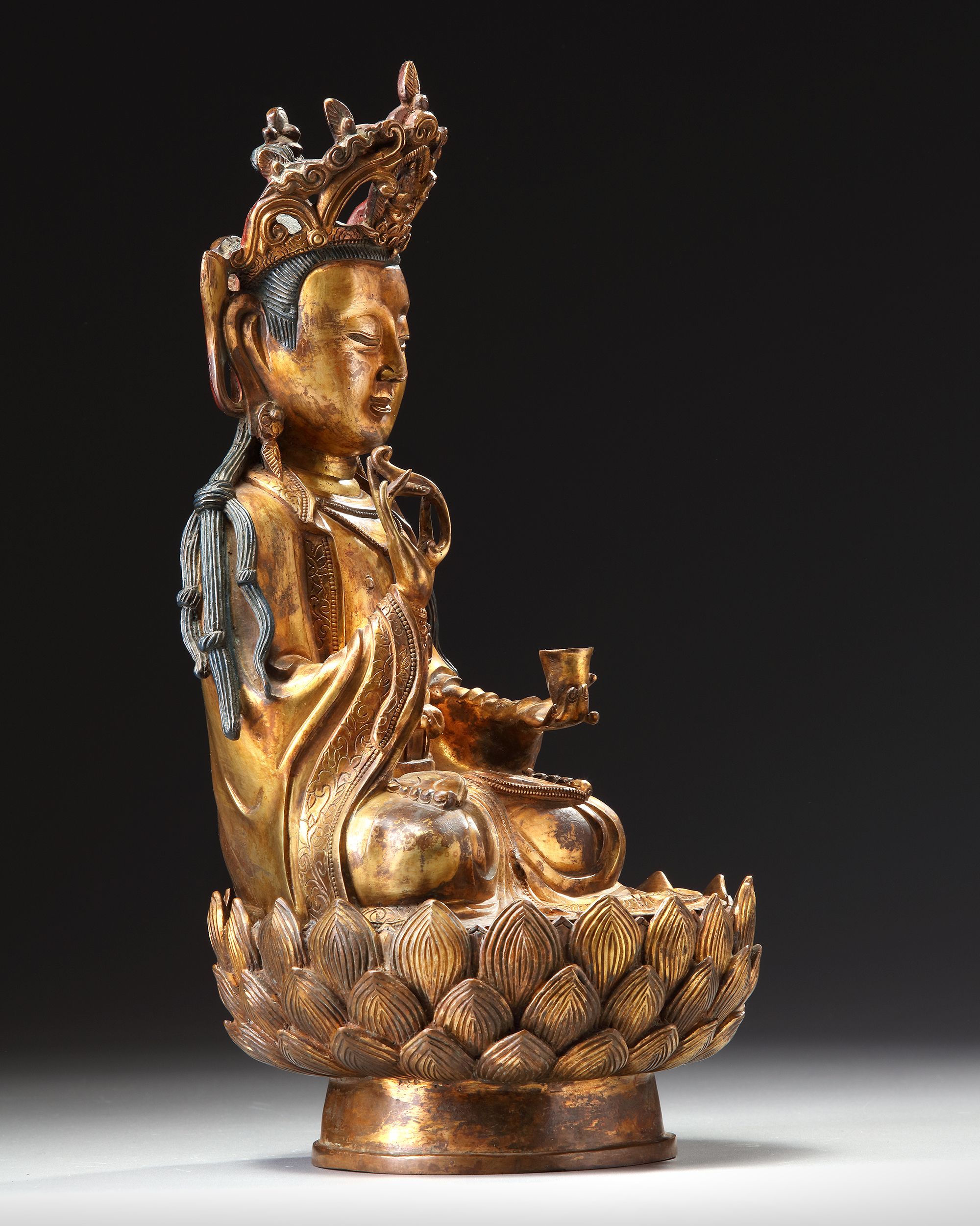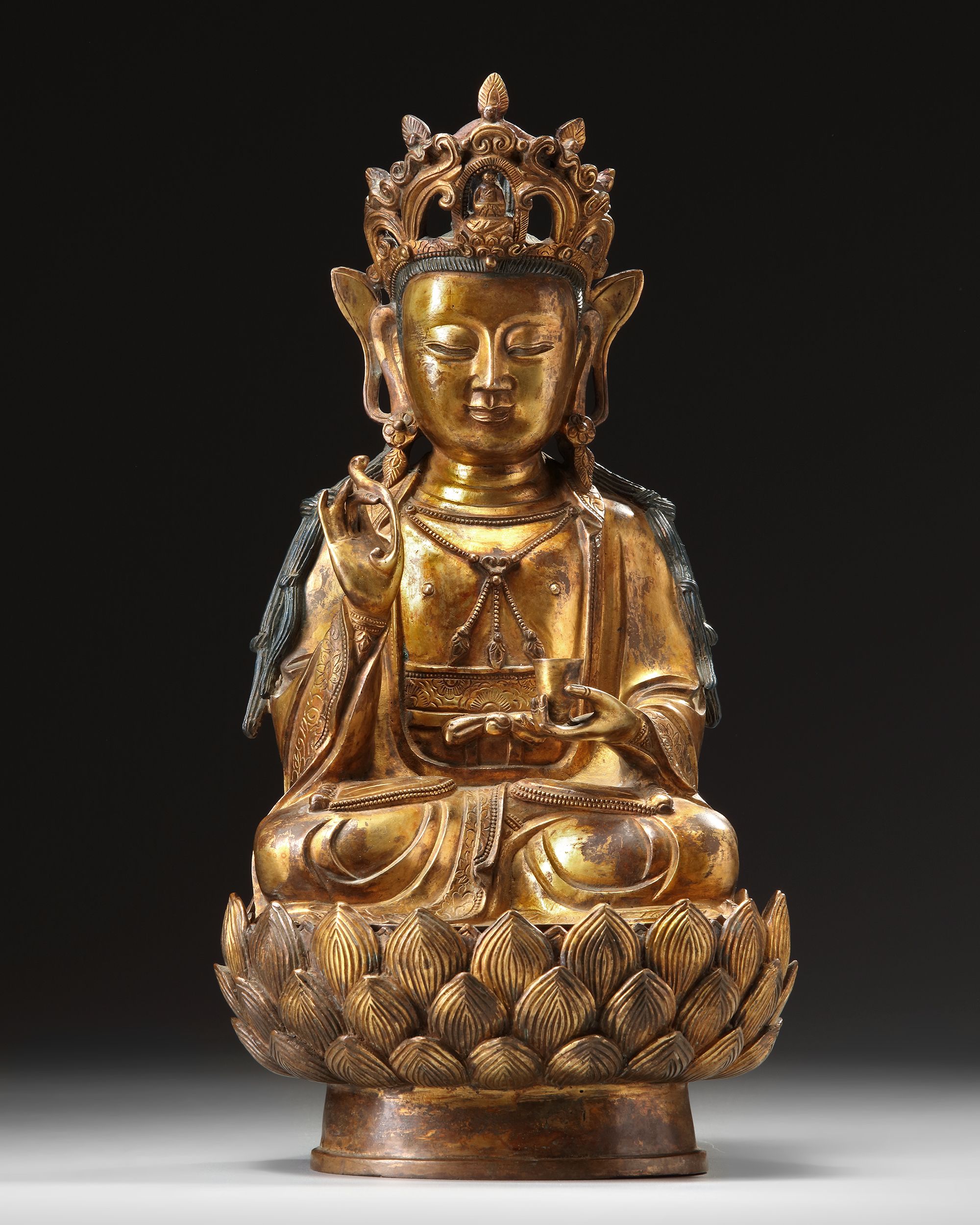 The figure is cast seated in dhyanasana, dressed in loose, flowing robes and elaborate beaded jewelry. The face with a serene expression, and the hair is fashioned into a chignon centered by a figure of Amitabha Buddha in an elaborate crown. She is seated on a separate lotus base. height without base: 28 cm.