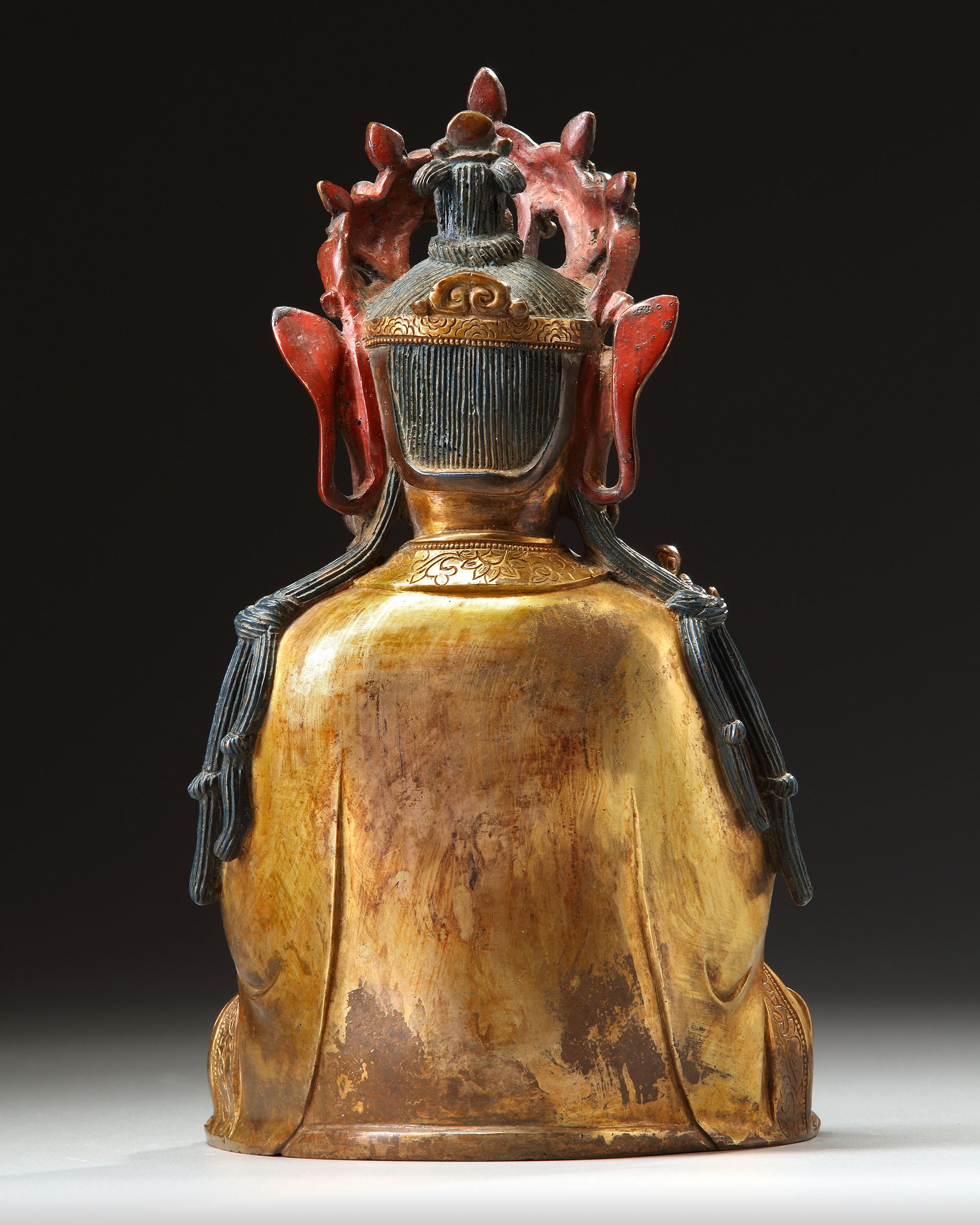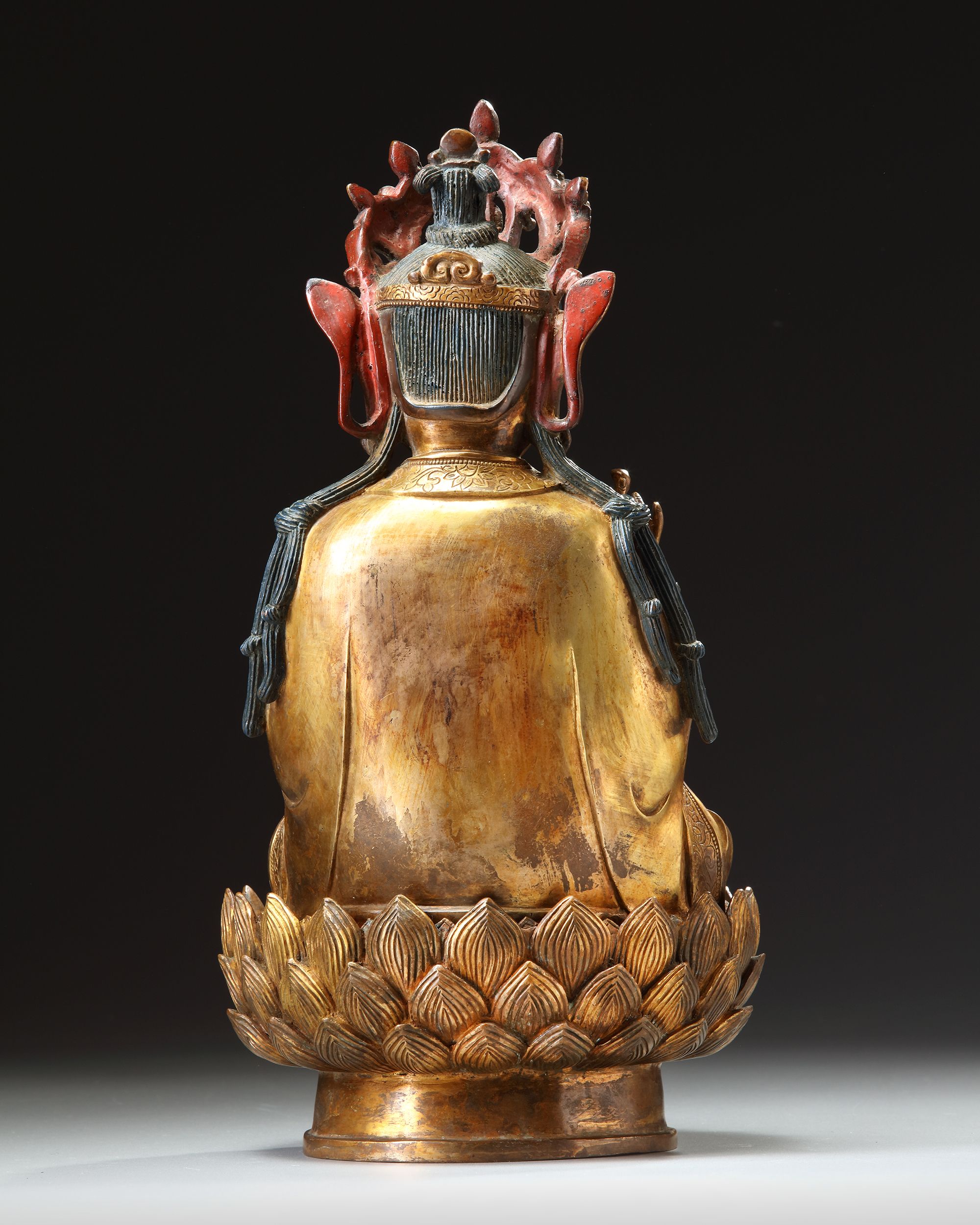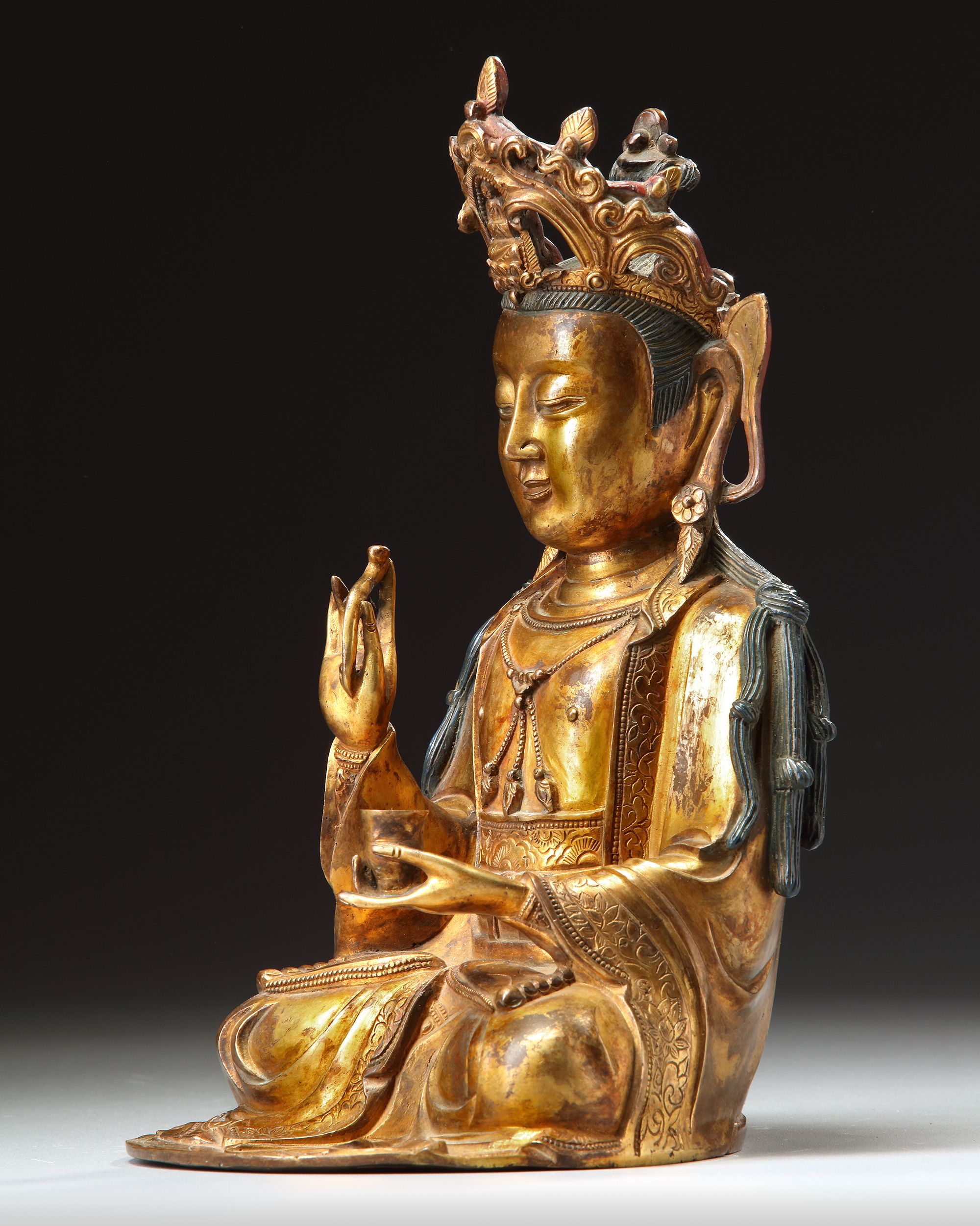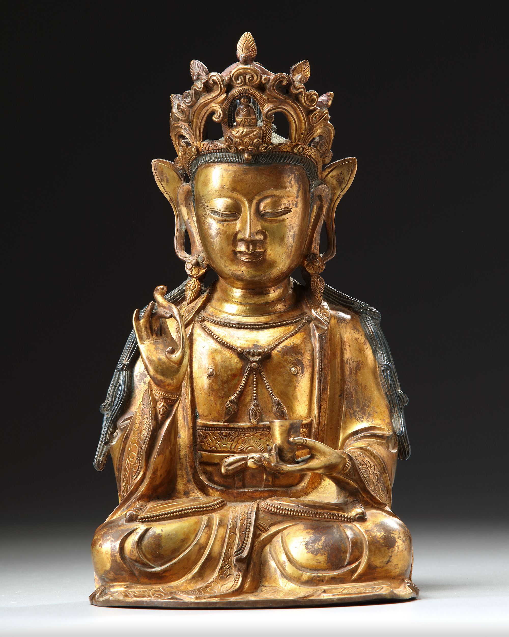The figure is cast seated in dhyanasana, dressed in loose, flowing robes and elaborate beaded jewelry. The face with a serene expression, and the hair is fashioned into a chignon centered by a figure of Amitabha Buddha in an elaborate crown. She is seated on a separate lotus base. height without base: 28 cm.