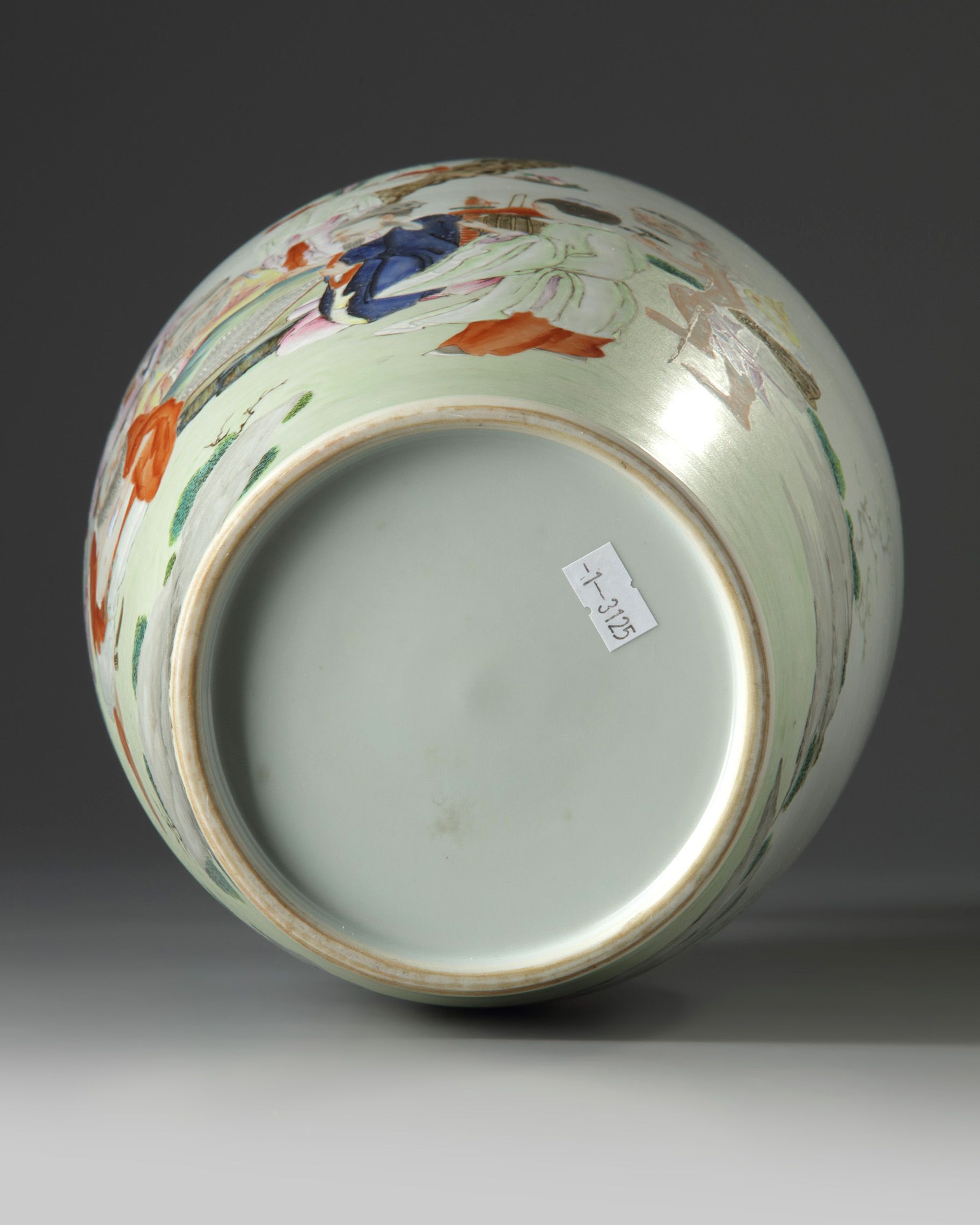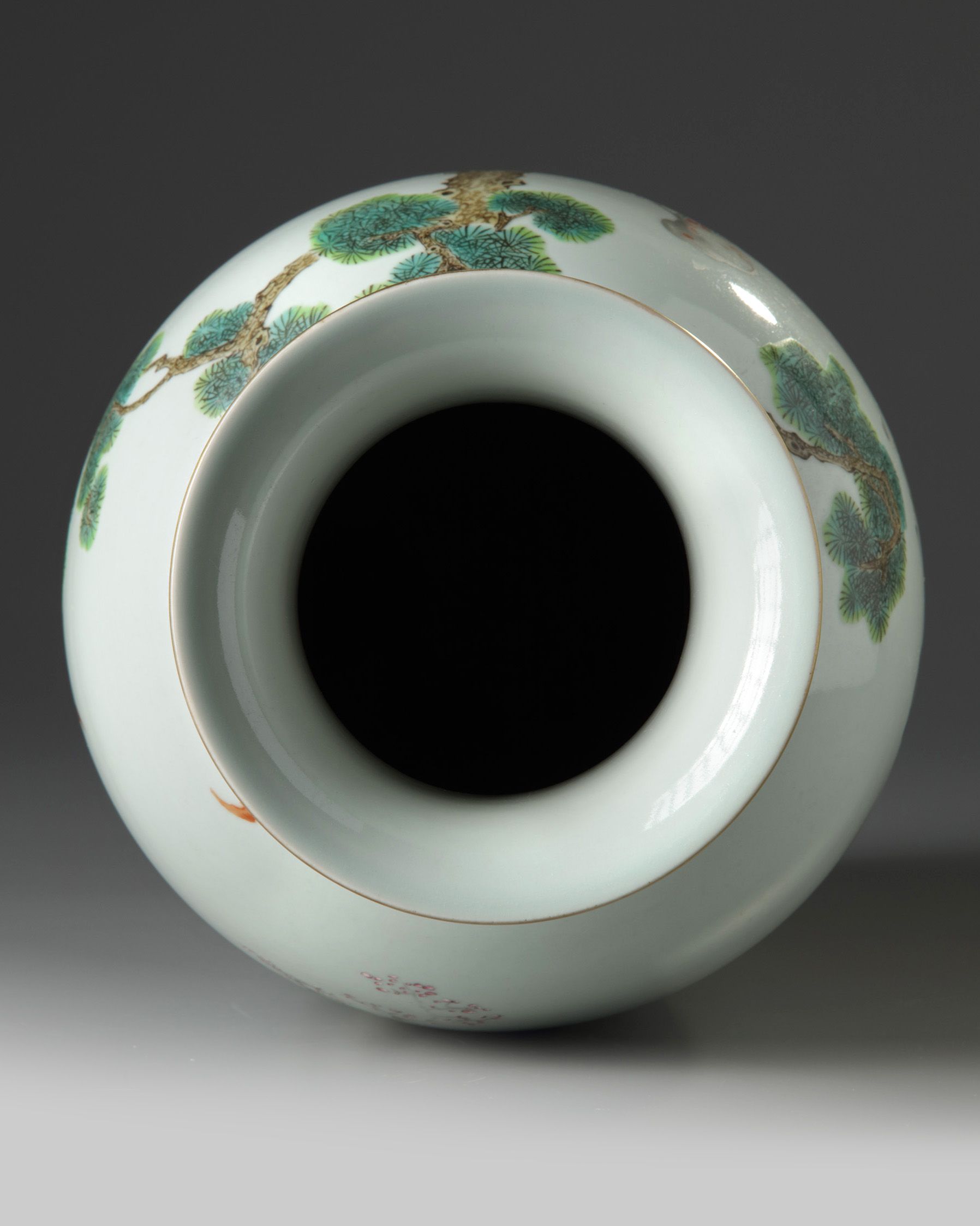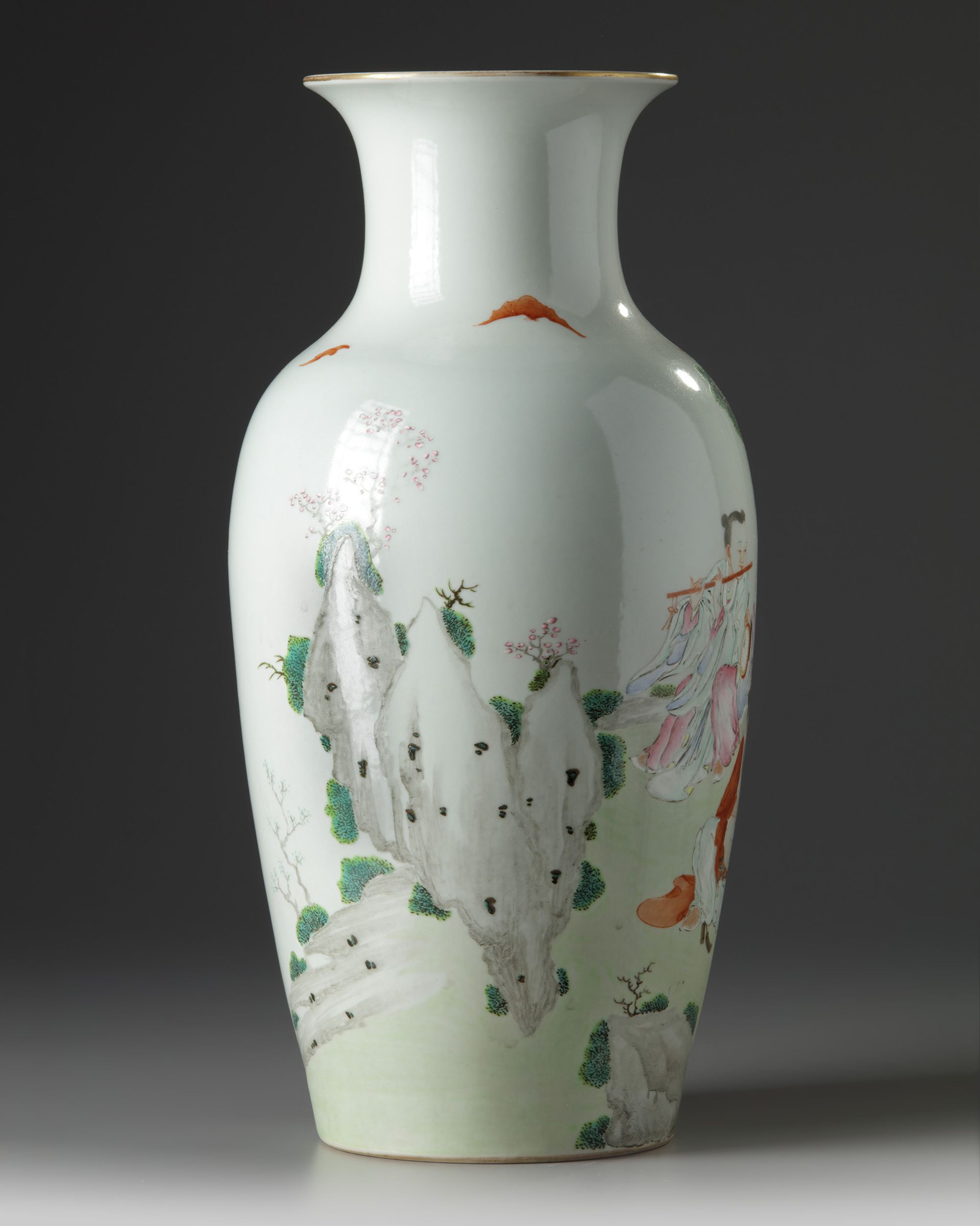 The vase is decorated with a scene depicting the Eight Immortals at leisure each holding their respective attribute. Two of them are playing weiqi while the others are observing, all below bats and pine trees.