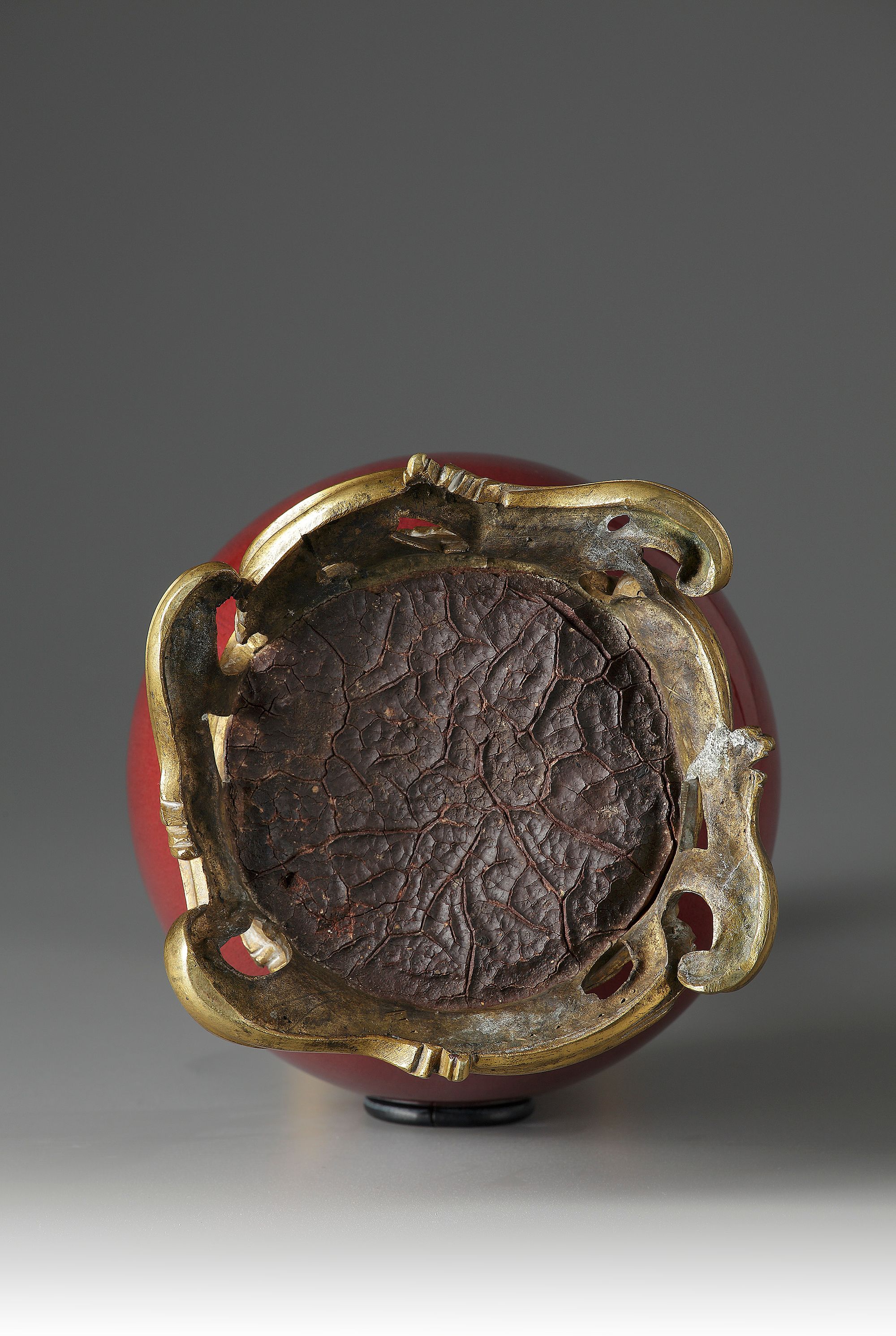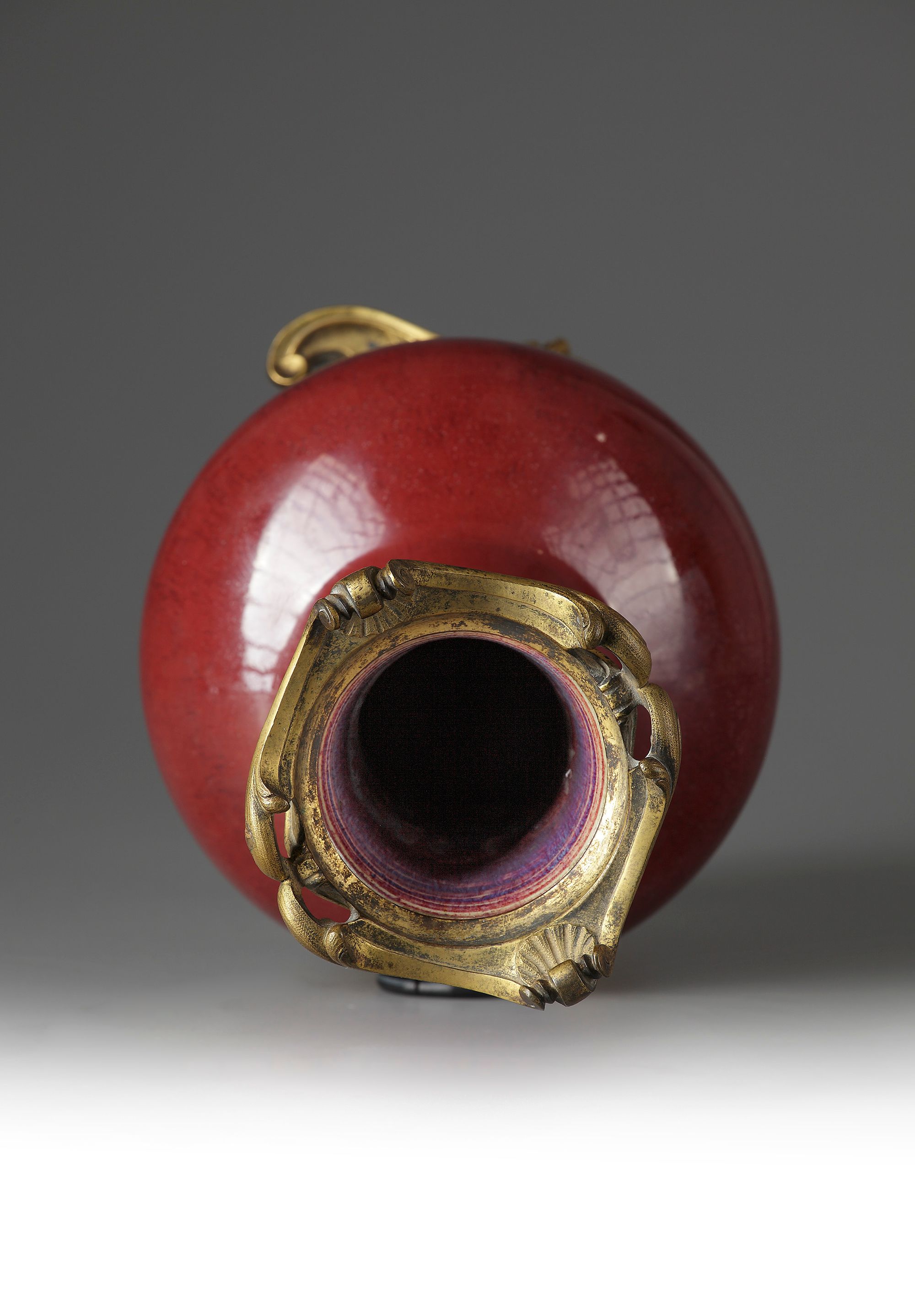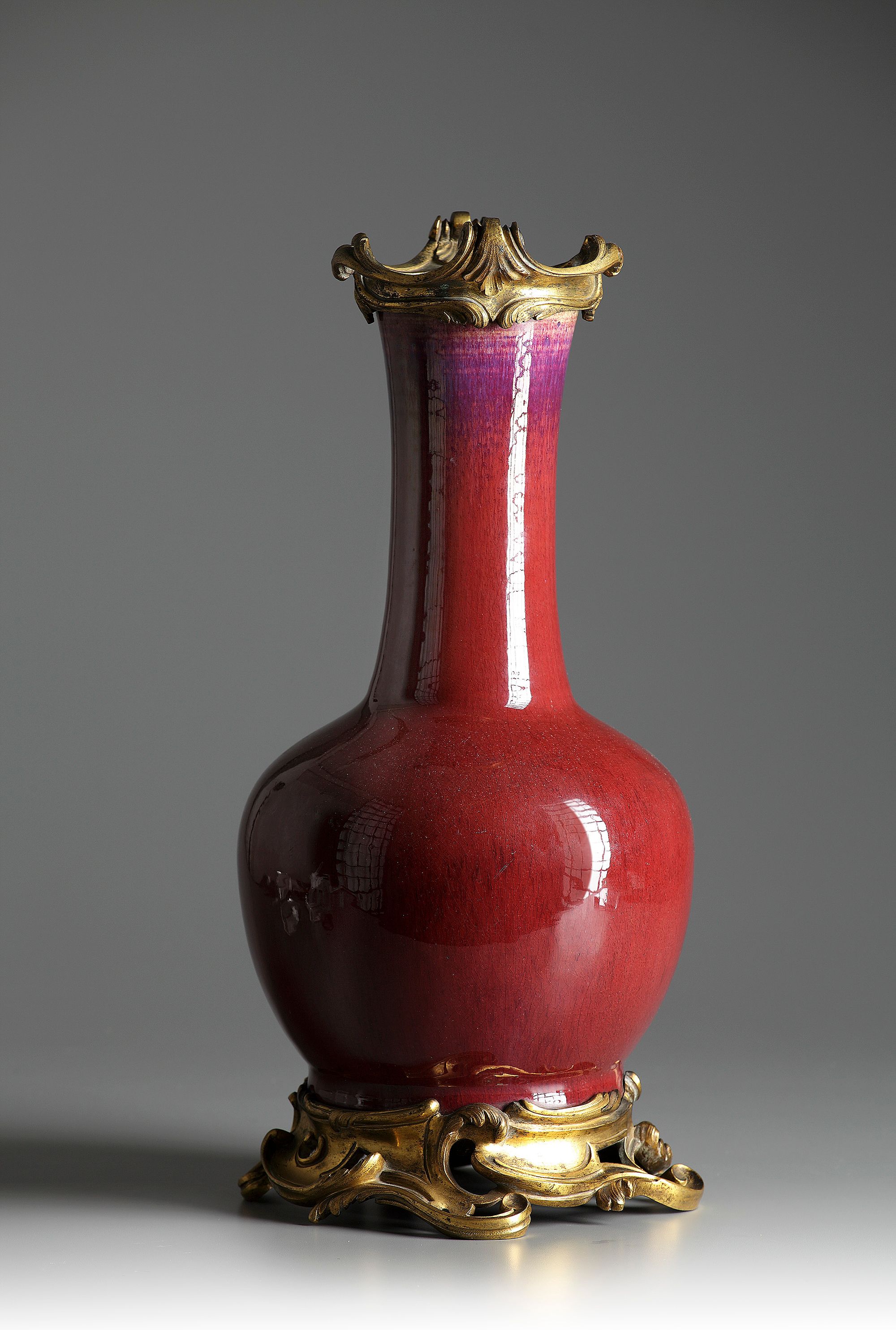 With globular body and tall cylindrical neck, all under a sang-de-boeuf glaze thinning to a pale beige tone below the rim, continuing into the interior with similar colors.