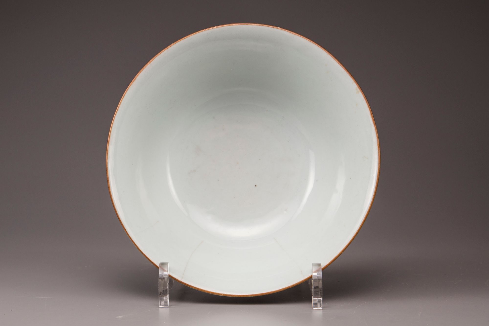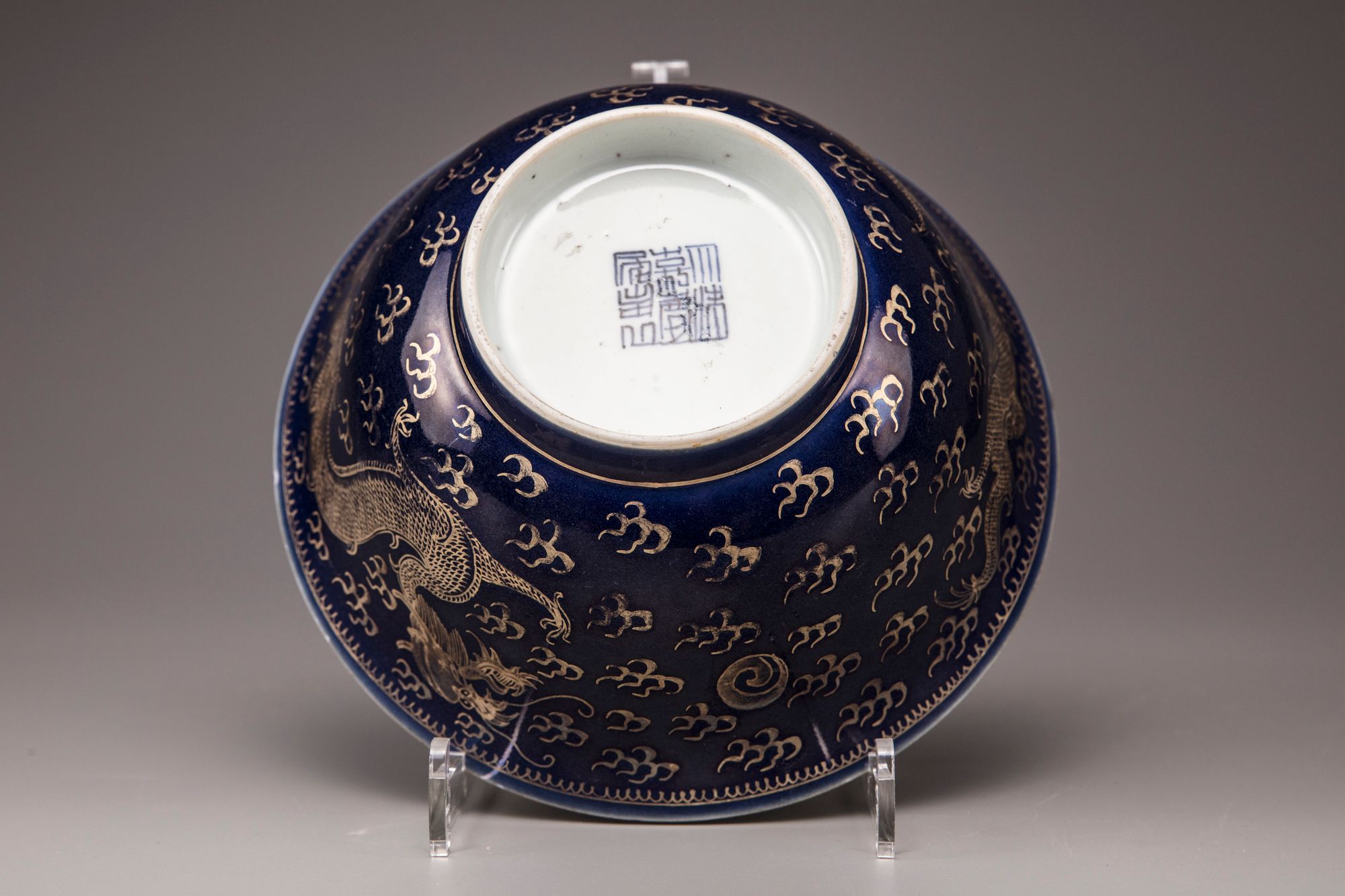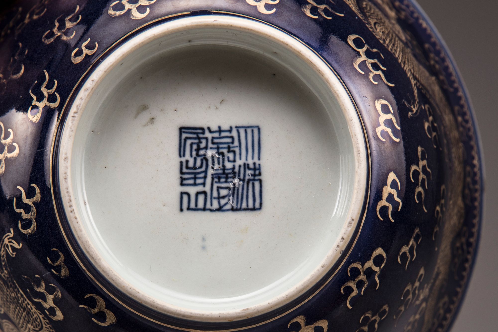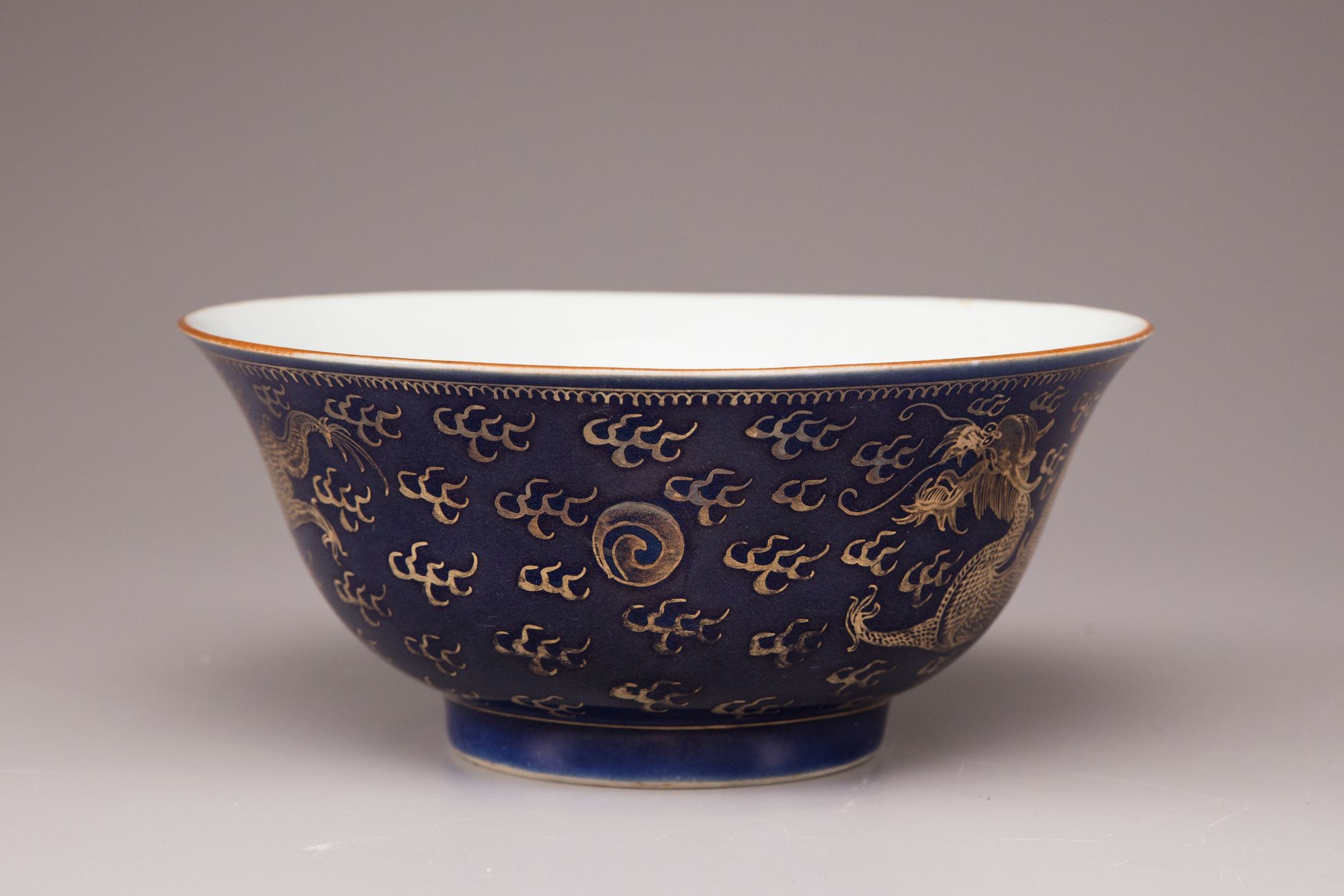 with flaring sides standing on a high footring, decorated to the exterior with a blue glaze and heightened in gold, depicting two flying dragons chasing the flaming pearl among stylized clouds. Marked to the base with a Qianlong seal mark.