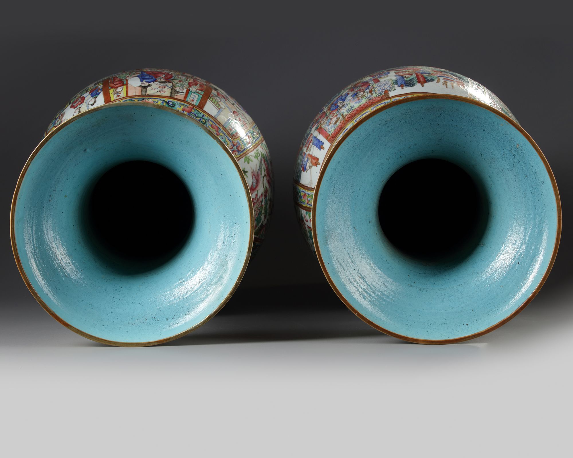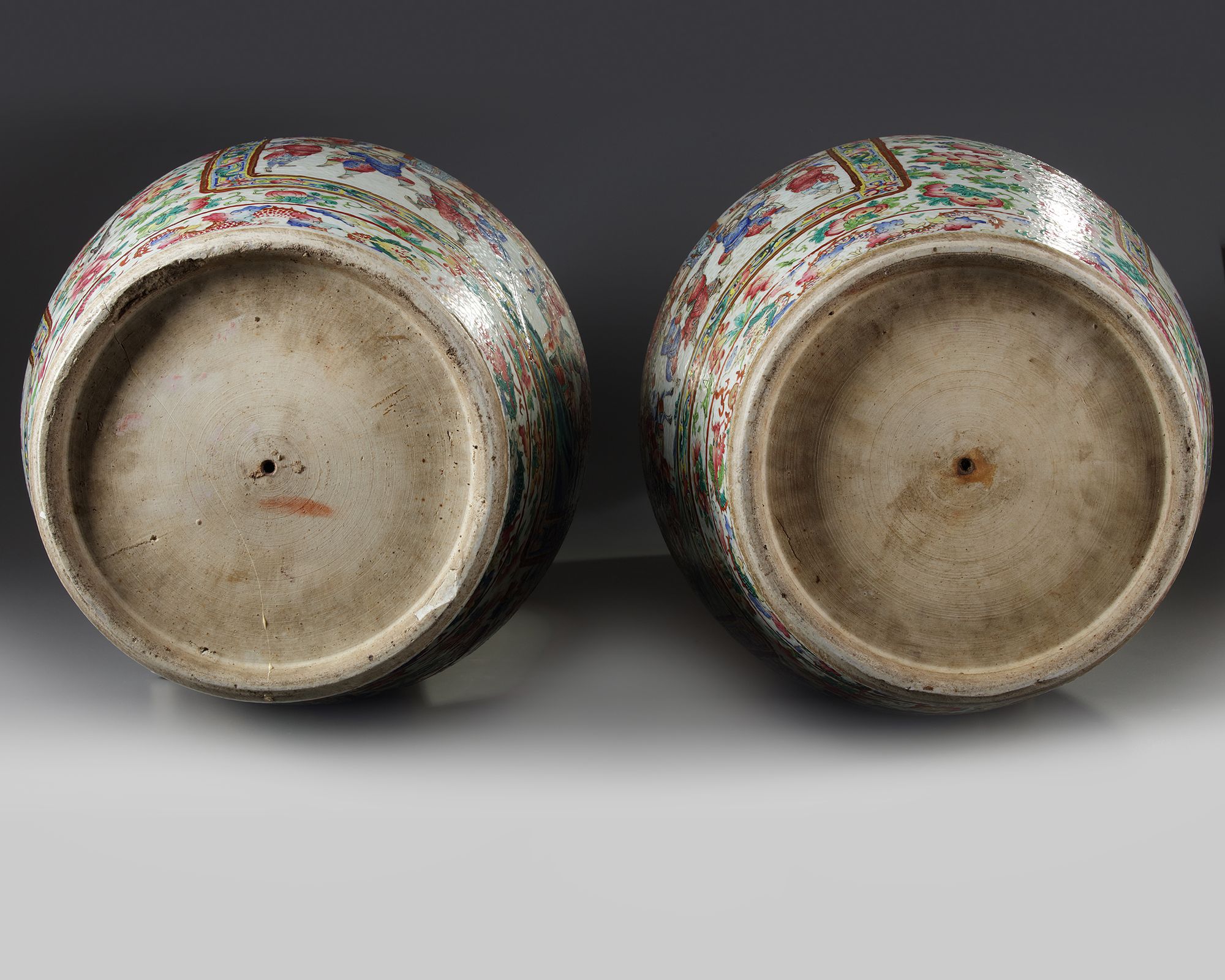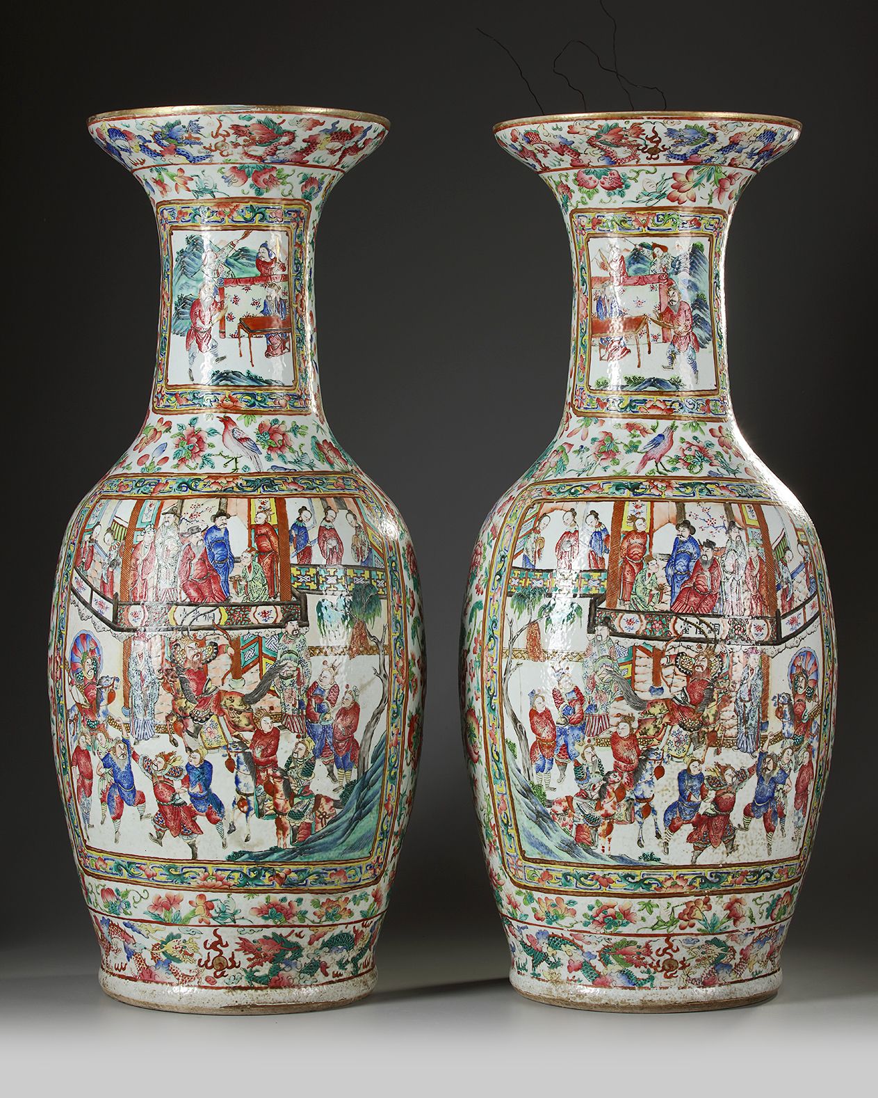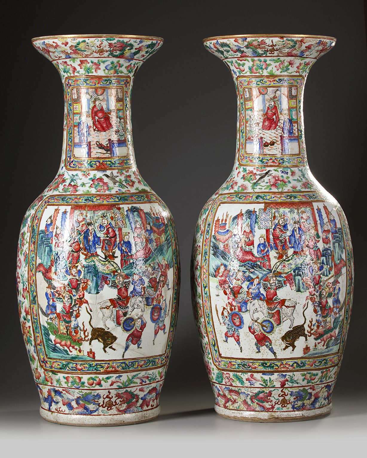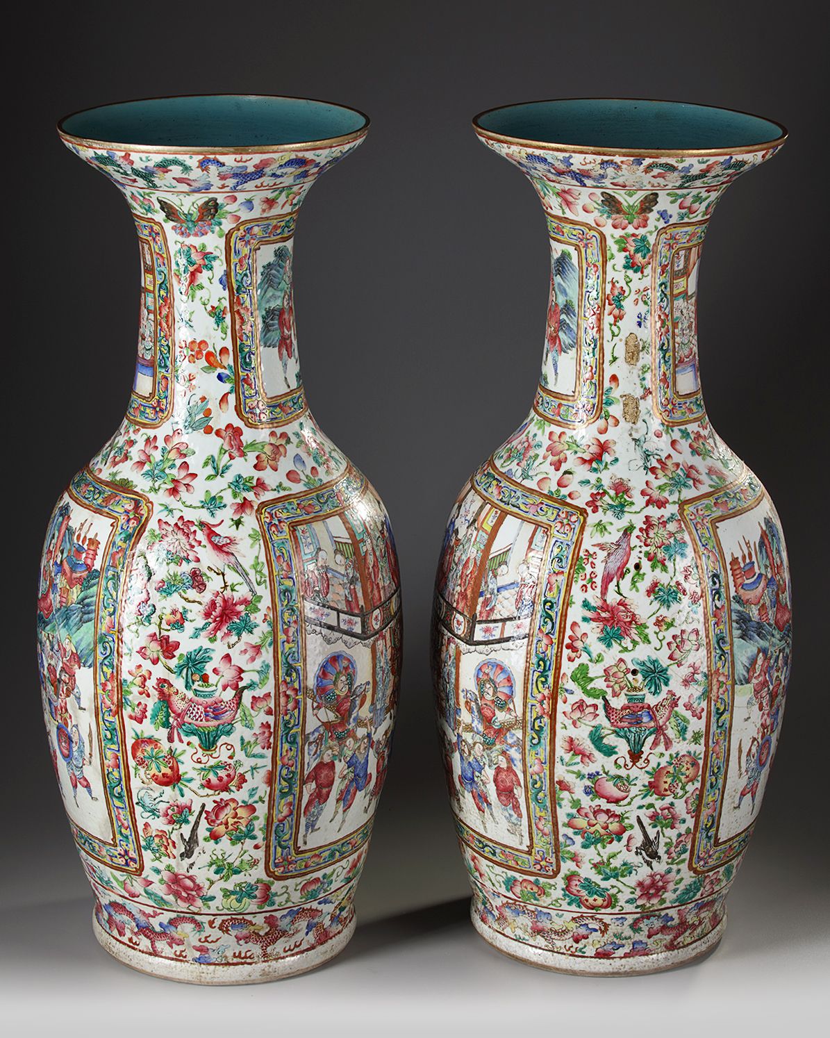 Both decorated to the exterior with gilt flowering panels containing different scenes of dignitary figures surrounded by warriors, servants and animals, separated by various flowers, birds and foliage. The base with a band of dragons chasing flaming pearls amongst clouds. The rim has been gilt and the interior is covered with a turquoise glaze.