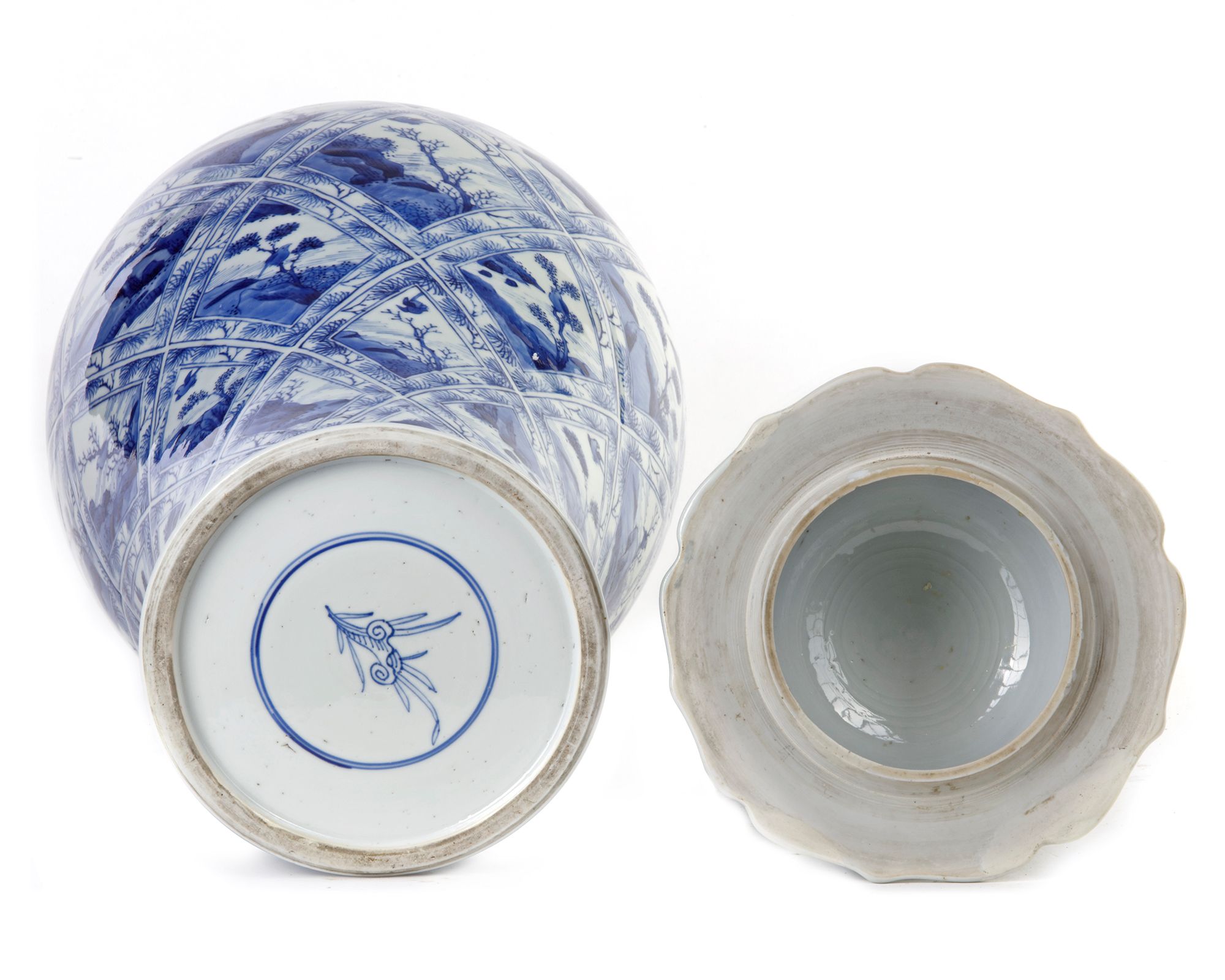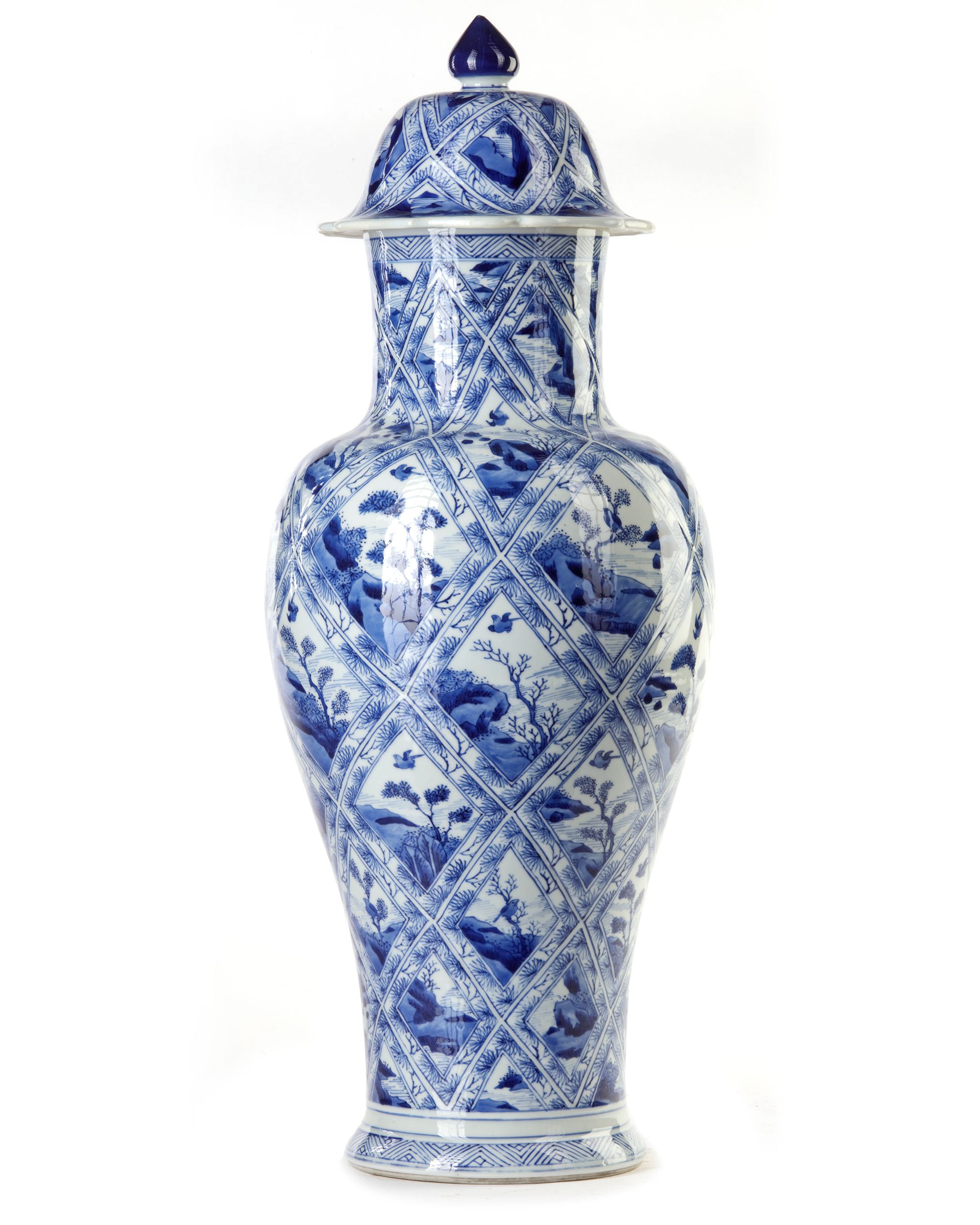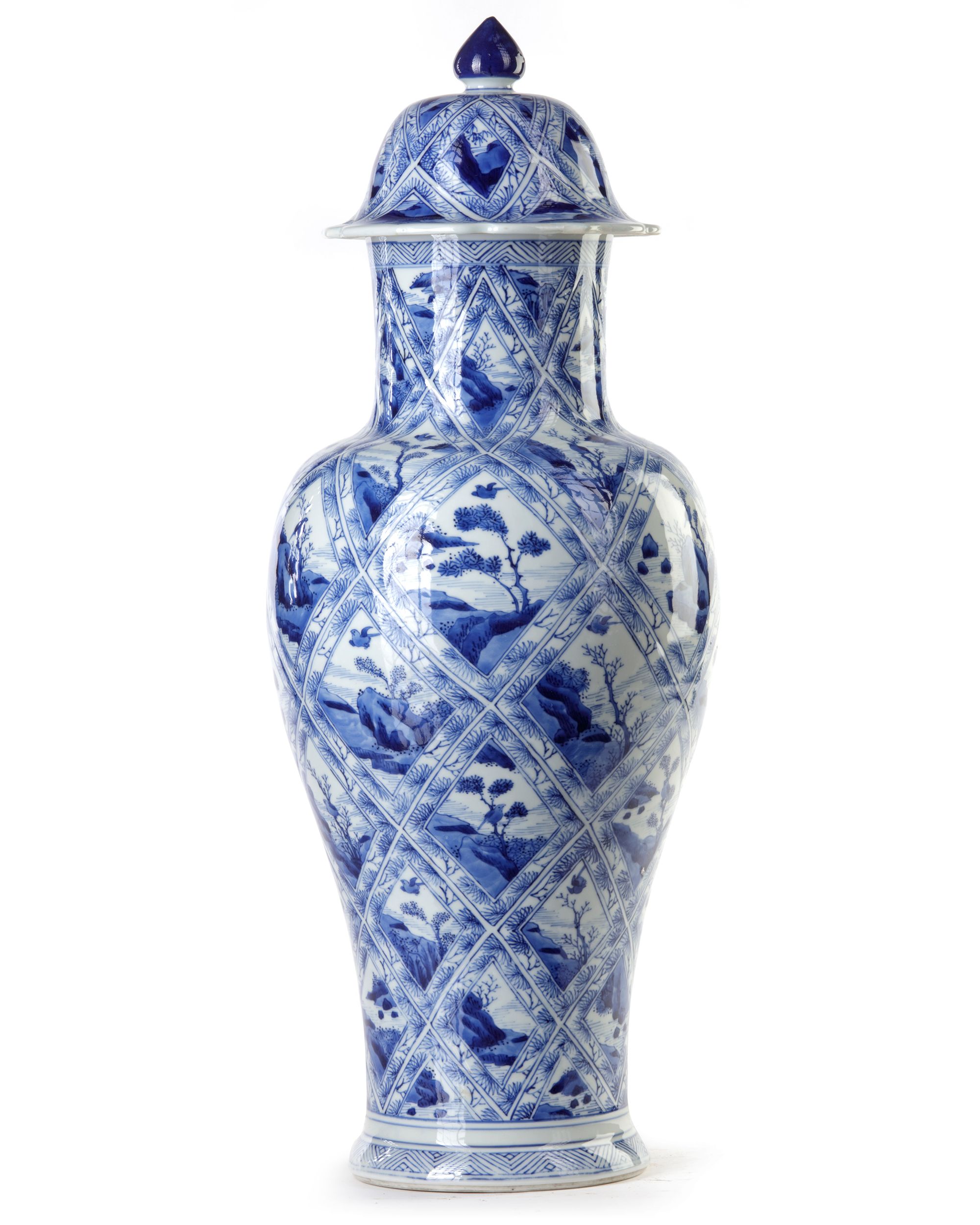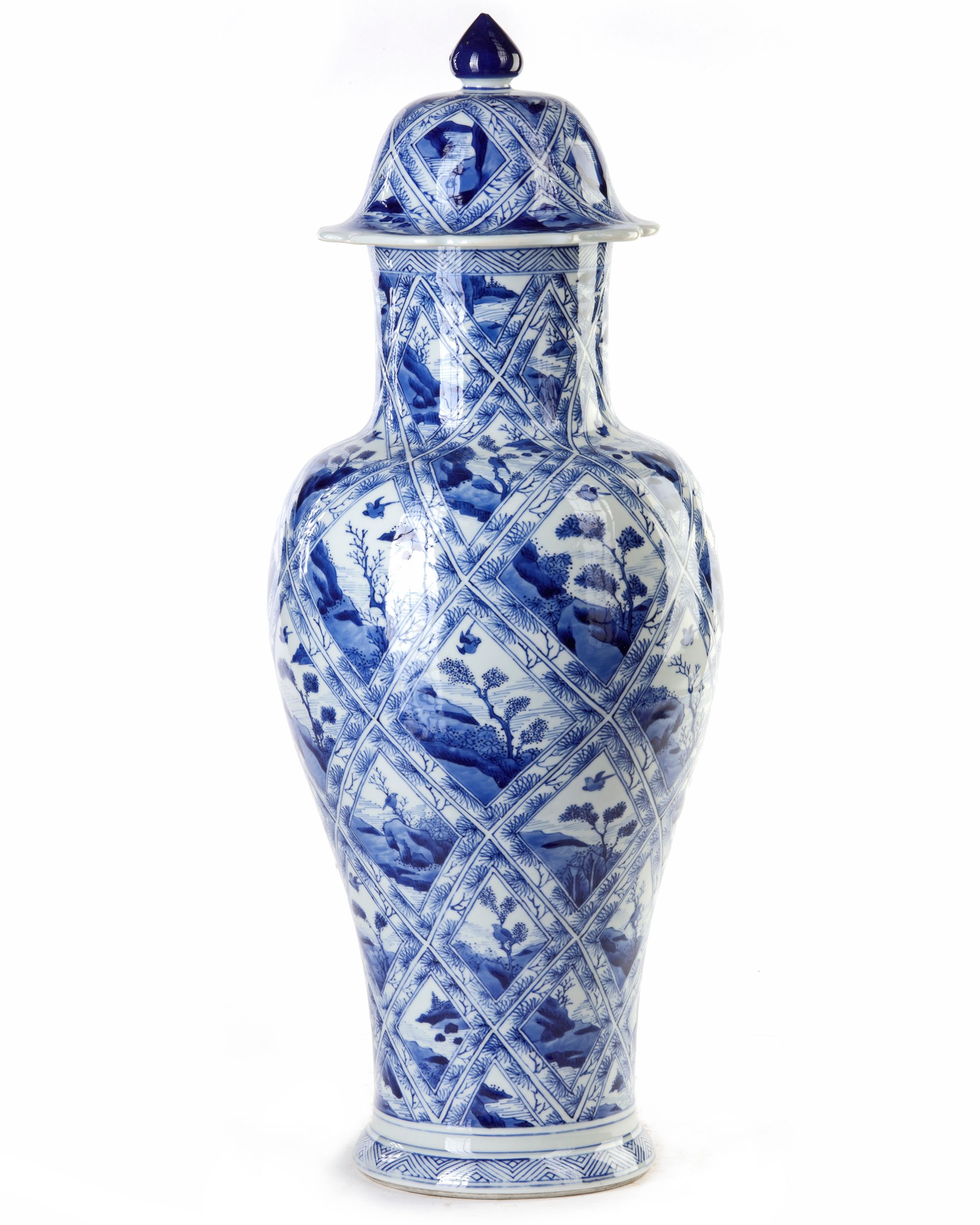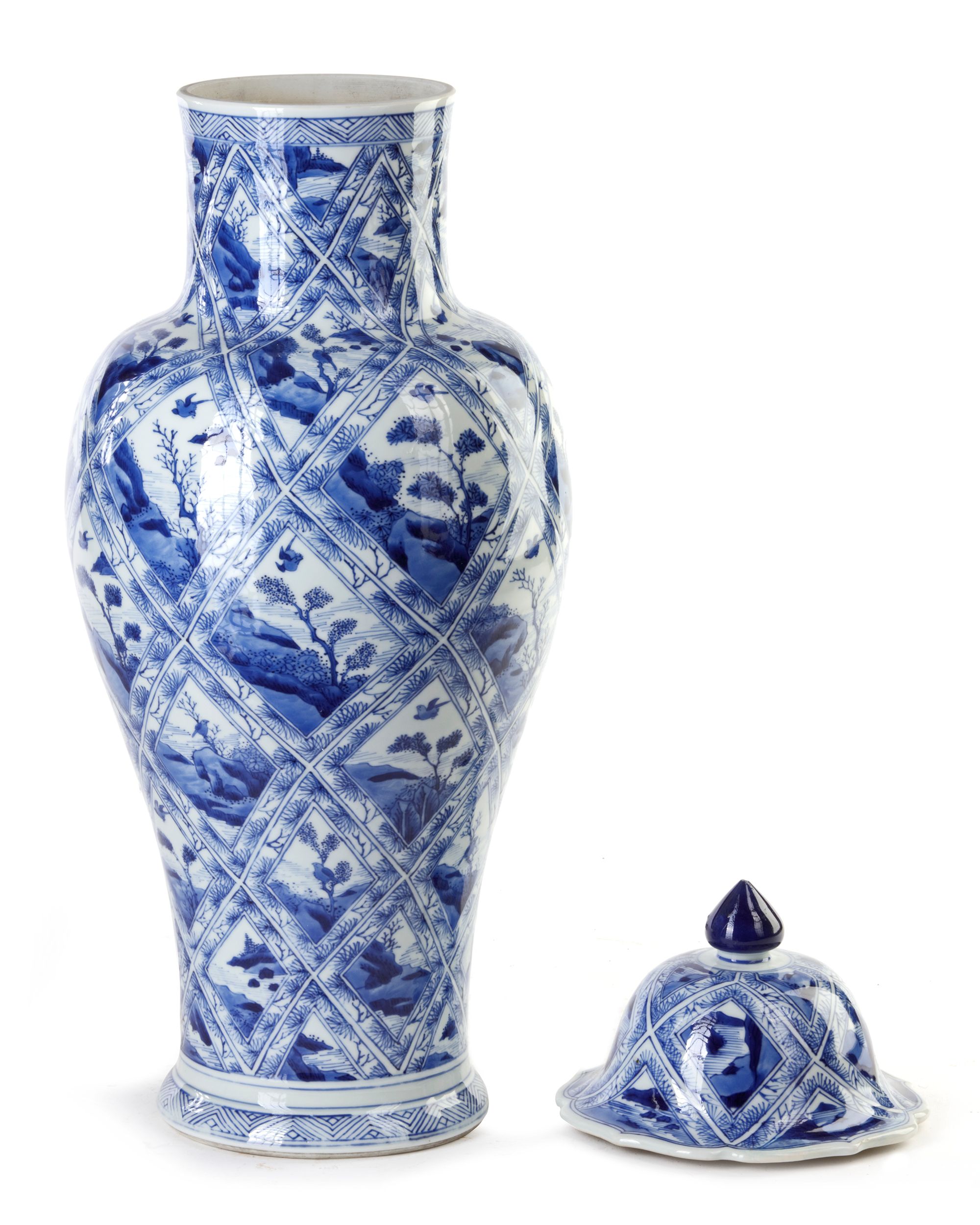 Painted with petal-shaped panels of landscapes alternating with flowering shrubs, the domed covers with knob finial. 56 cm.