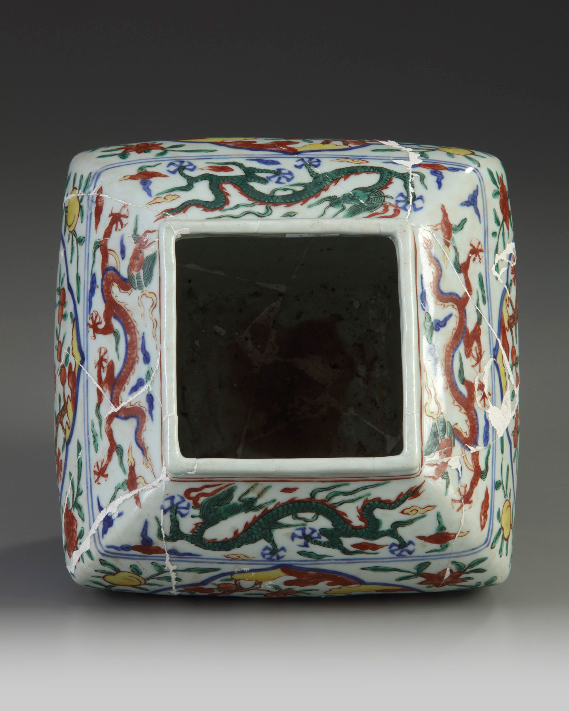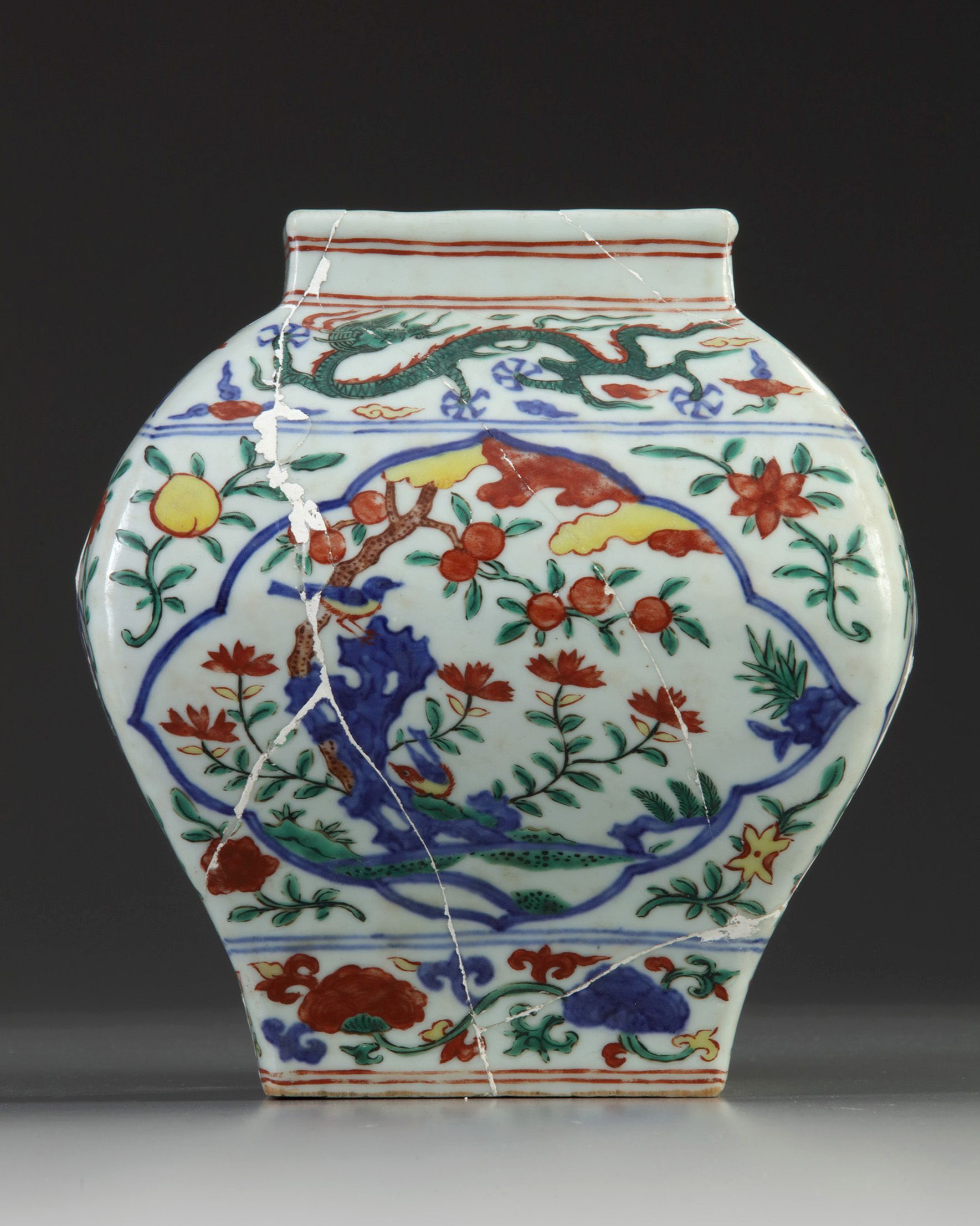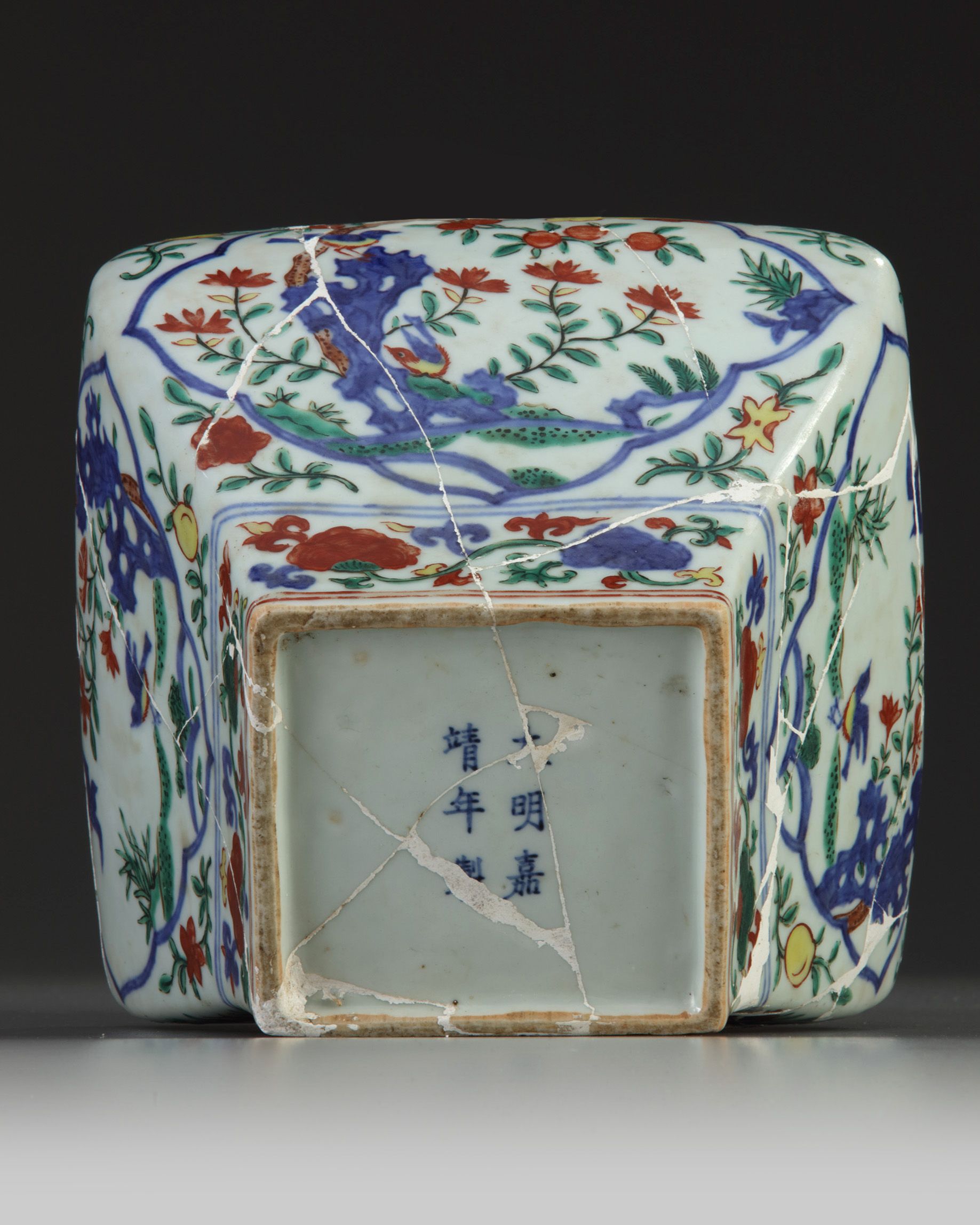 The jar is decorated to each side with a shaped panel enclosing birds and flowers, all surrounded by further flower and peach sprays. The shoulder is decorated with a band of striding dragons amongst clouds, and the foot is decorated with a band of scrolling lingzhi fungus. The base with a Jiajing six-character mark in underglaze blue.