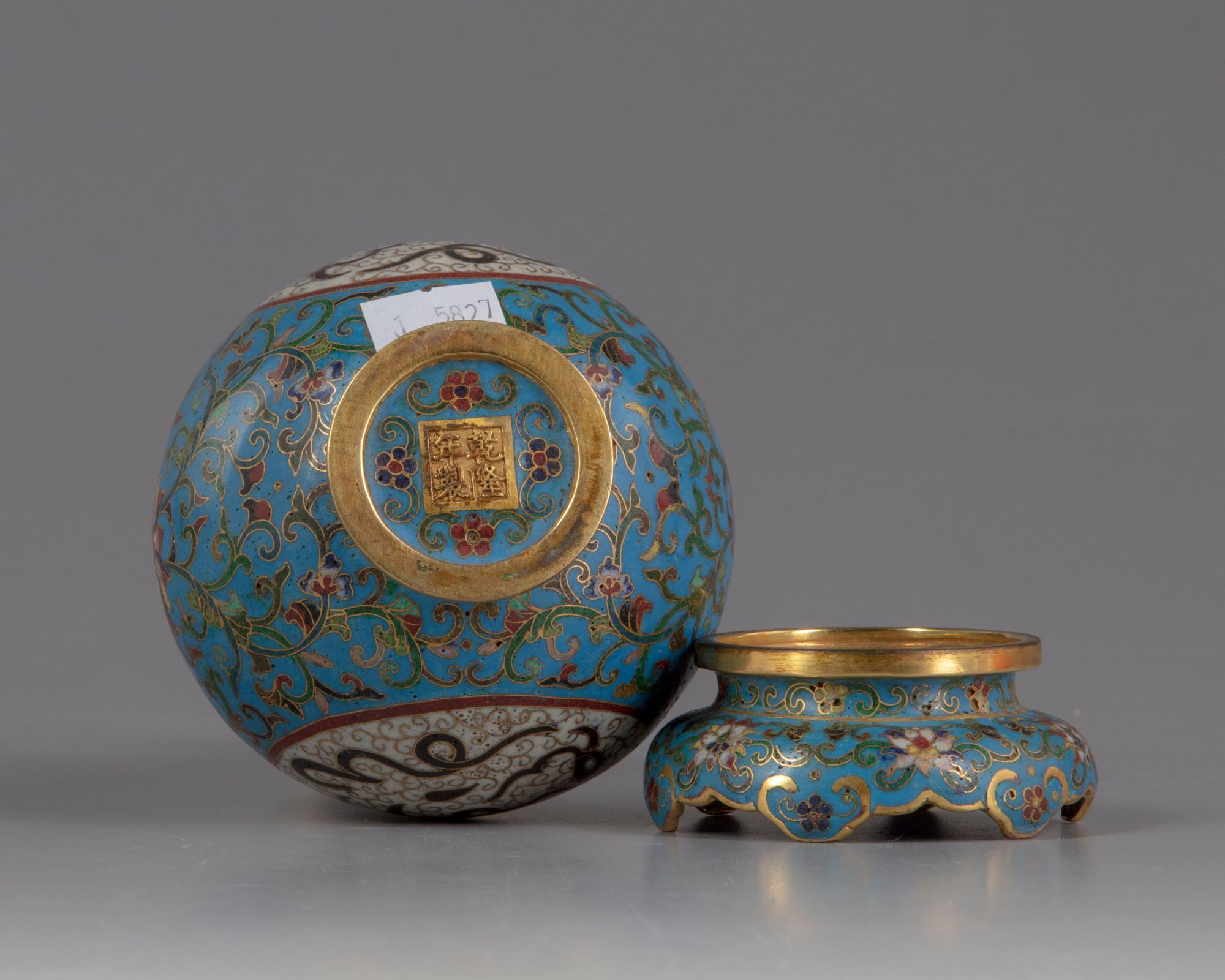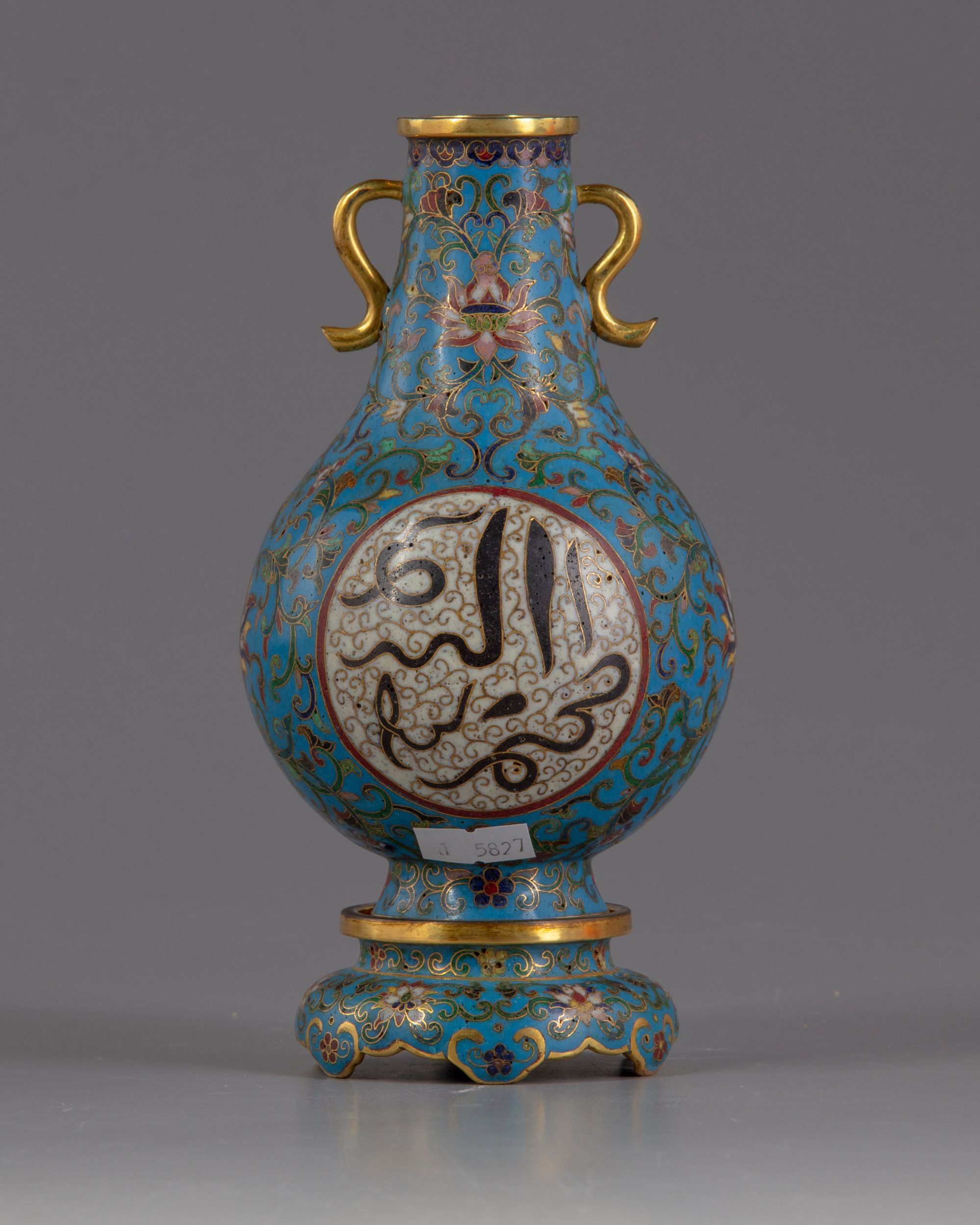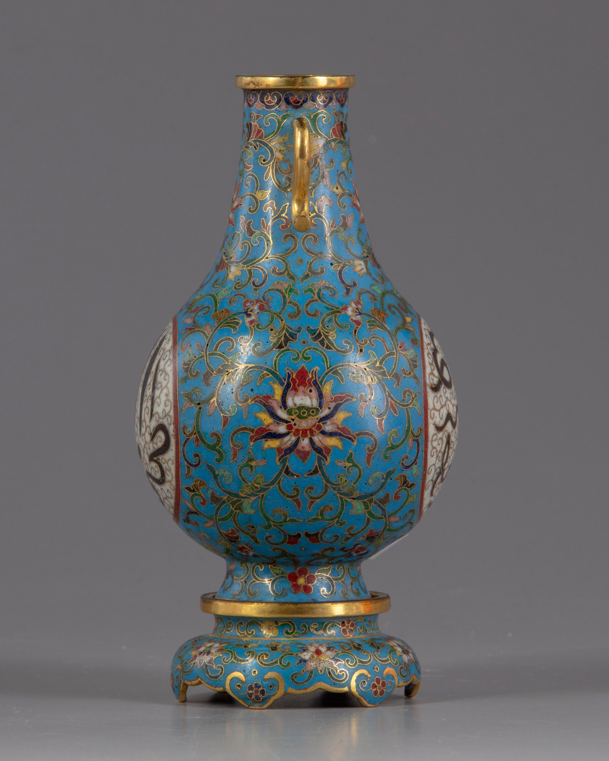 The vase is fashioned with two gilt-bronze handles, and decorated to each side with a shaped panel with script in Arabic surrounded by flower scrolls in a turquoise ground, the base with an apocryphal Qianlong mark. The stand is decorated with further lotus sprays and stands on ruyi feet.
