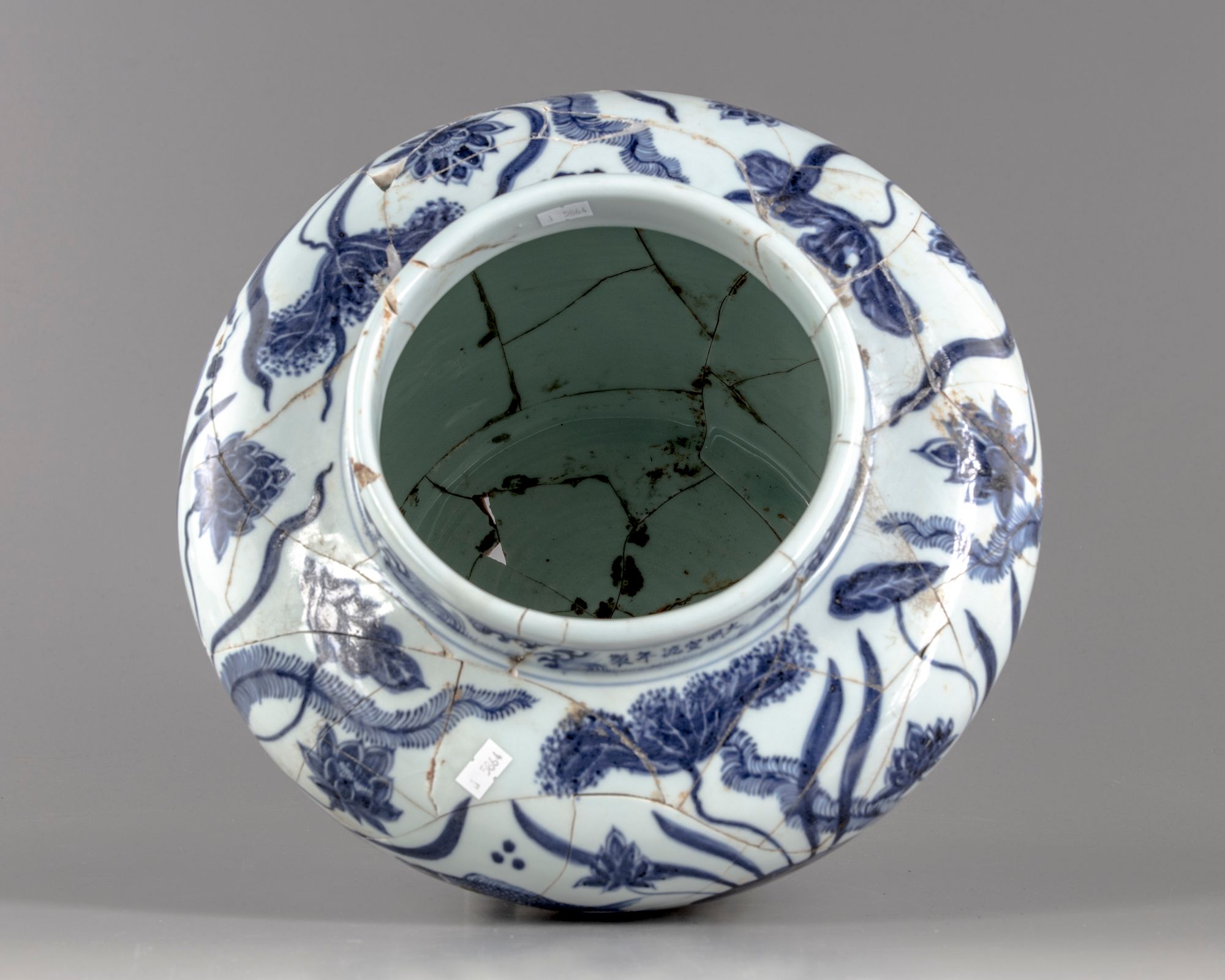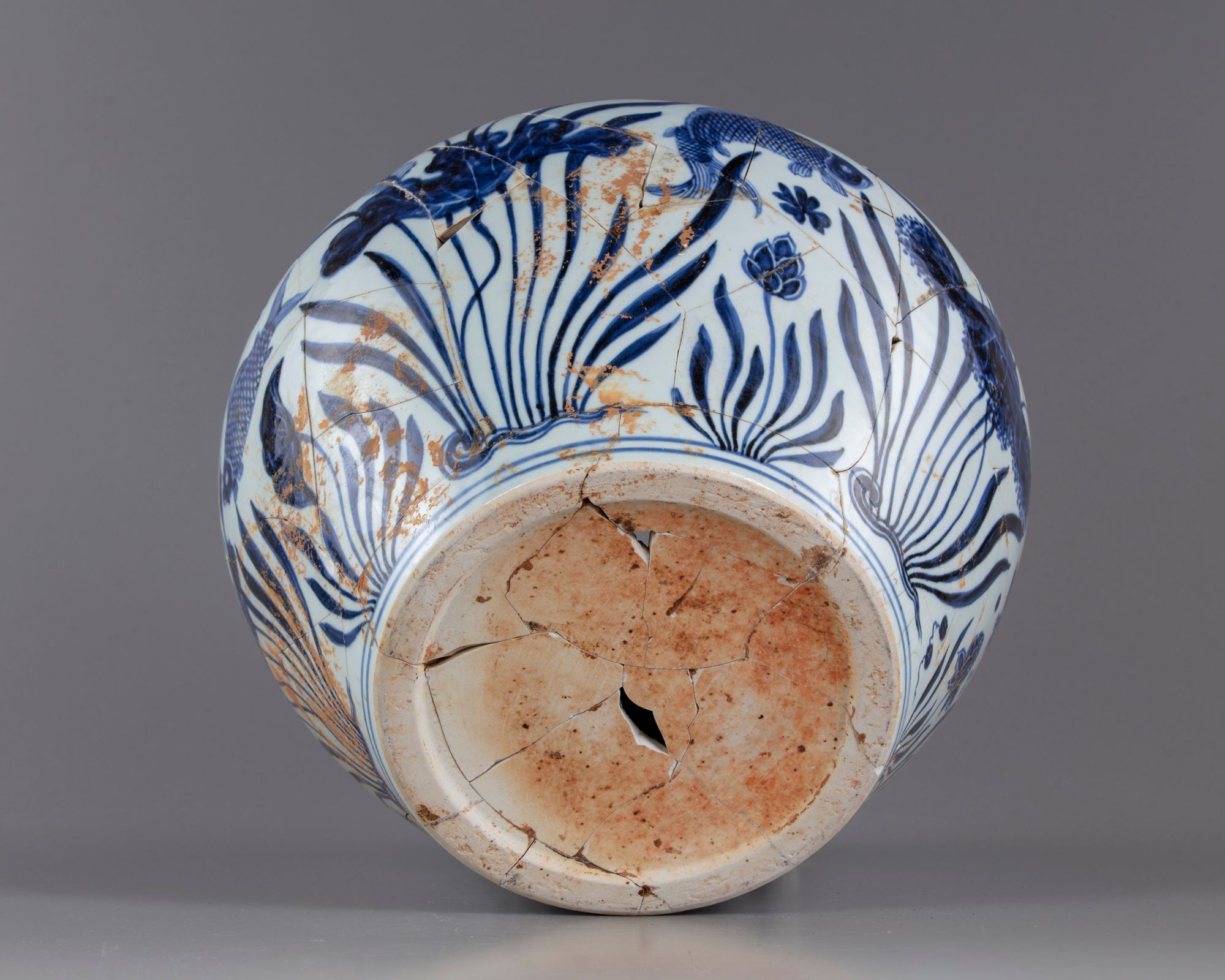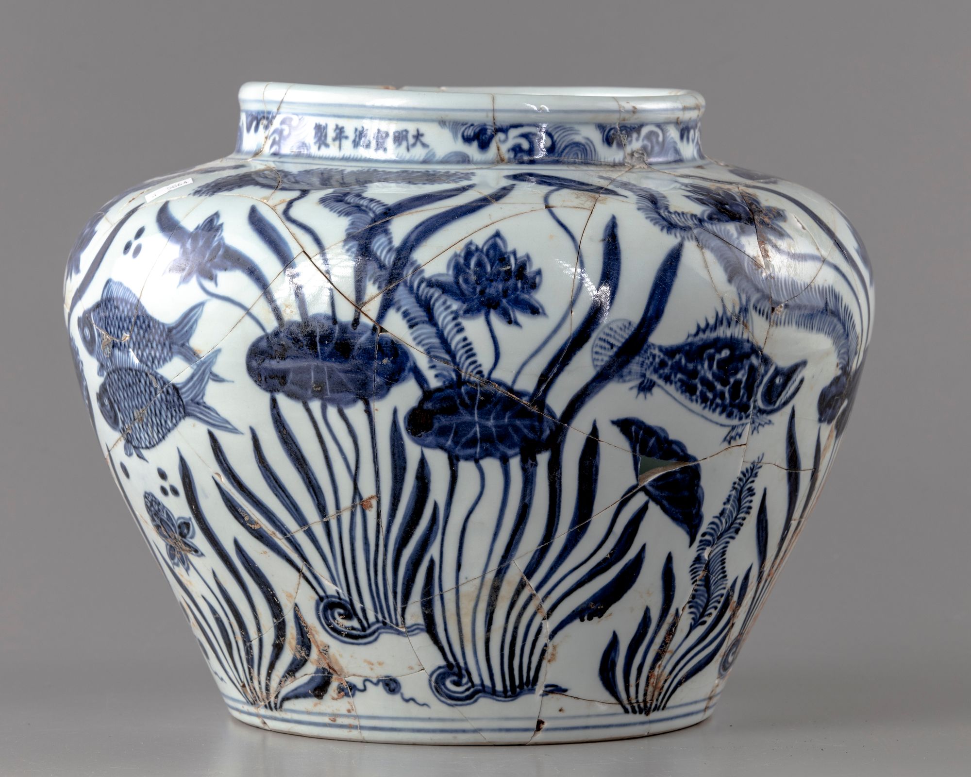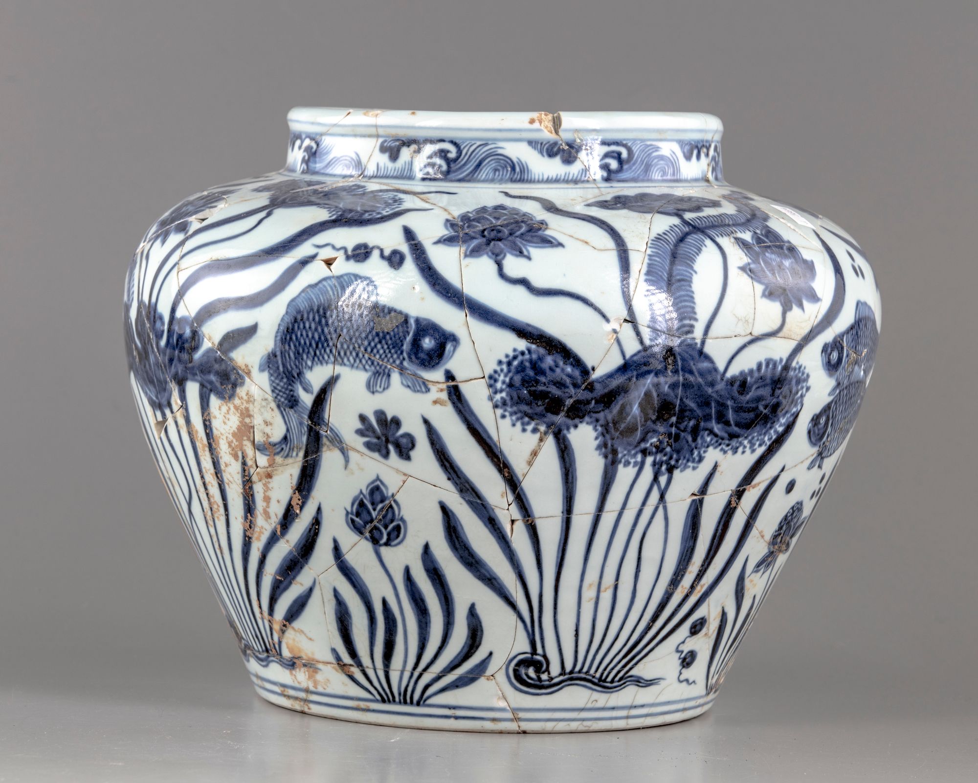A Chinese porcelain jar, deocrated in coblat-blue with fish amongst lake plants with a Chinese Xuande six character mark .
