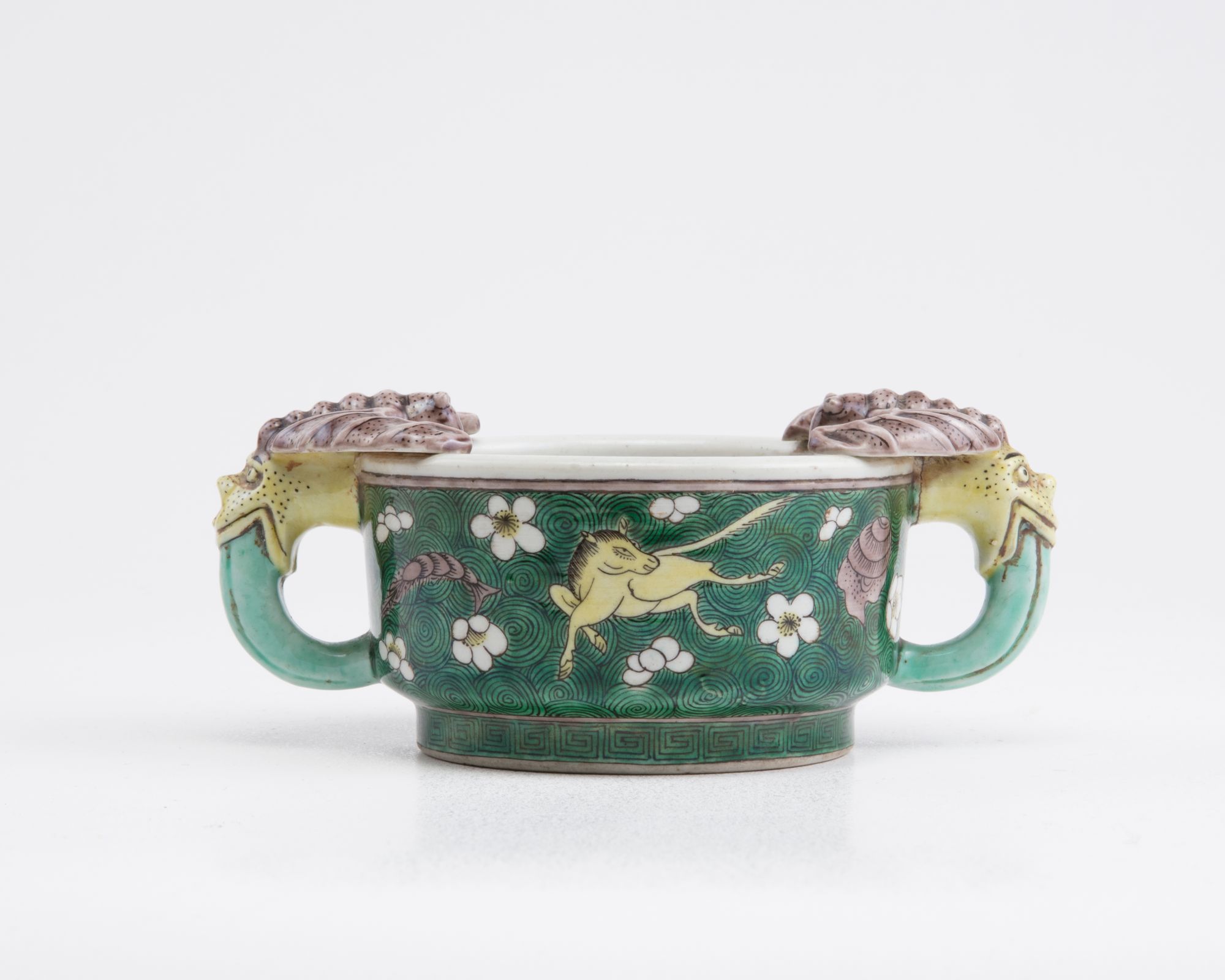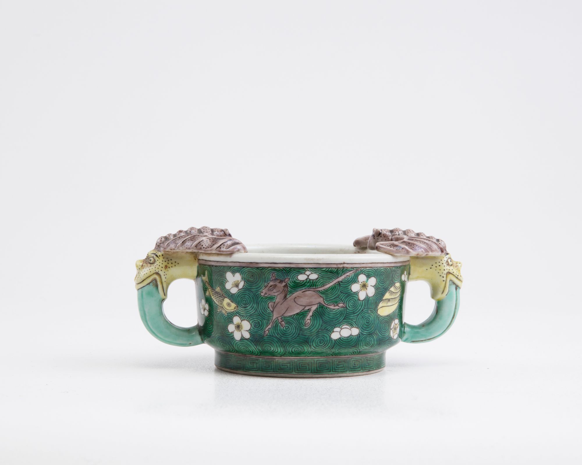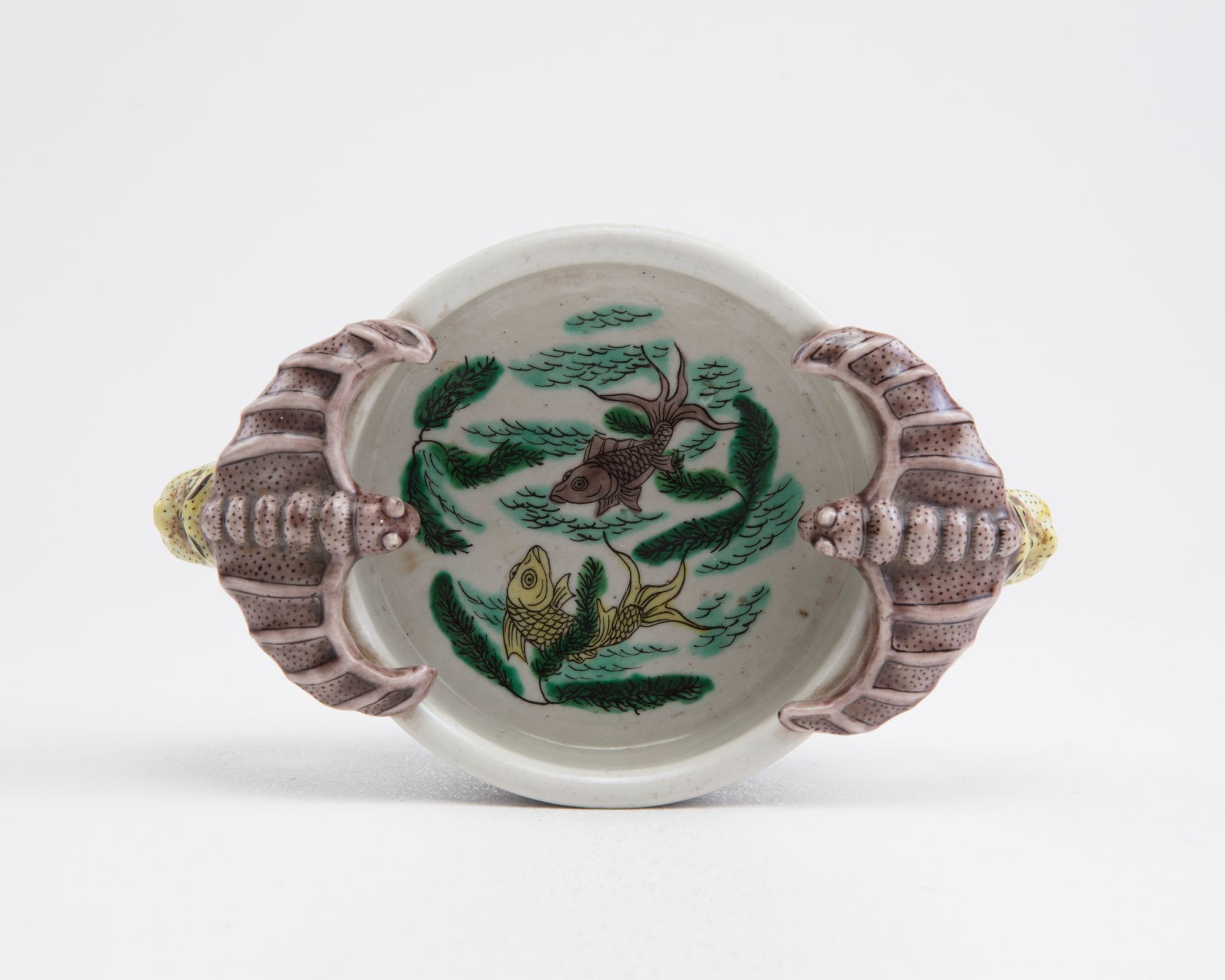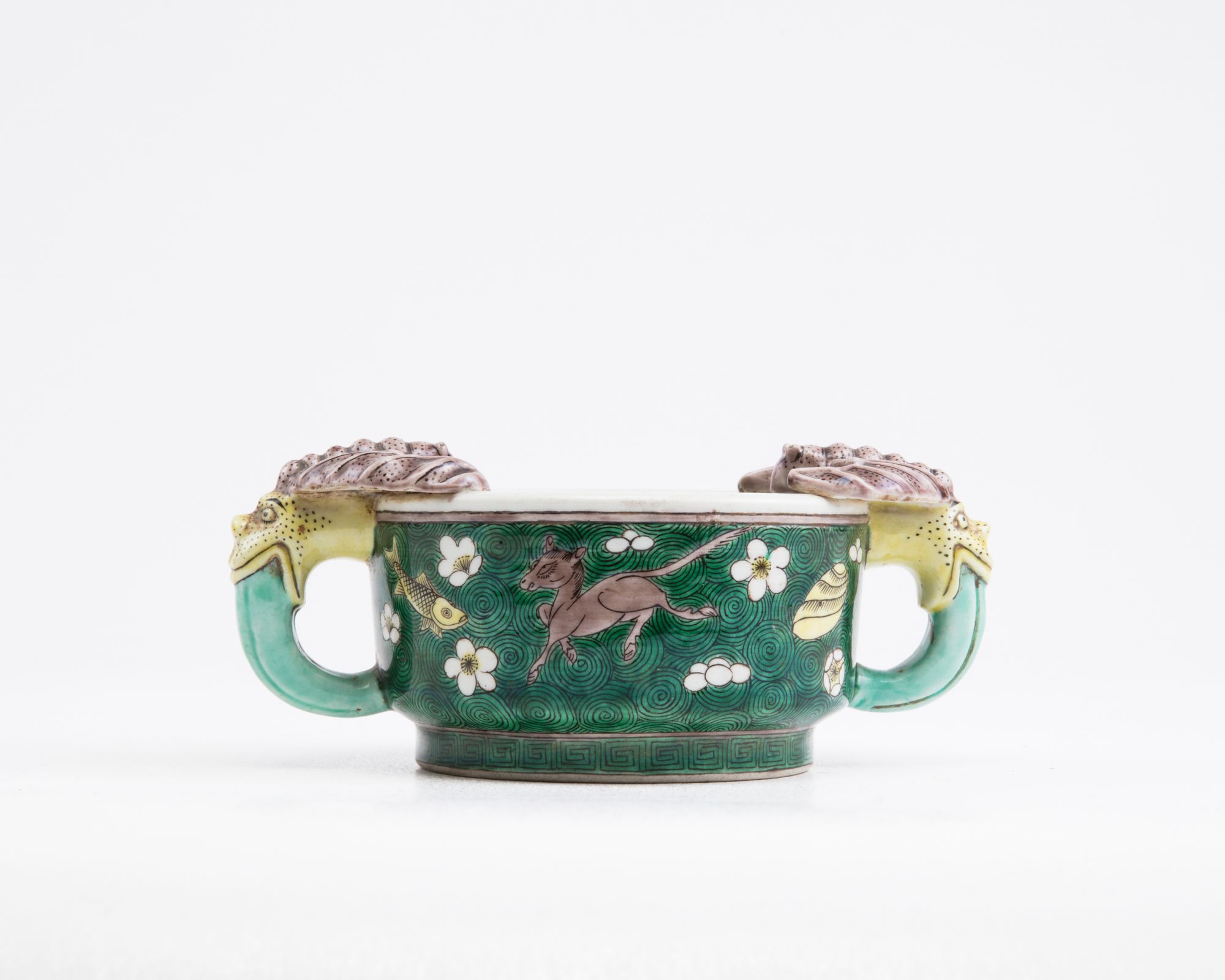 The censer is decorated with two moulded beast-head handles surmounted by bats. The exterior is decorated with horses and sea creatures amongst scattered prunus on a ground of foaming waves. The interior is decorated with carp.