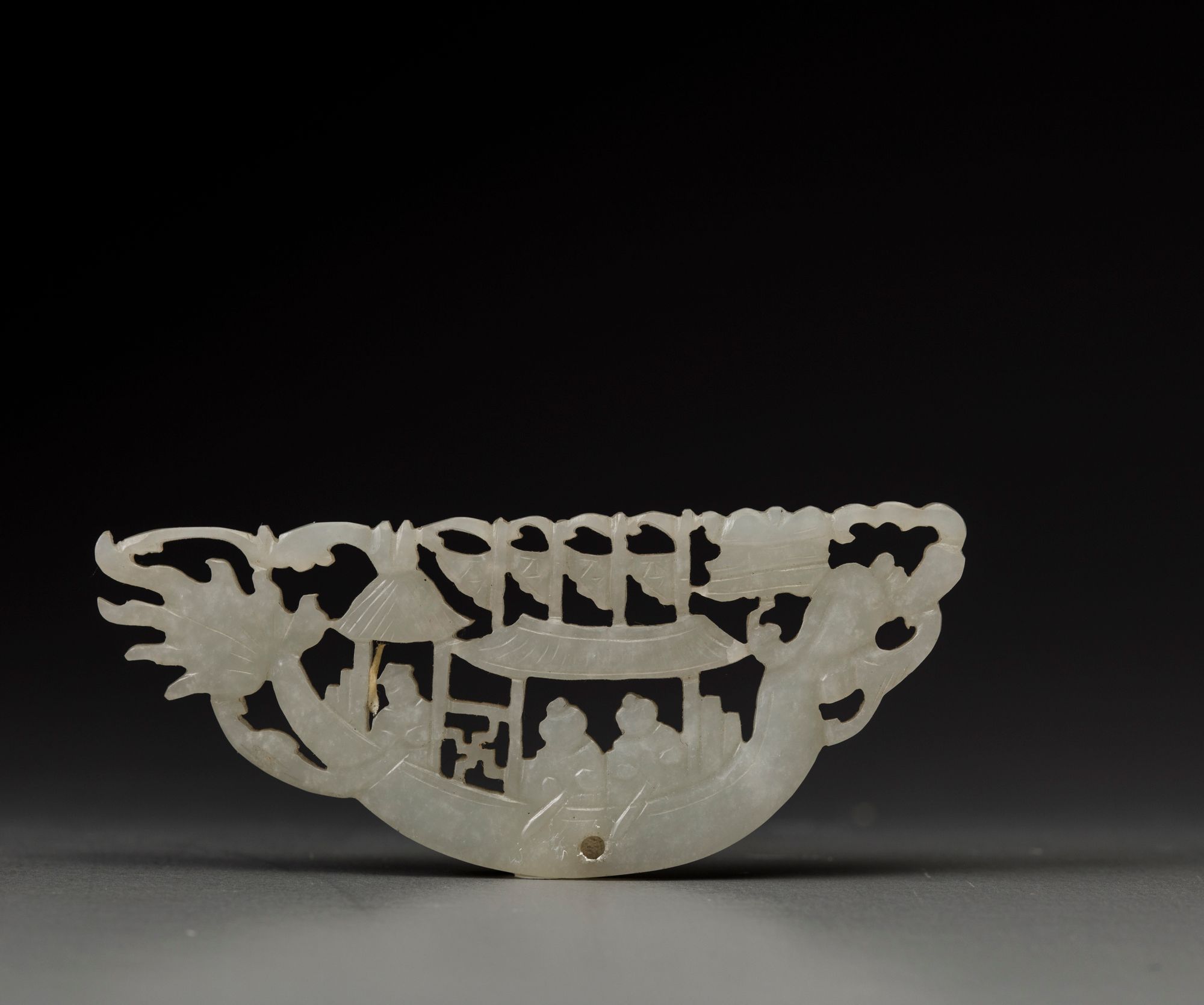 The plaque is carved in openwork as a festive dragonboat carrying three paddlers beneath a pavilion with flags waving above. The stone is of an even pale tone. With a wood stand.