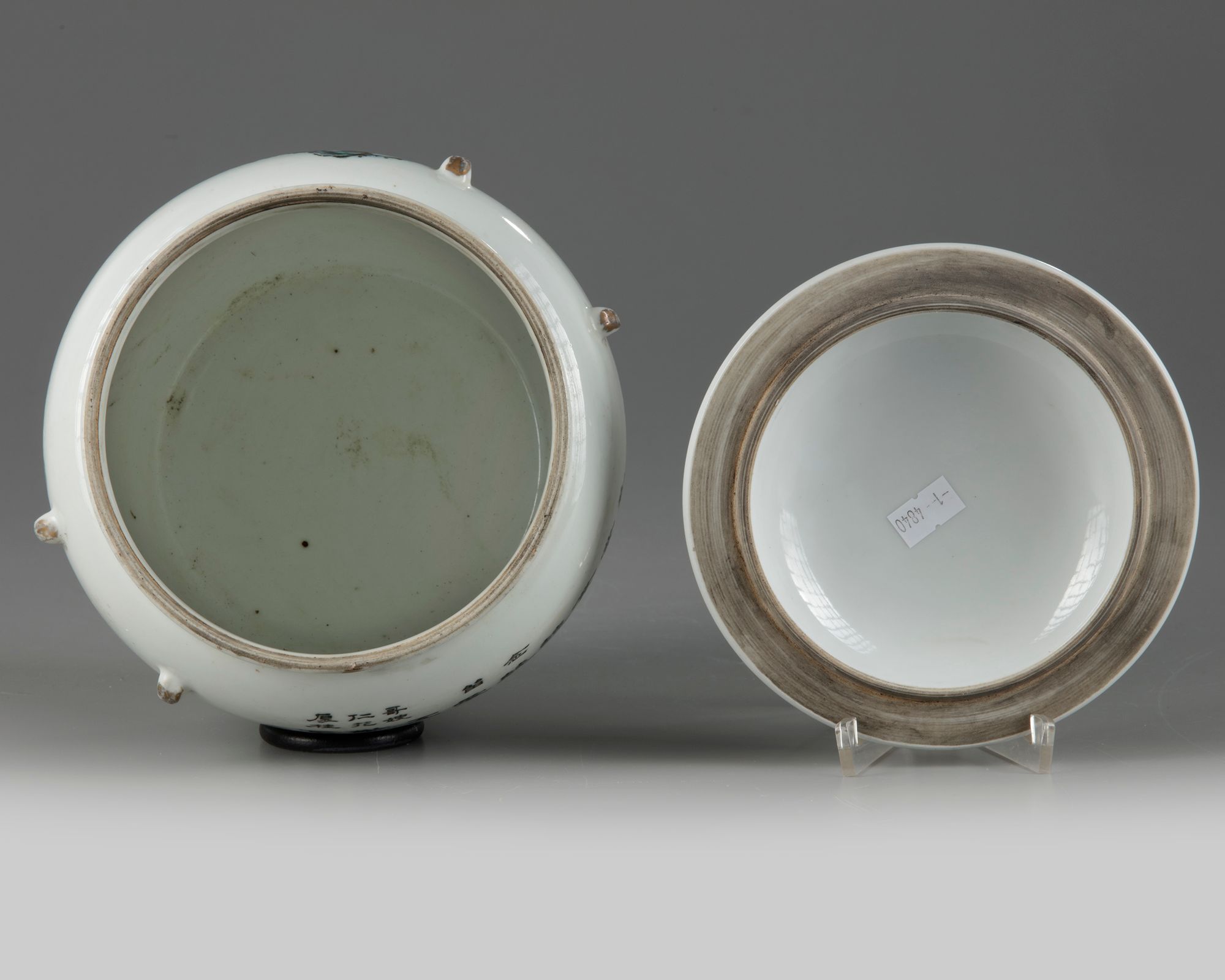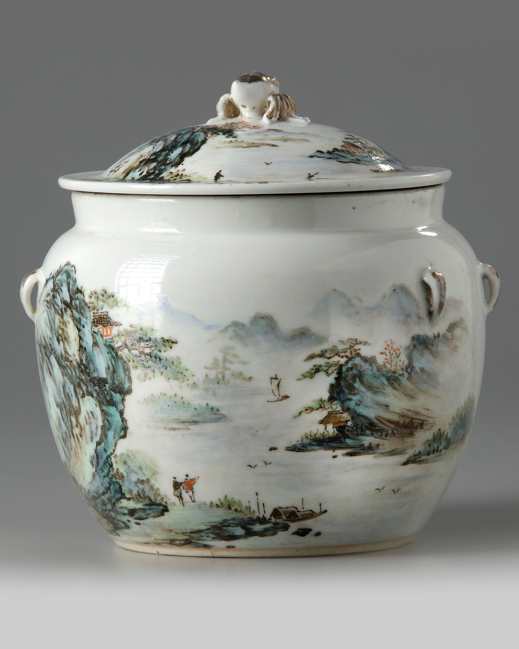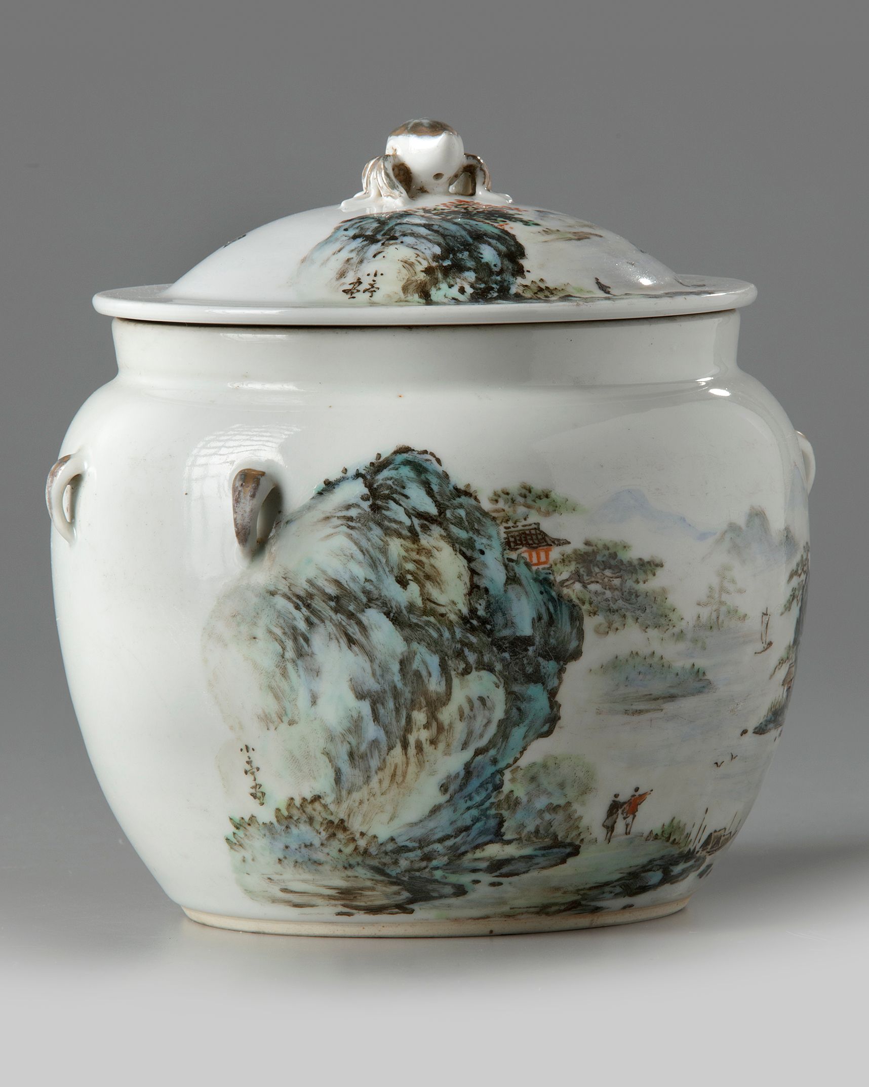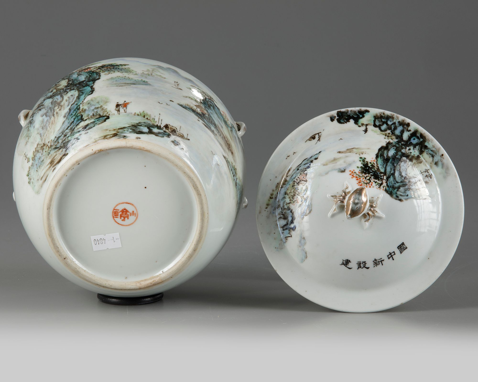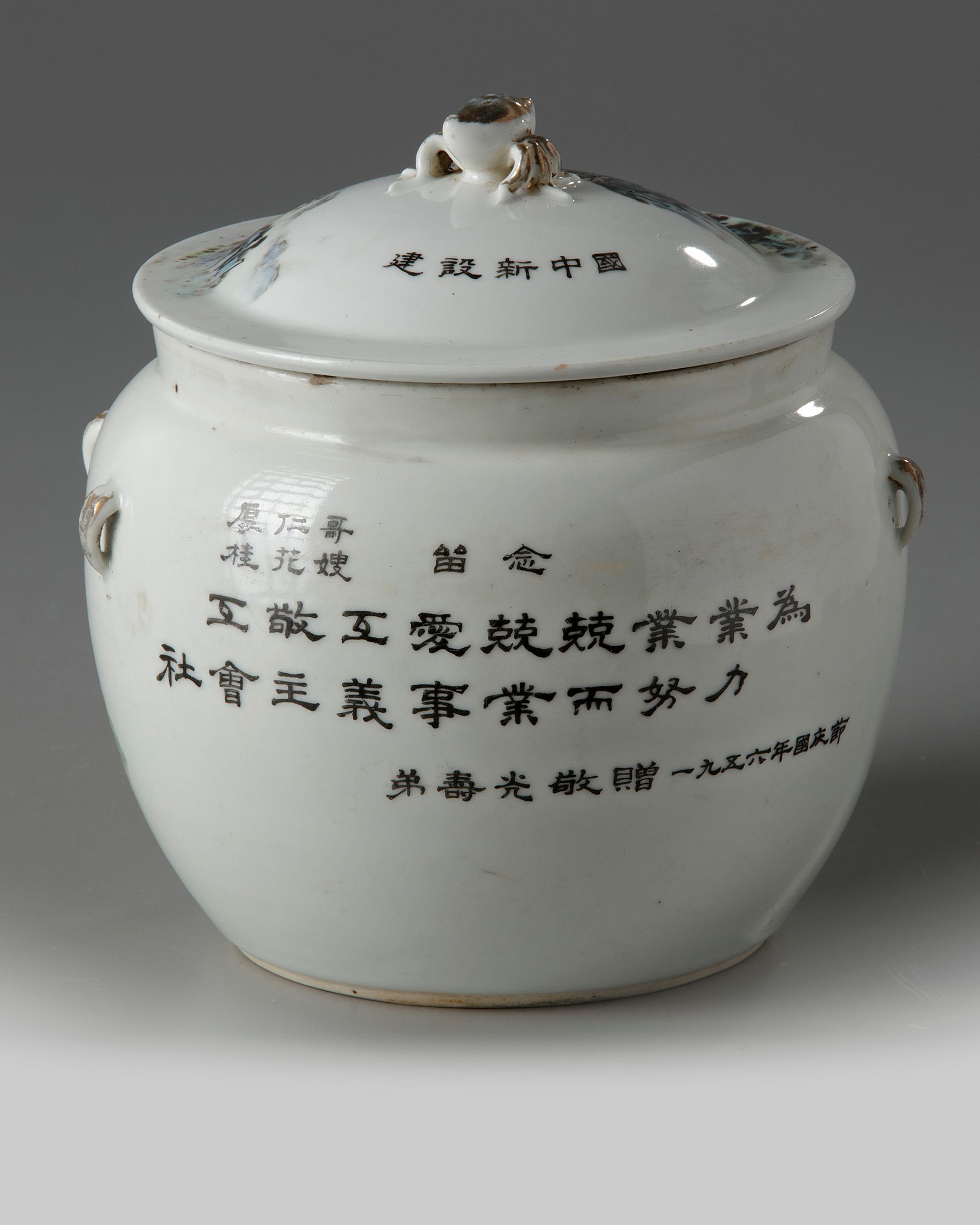 The pot is decorated to one side with figures in a river landscape scene, the reverse bears a Socialist inscription dedicated by Shou Guang and is dated 1956 on the National Day. The base bears a stamped mark reading 'Xiao Ting hua'. The cover is decorated with a similar scene and is inscribed 'Jianshe xin Zhongguo' (Building a new China), and is surmounted by a gilt peach finial.