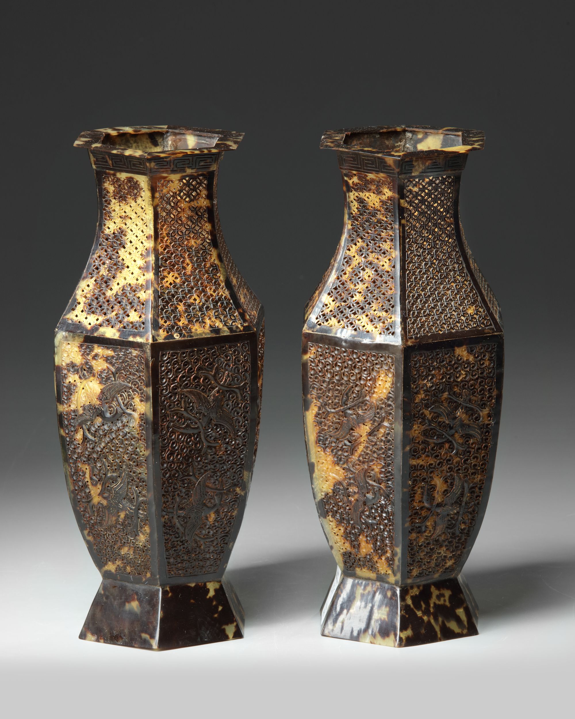 Two Chinese Tortoise Shell Carved Vase, with hexagonal form on a spreading foot and an everted rim, carved to each side with birds in different posture on a pierced ground with a key fret chain to the rim.