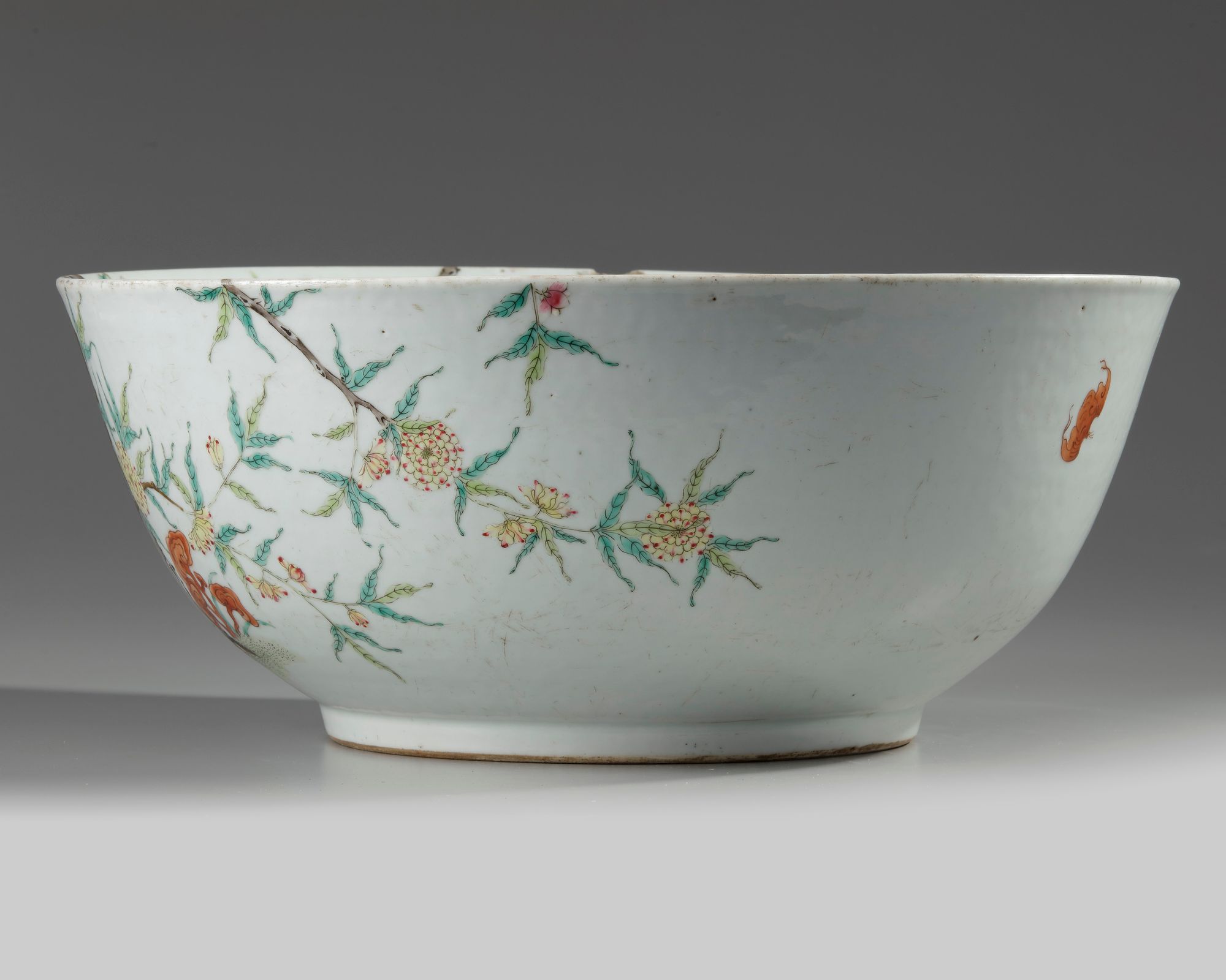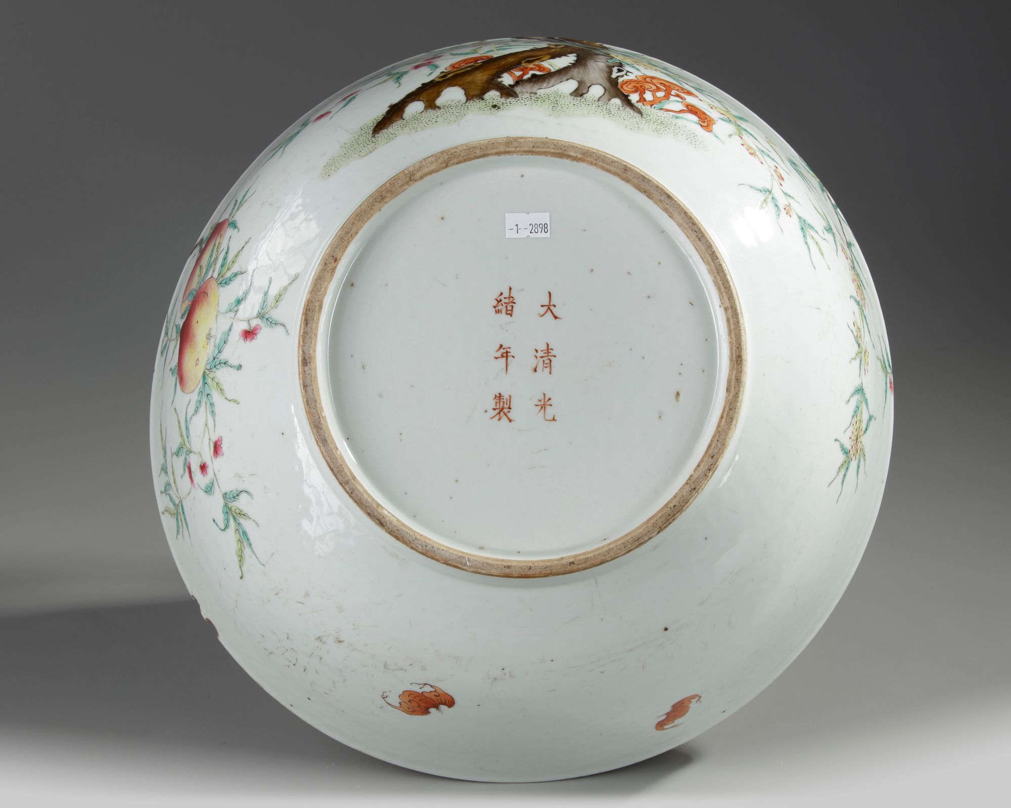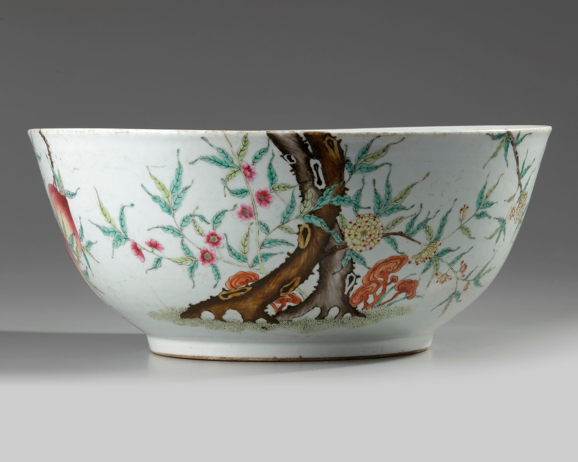 The bowl is enamelled with a large blossoming peach tree which stems from the foot beside lingzhi fungus, the gnarled branch climbs over the rim of the bowl into the interior, and bears nine fruiting peaches, all below iron-red bats in flights. The base is with a Guangxu mark in iron red.
